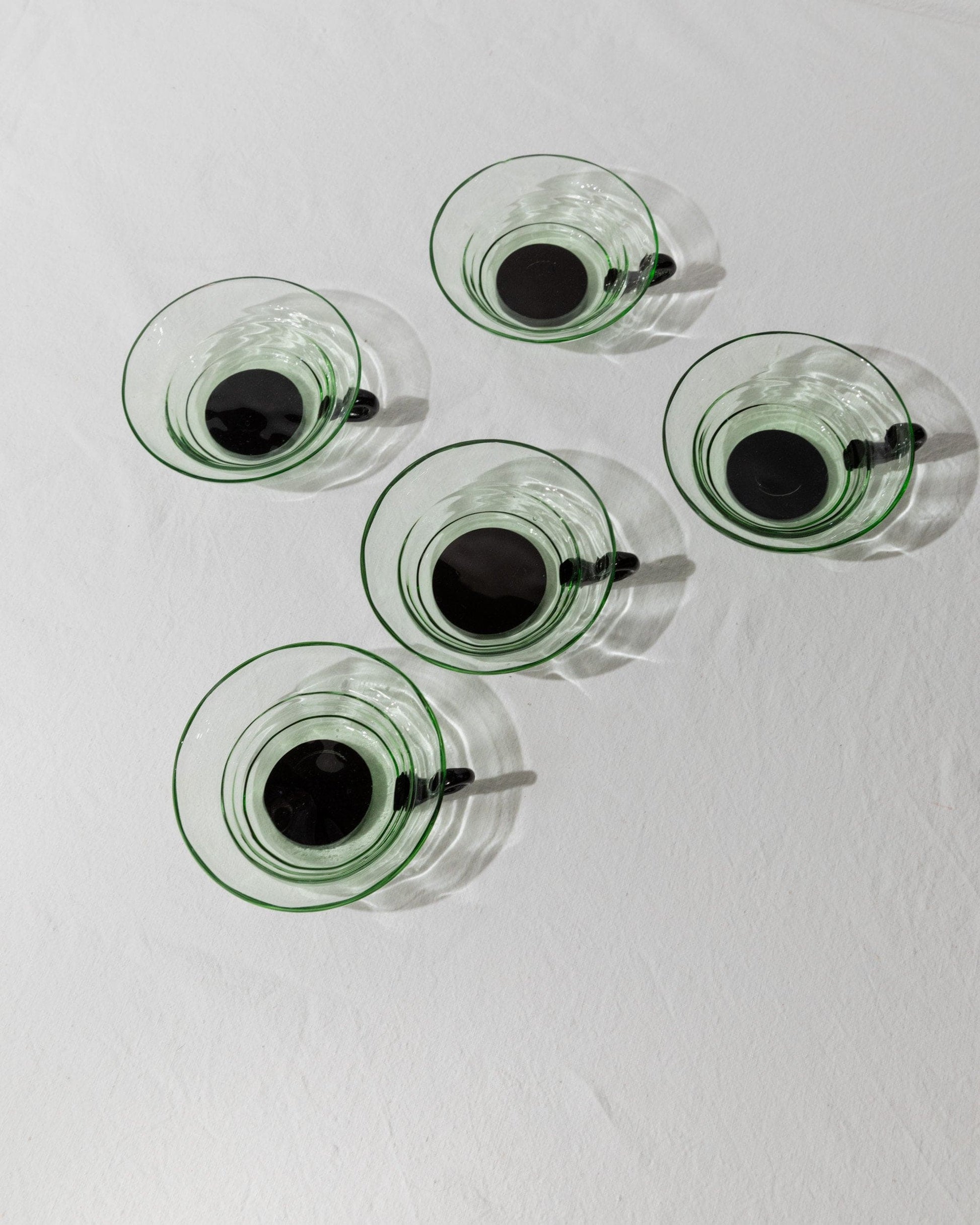 Add a touch of elegance to your table with this set of 5 vintage Murano glasses from the 1940s. Combining stylish green and black uranium glass, these timeless glasses from Italy are perfect for tea, cocktails or special occasions. Their classic design and exquisite craftsmanship make them a wonderful gift idea for vintage glassware lovers.