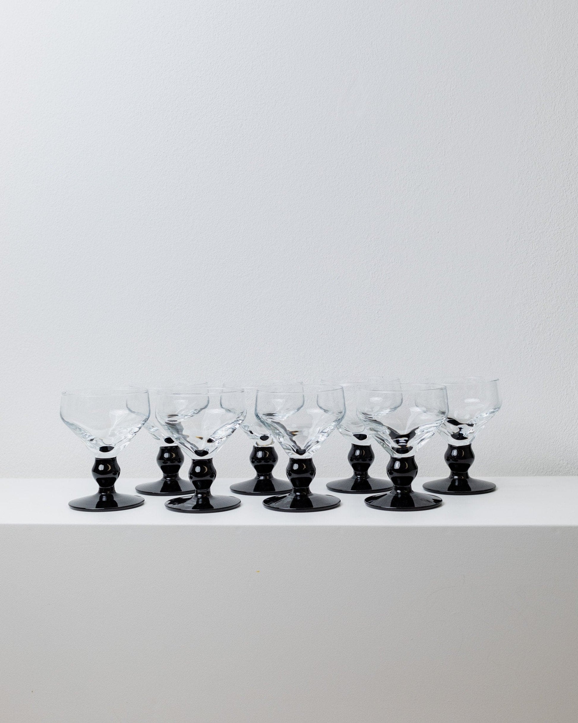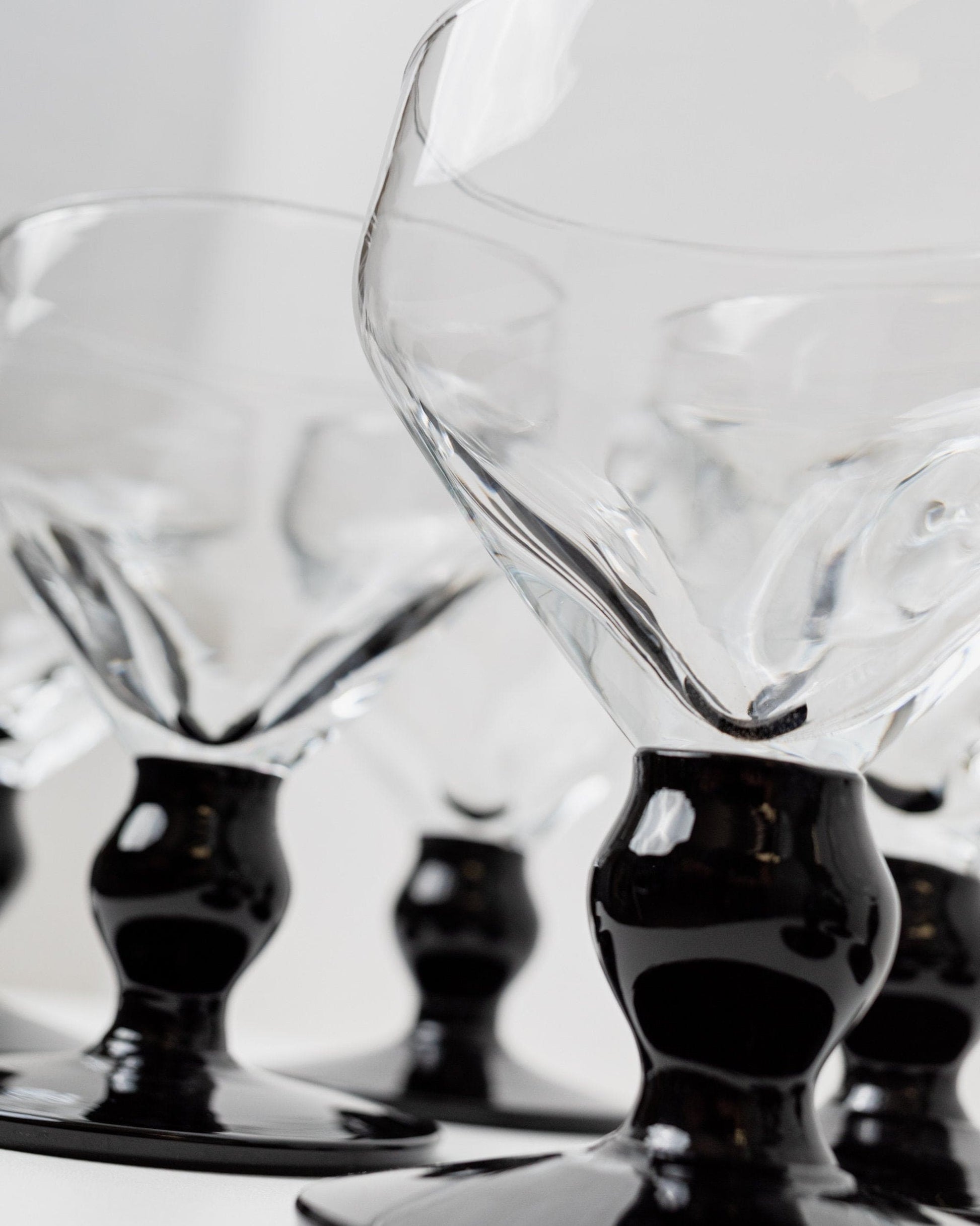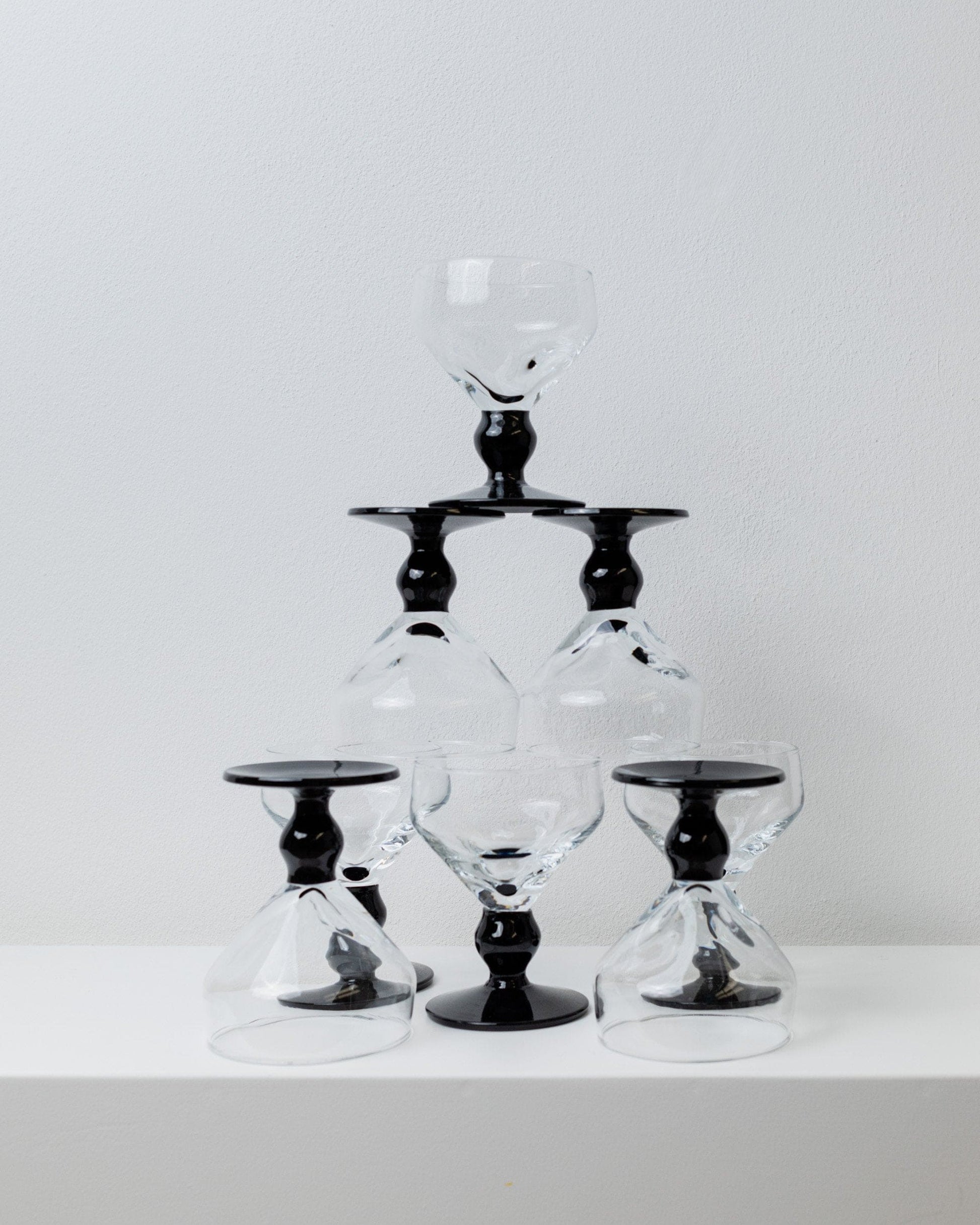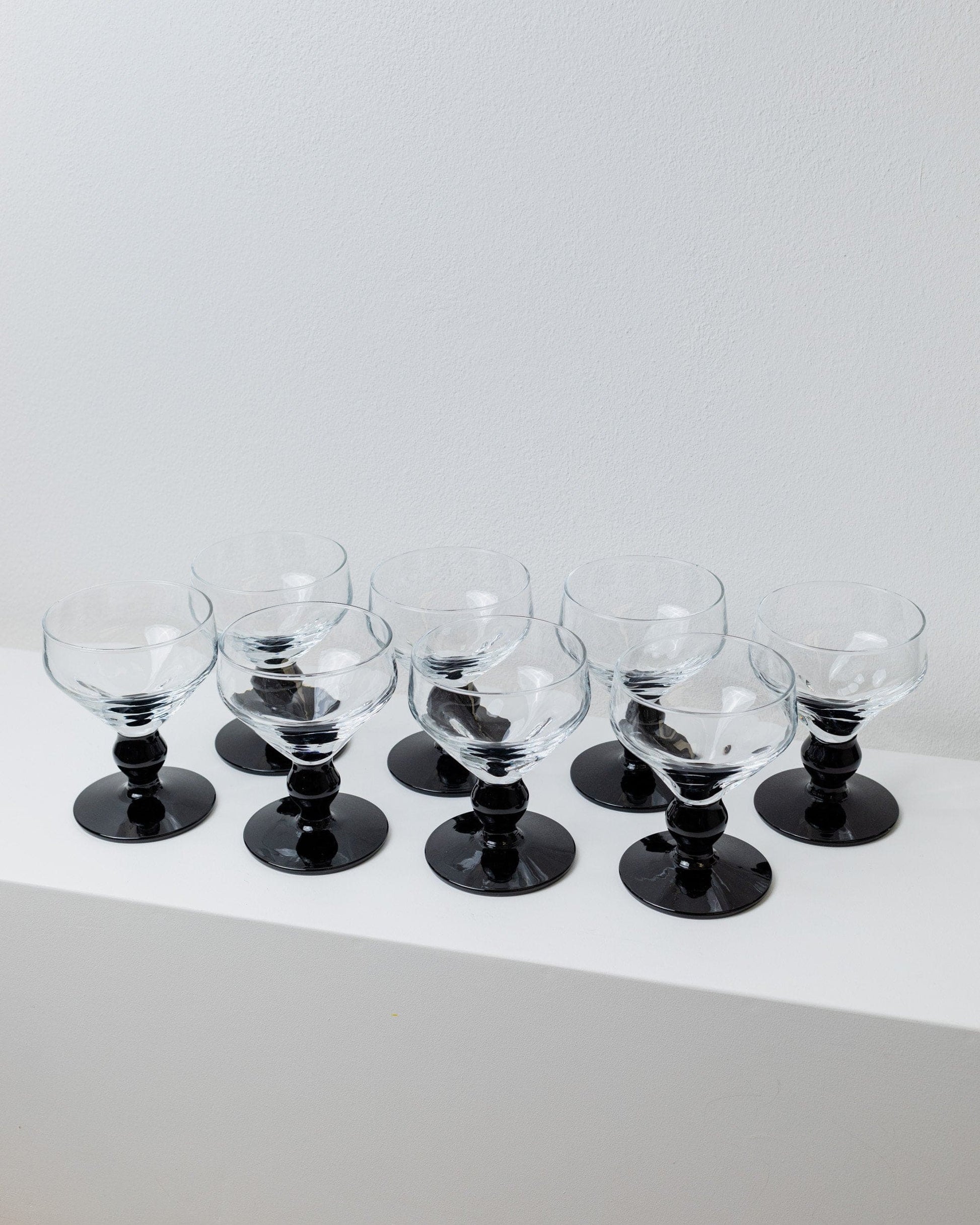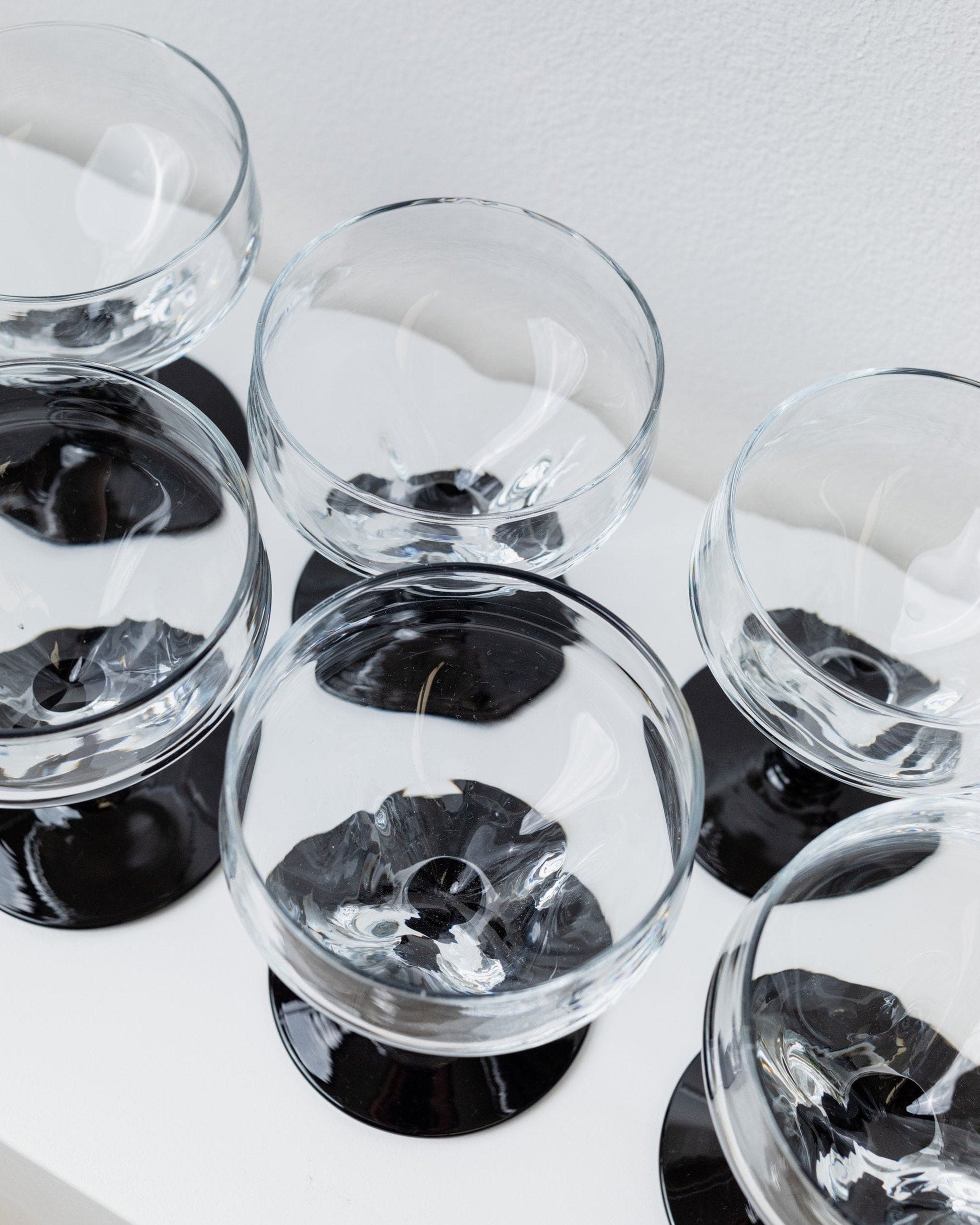These eight vintage Italian glasses from the 1980s are a perfect example of the postmodern Memphis style. With their versatile design, they can be used as wine, water or champagne glasses or even as ice cream bowls. The clean and black coloring adds a touch of elegance to any table arrangement.