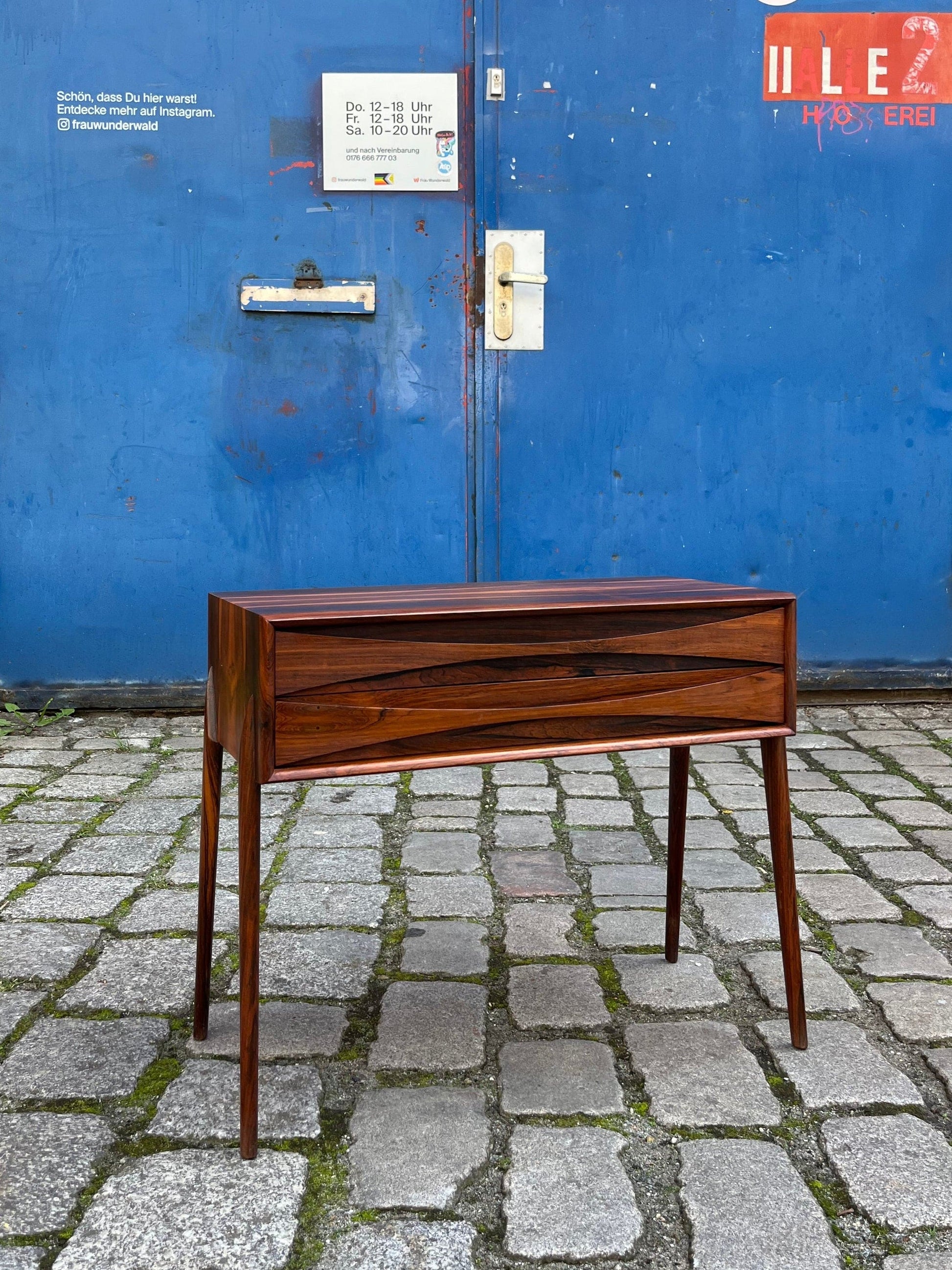 The side table model 6835 by Rimbert Sandholt for Glas & Trä combines Scandinavian modernity with timeless elegance. The design captivates with clean lines, delicate legs, and the warm radiance of fine rosewood. The high-quality craftsmanship ensures a pleasant feel and makes the table a stylish eye-catcher in any room. Thanks to its excellent original condition with only slight signs of wear, this piece of furniture is a true collector's item.