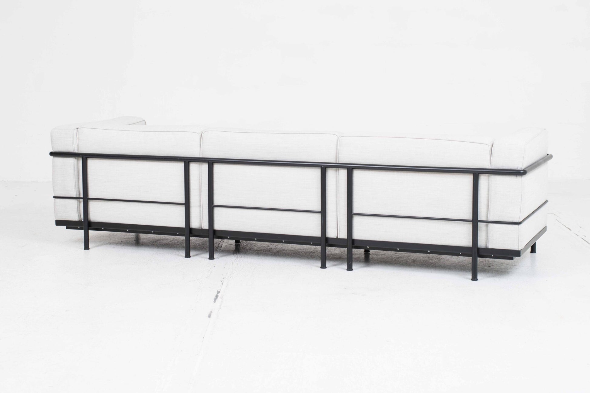 The Cassina LC3 sofa, designed by Le Corbusier, Charlotte Perriand, and Pierre Jeanneret, is an iconic example of vintage mid-century modern design. Since 1965, the renowned Italian manufacturer Cassina has exclusively produced the legendary LC series, known for its clean lines and timeless elegance. The LC3 sofa, also known as the "Grand Confort," impresses with its generous proportions and characteristic loose cushions. The combination of a black lacquered steel frame and gray fabric seat cushions gives this Space Age classic a modern, stylish appeal.
