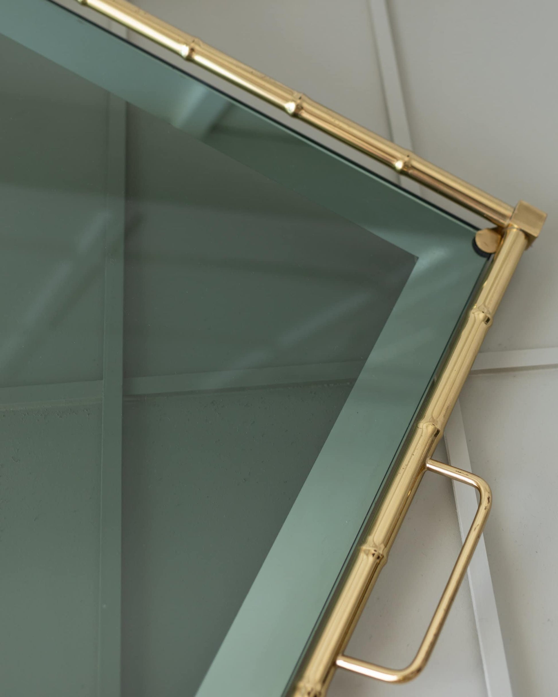 Discover the timeless flair of the 1960s with this exquisite vintage tray in bamboo design. Made in Italy, it combines the elegance of Hollywood Regency style with the functionality of a versatile home accessory. The gold-plated frame in bamboo structure and the mirrored smoked glass on the sides make this tray a real eye-catcher. Whether as a stylish transport aid for fine tableware or as a decorative storage space for jewelry and decorations - this tray adds a touch of luxury to any room.