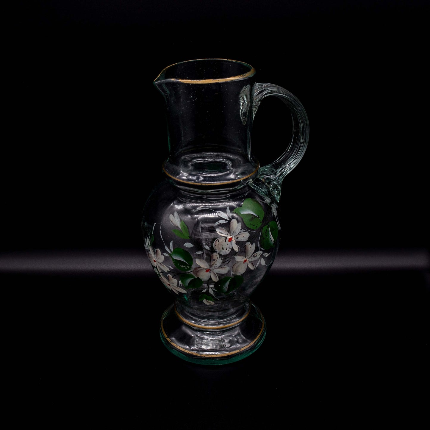 The exquisite, large glass jug dates from around 1850. It was hand-made and painted with floral motifs. It is characterized by its incredibly beautiful shape and lovingly designed details, for example on the handle. Its age-related patina gives it a unique vintage charm.