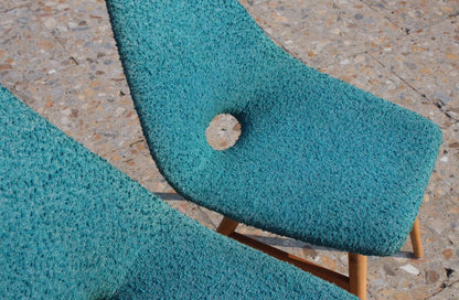 These chairs embody the Mid-Century Modern aesthetic with their vibrant turquoise upholstery and appealing texture. The original fabric upholstery has stood the test of time beautifully and is a testament to careful care and preservation.