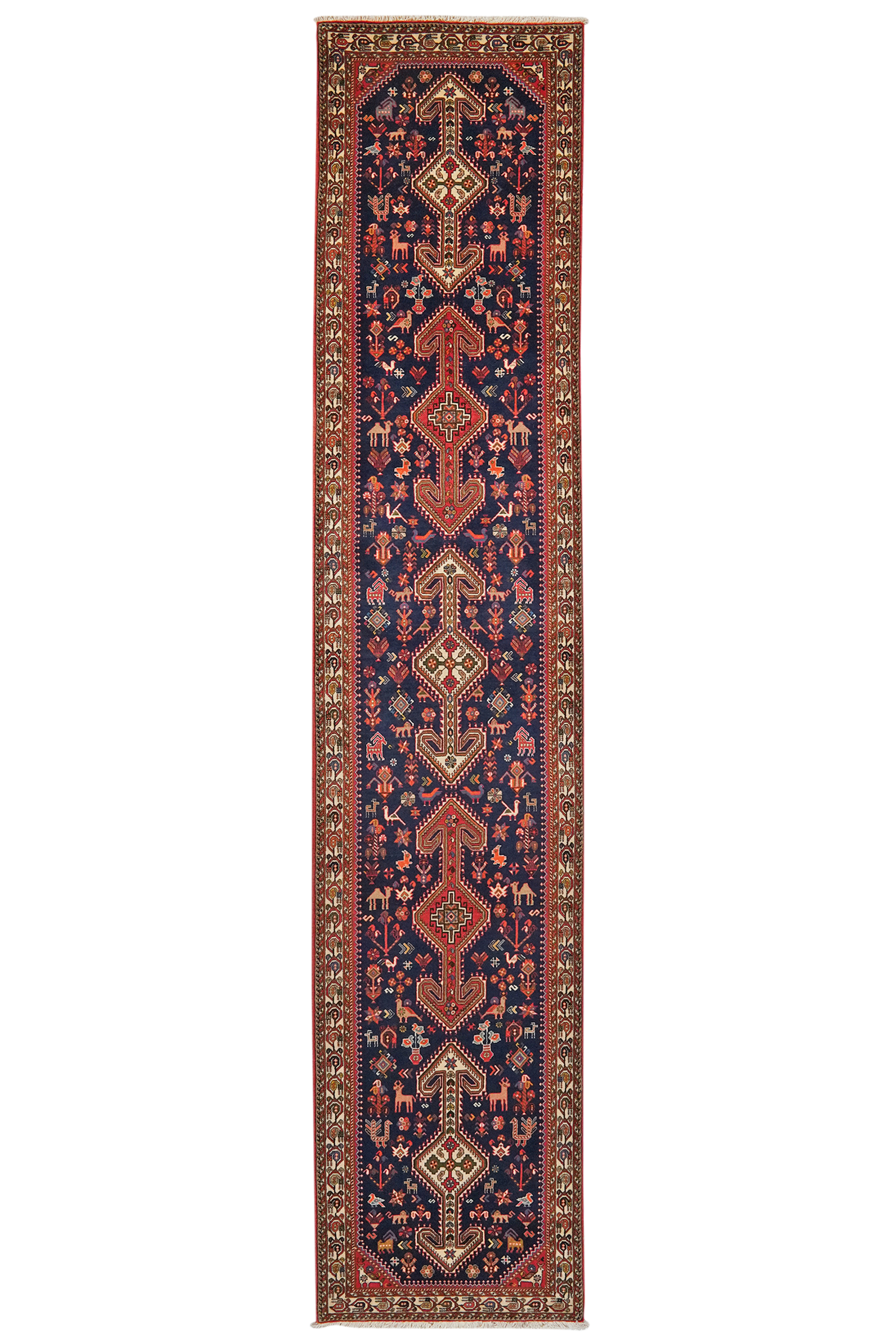 The Nasrabad Vintage rug in size 398x83cm is an expression of master craftsmanship and cultural history. These rugs are known for their dense knotting and the use of hand-spun wool, which gives them a unique texture and durability. The designs are often inspired by the nature and lifestyles of the Gashgai and Lori nomads who make these rugs. They are not only decorative but also functional, as they bring warmth and comfort to any room.