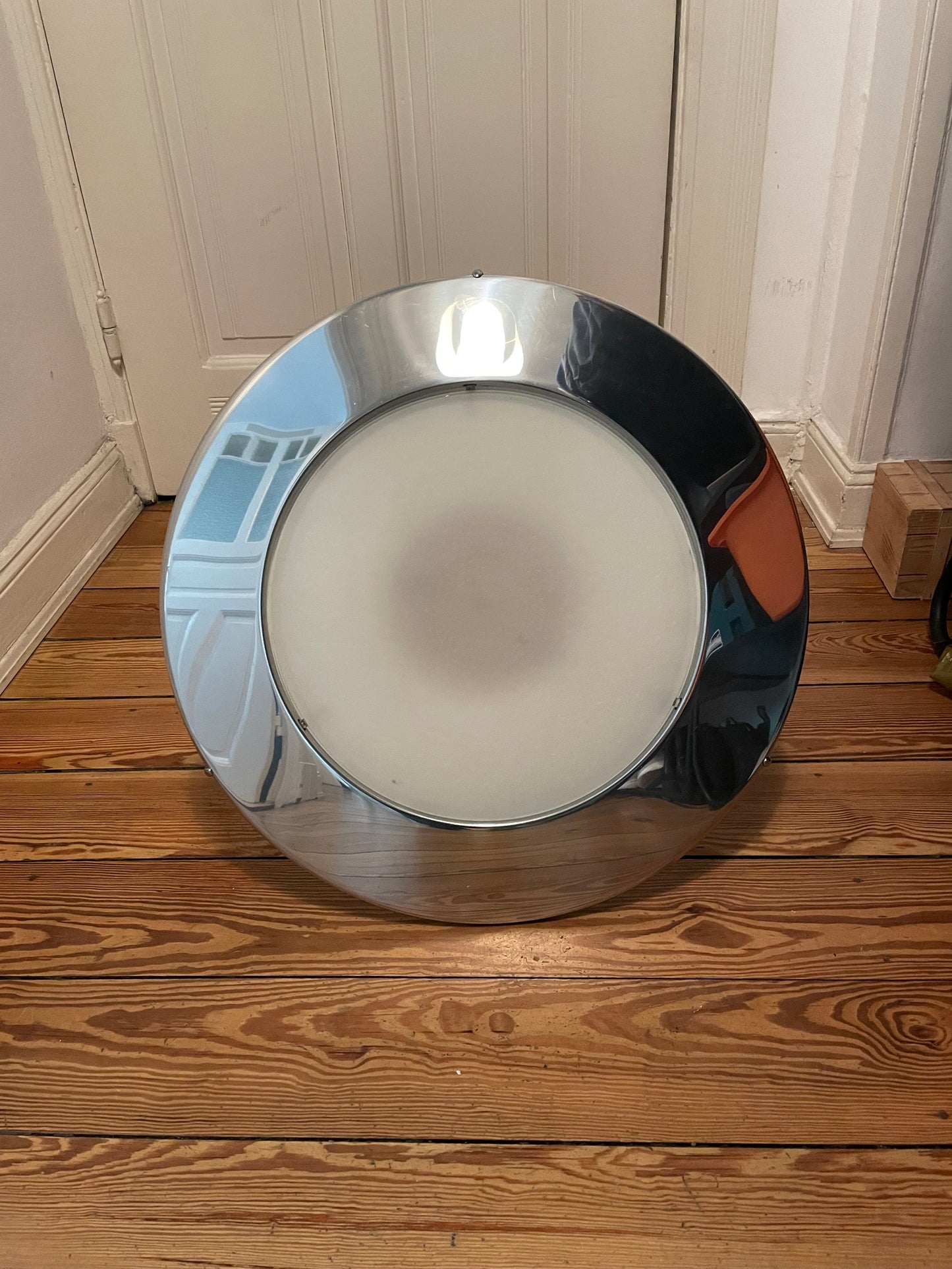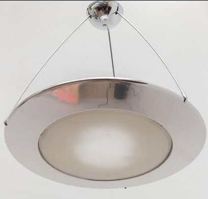 Discover the Mira C chrome disc lamp by Ezio Didone, a timeless design piece from the 1980s, manufactured by Arteluce. This pendant light combines chrome-plated aluminum with a diffuser made of sandblasted, acid-etched glass, creating a pleasant, diffused light distribution. The three chrome-plated rods that attach the lamp to the ceiling rose give it a modern, floating appearance. Ideal for lovers of mid-century style and perfect for adding a touch of elegance to your room.