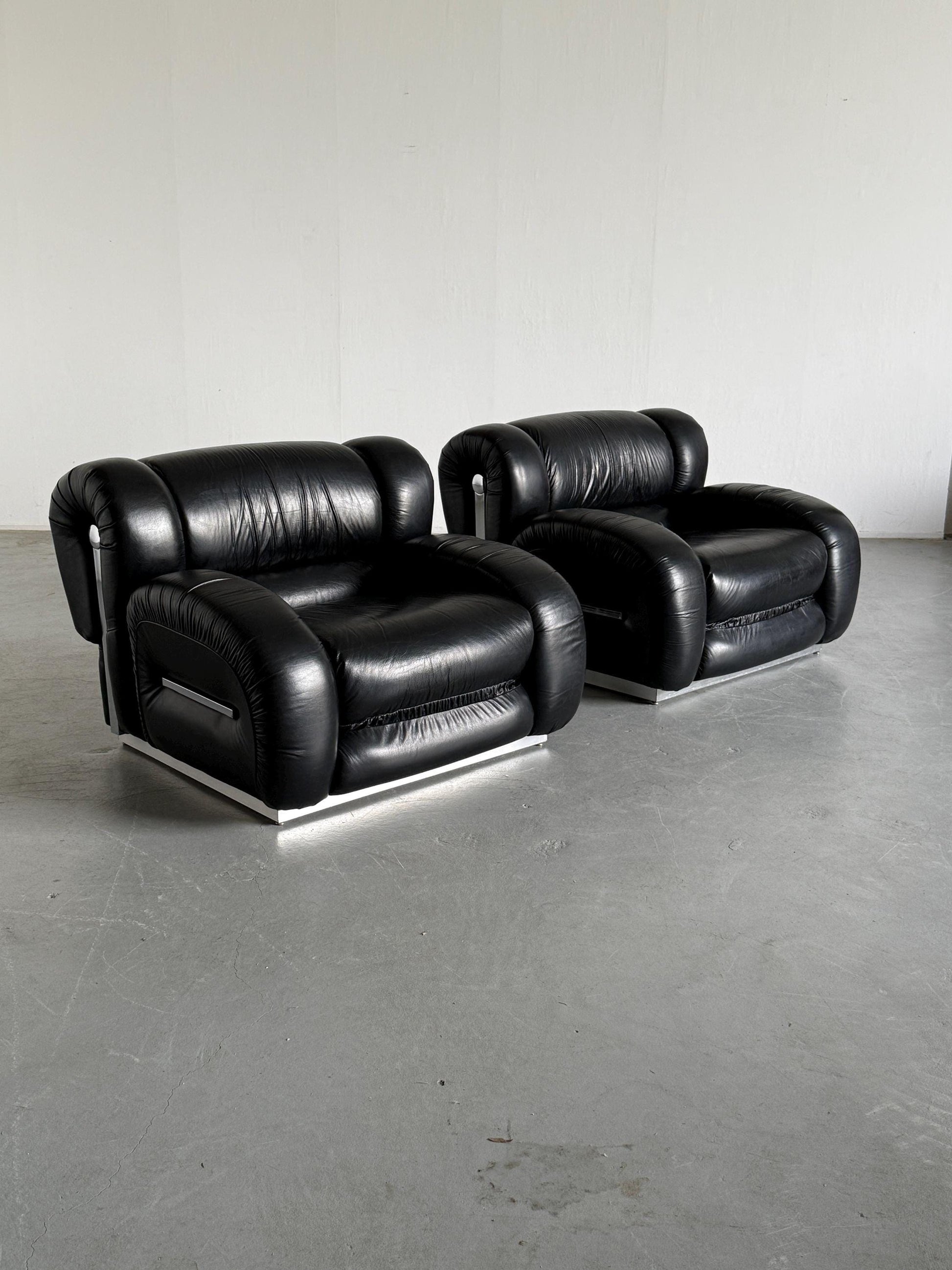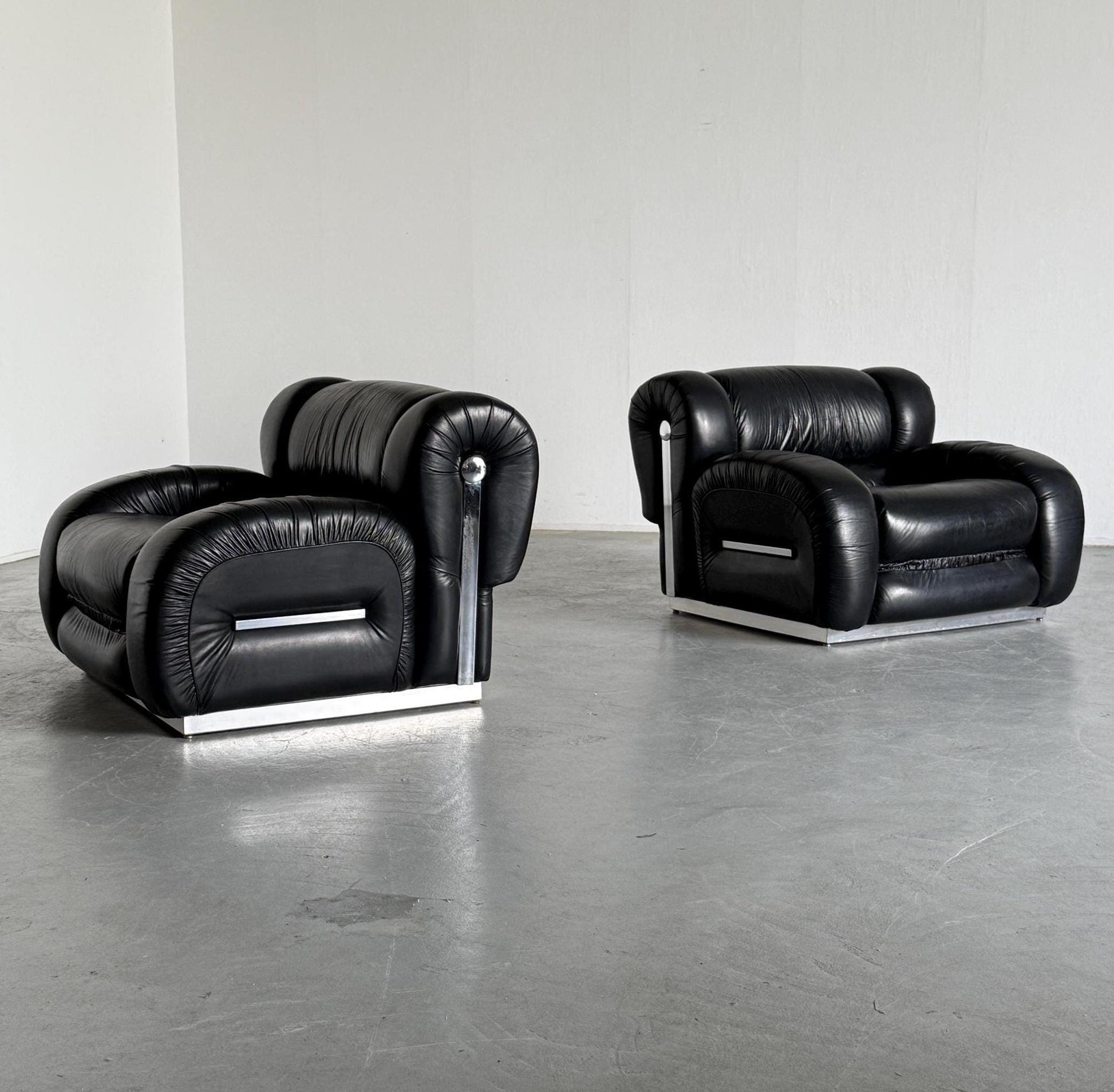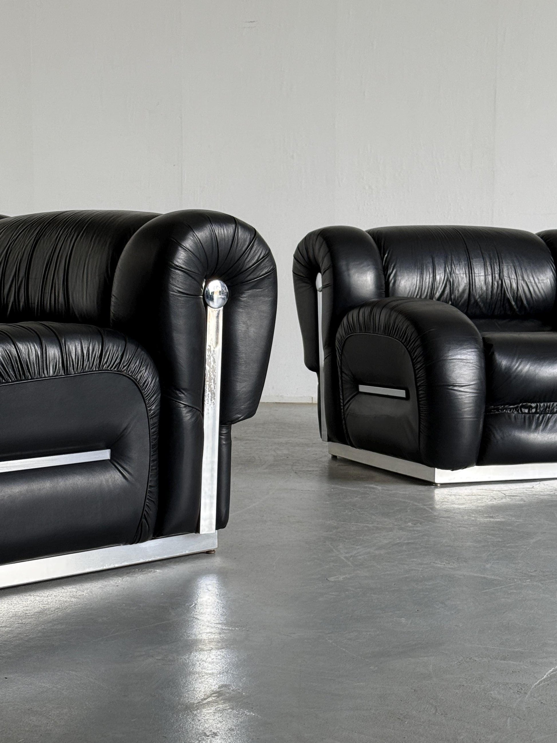 These Space Age lounge chairs from Italy, in mid-century modern style, are characterized by their sculptural shape and the combination of chrome-plated steel frame and padded imitation leather. The elegant cloud shape ensures a futuristic, comfortable seating experience and fits perfectly into modern and stylish living spaces.