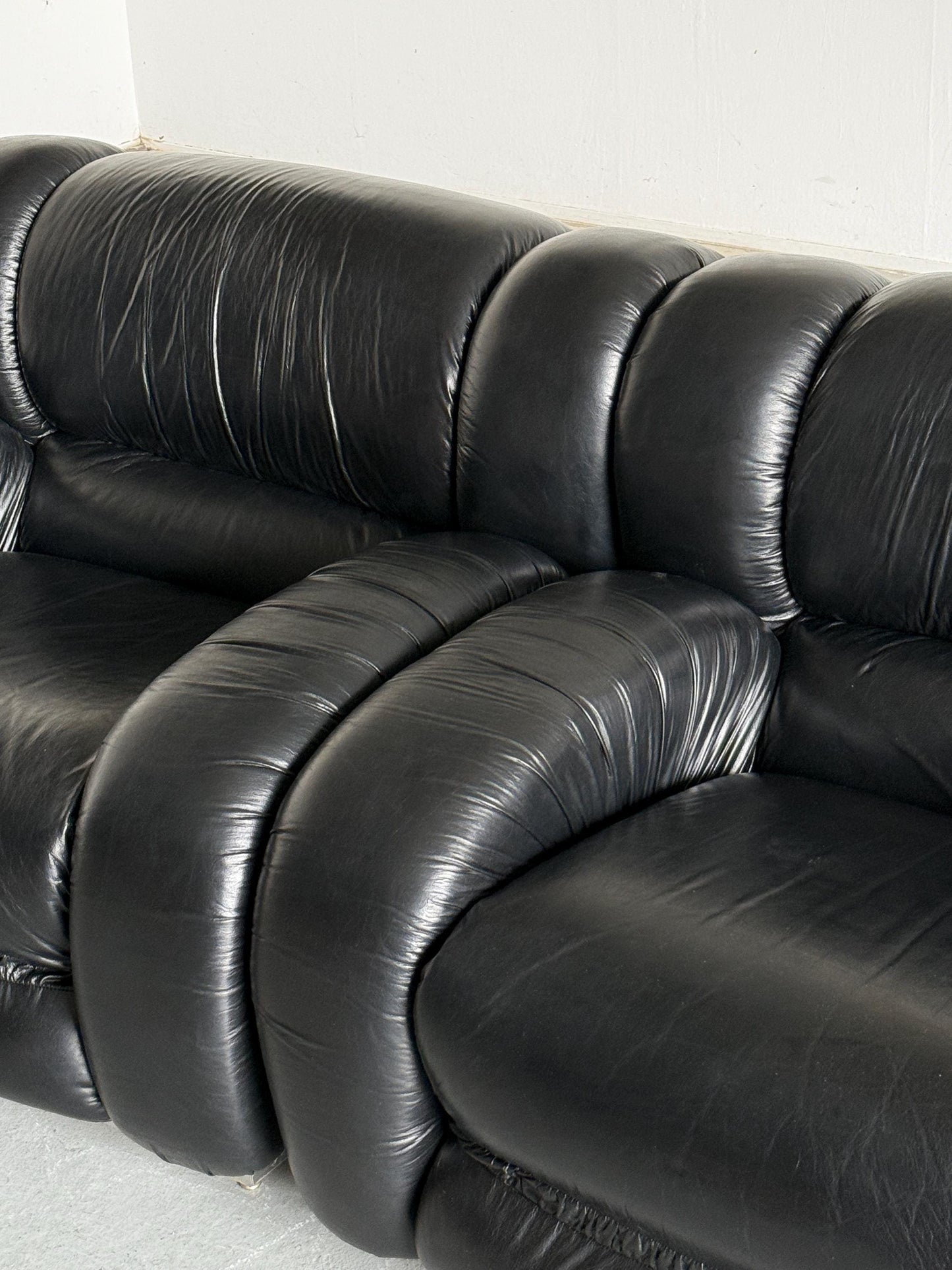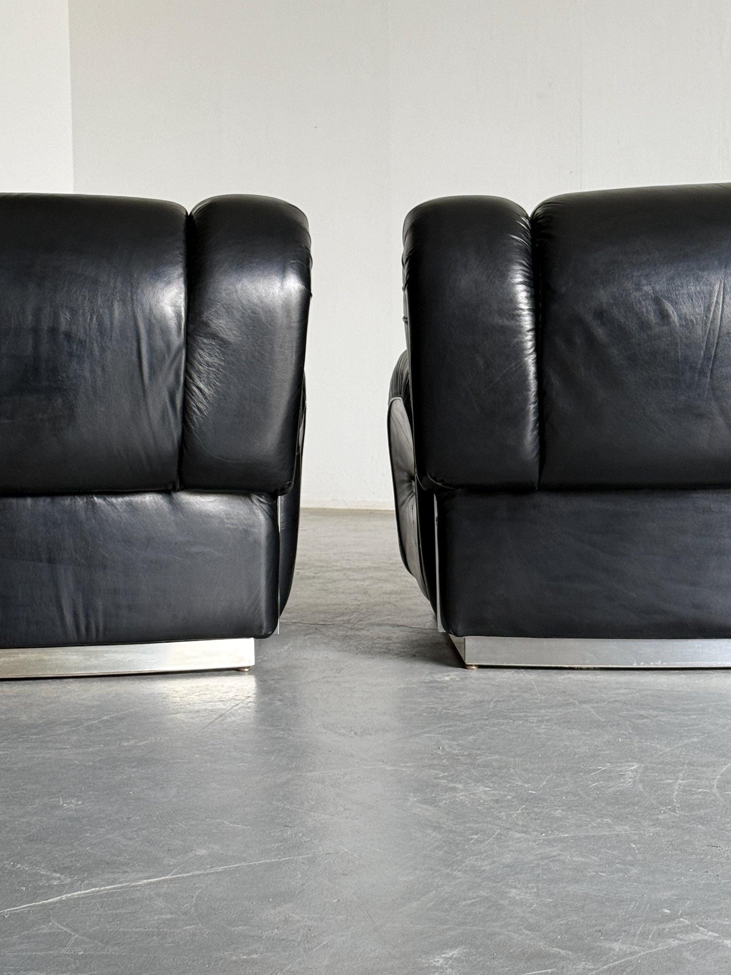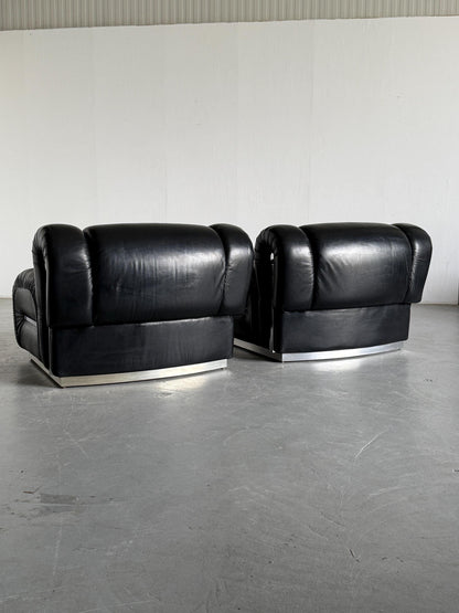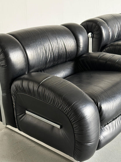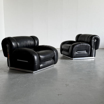 These Space Age lounge chairs from Italy, in mid-century modern style, are characterized by their sculptural shape and the combination of chrome-plated steel frame and padded imitation leather. The elegant cloud shape ensures a futuristic, comfortable seating experience and fits perfectly into modern and stylish living spaces.