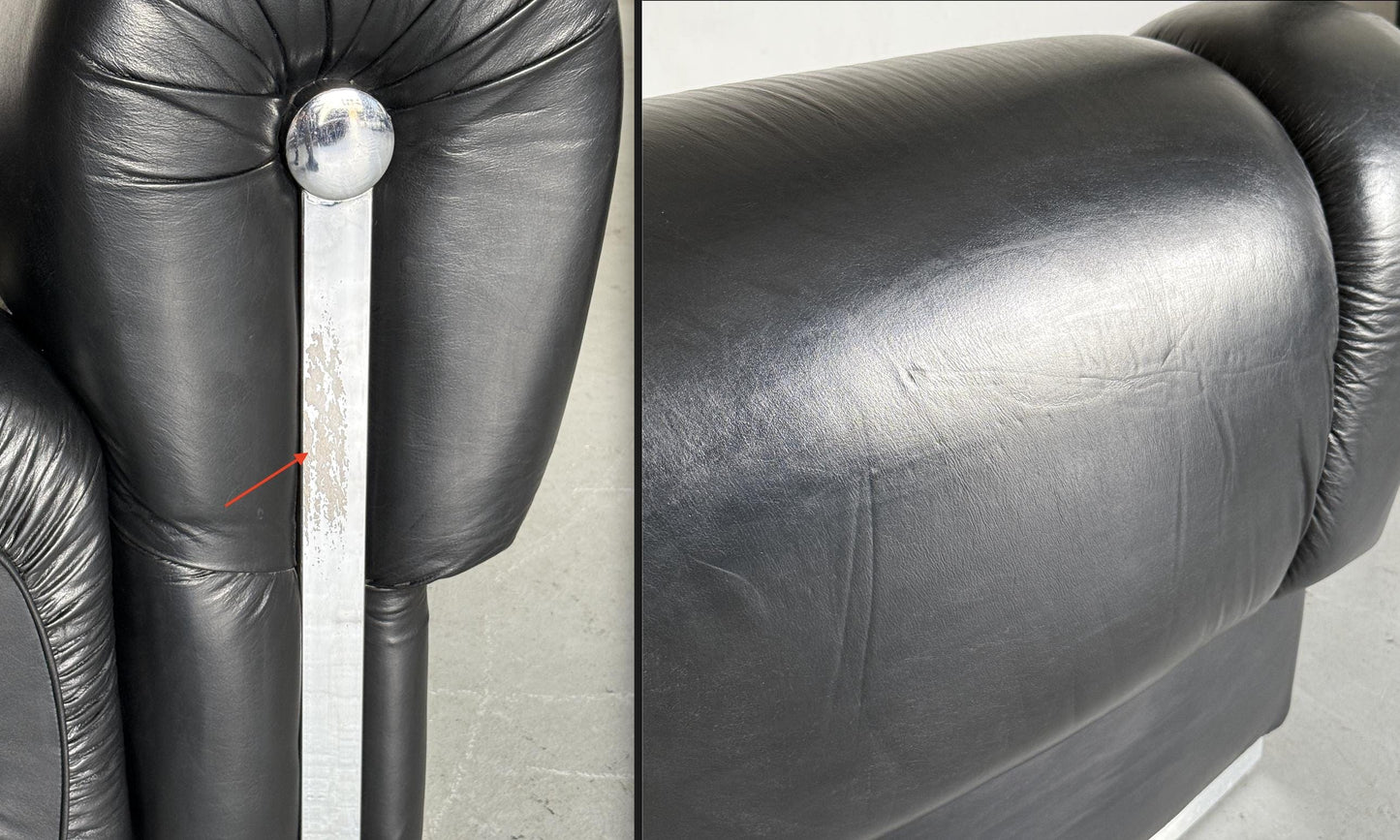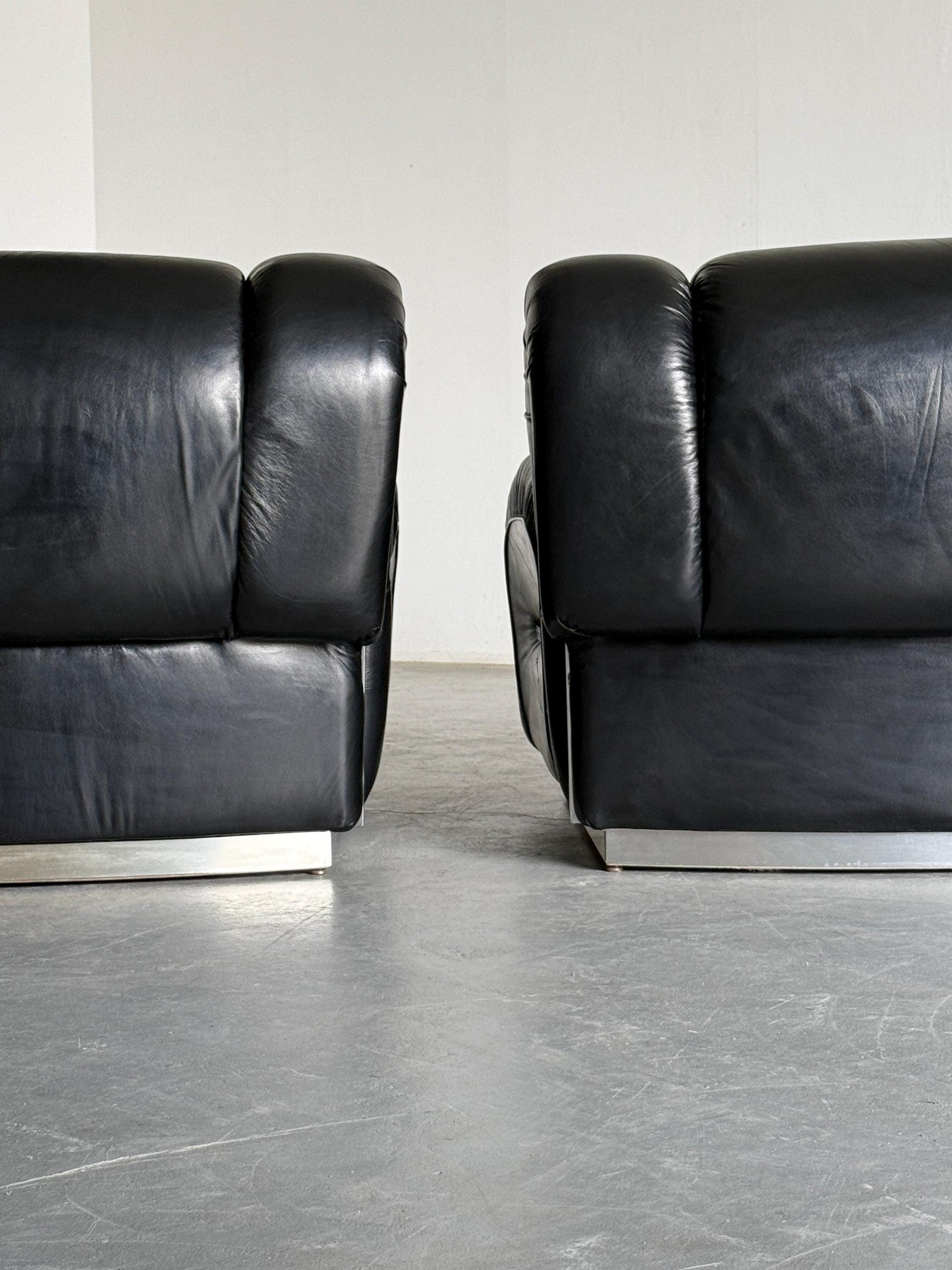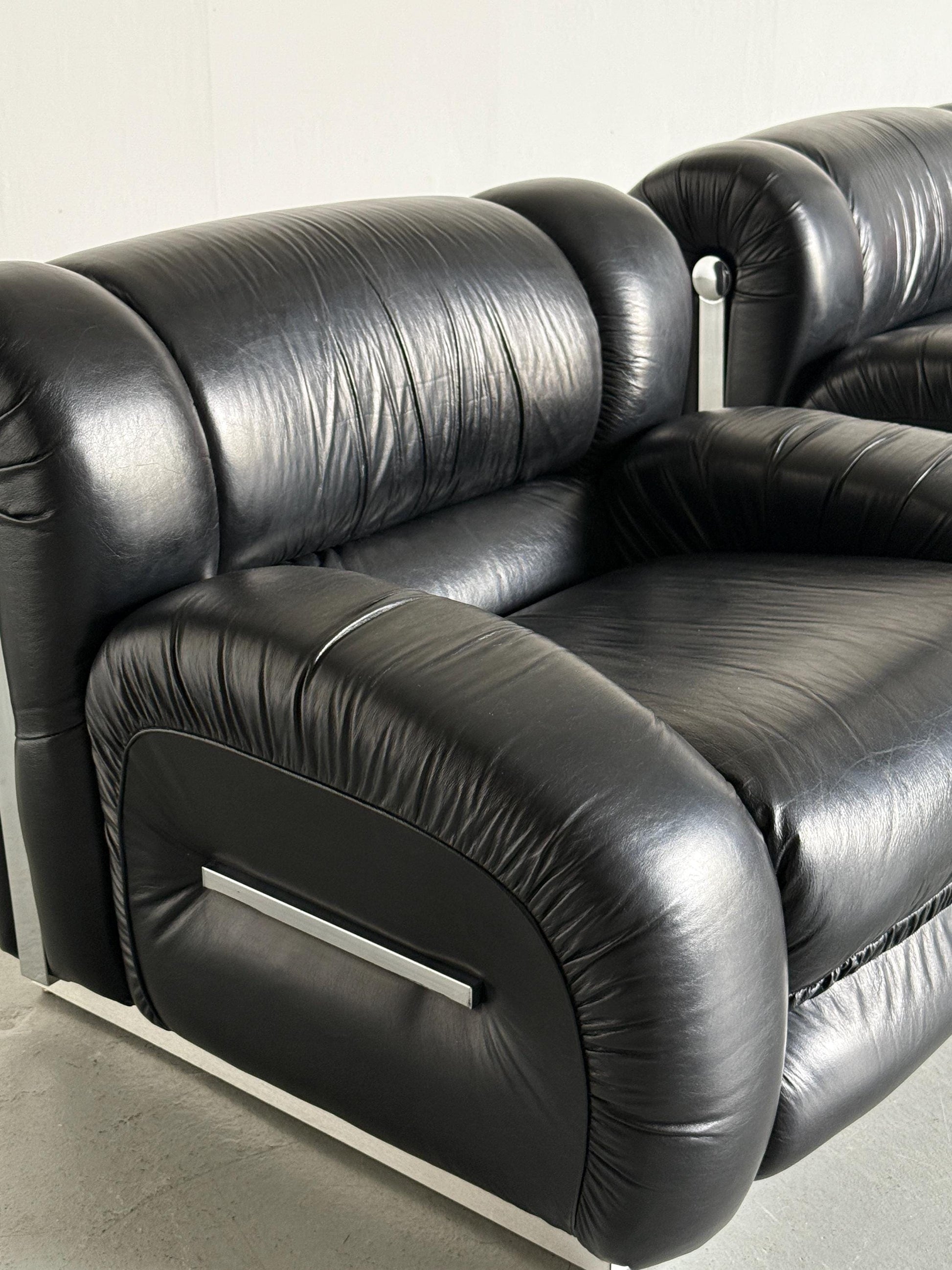 Stunning pair of mid-century modern Italian armchairs in chrome and black faux leather.