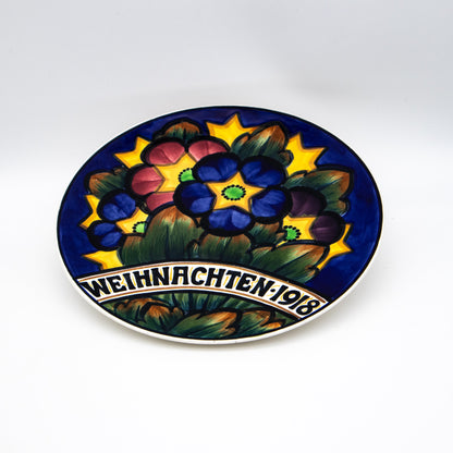 The special wall plate with the inscription "Christmas 1918" was designed by Hans Christian Joachim in 1918 for the faience factory Aluminia / Royal Copenhagen in Denmark. The word "Alemania" is stamped on the back. It was therefore intended for export to Germany.