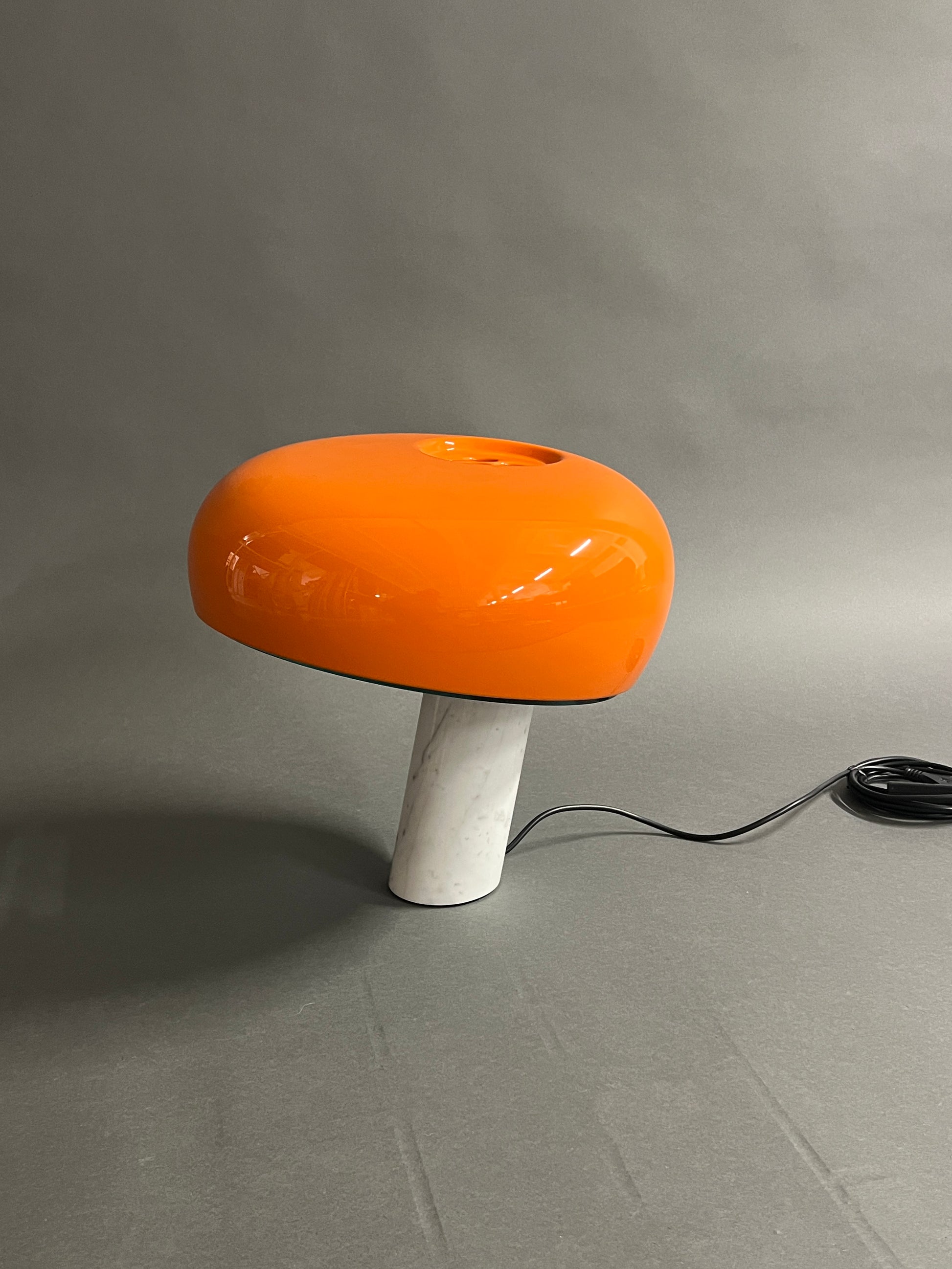 The Snoopy table lamp by Flos is presented here as a limited vintage edition. A design with a clear, humorous touch, rooted in the Mid-Century Modern tradition. The lamp adds a subtle accent to a sideboard or desk. Its sculptural presence is striking even when switched off. The craftsmanship and feel are high-quality, and the lamp is in very good condition. The orange hue brings warmth to minimalist settings and plays with Space Age references. Ideal for those seeking a durable lighting object that also possesses collector value. A harmonious companion for living and working spaces, demonstrating design awareness without being ostentatious.