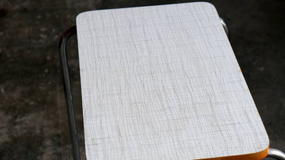 The patterned table top is in good condition; the chrome plating has a beautiful shine but shows signs of corrosion in places.