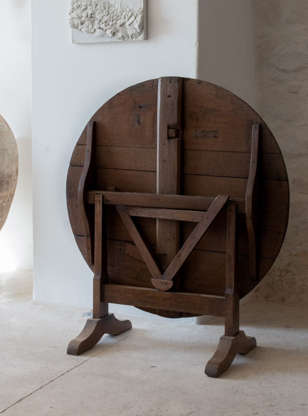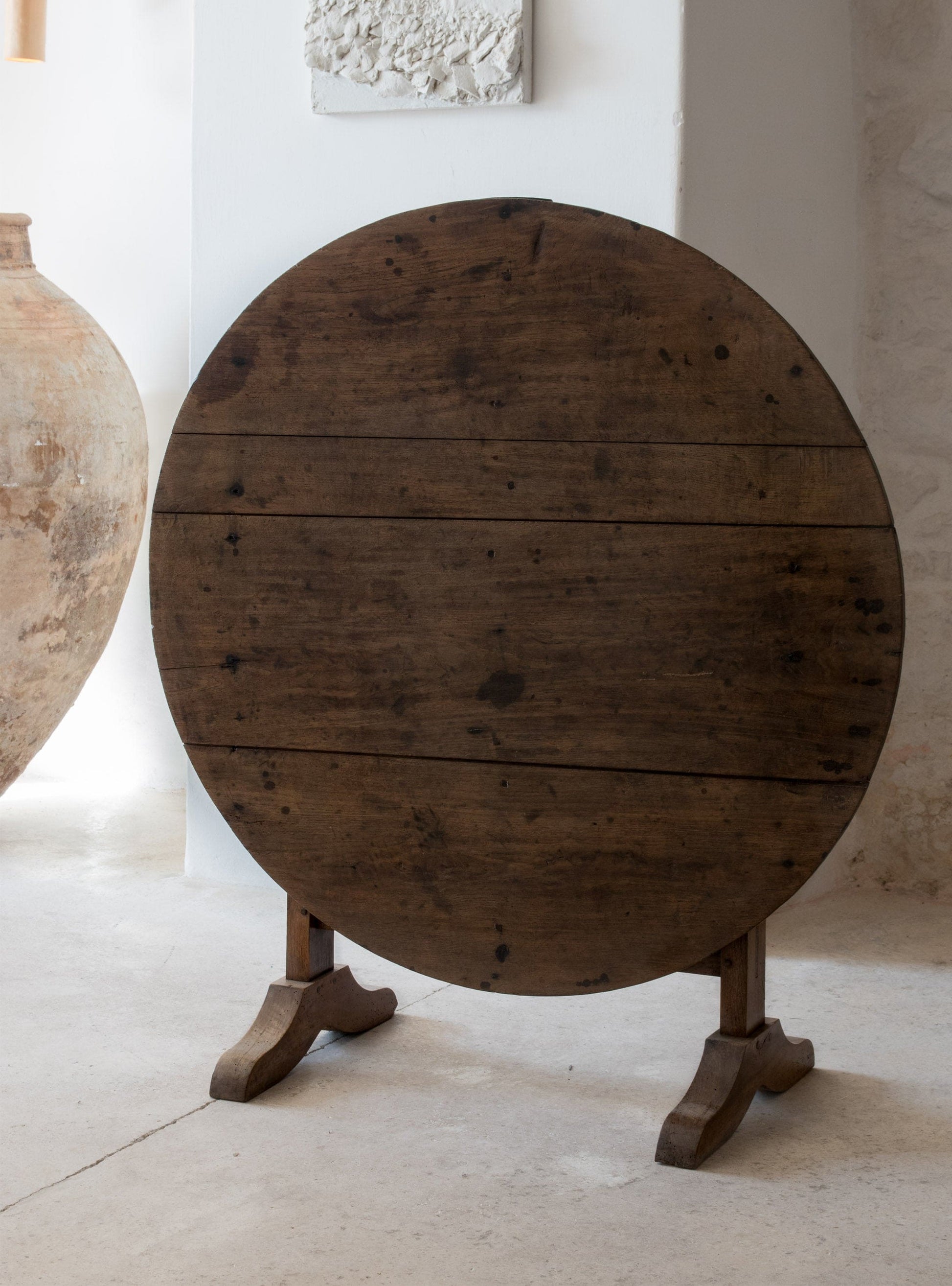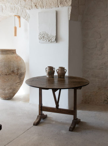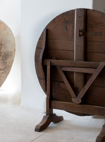 A mid 19th century French tilting top display table once used as a wine tasting table. Large round walnut top on an oak trestle base with simple A mid 19th century French tilting top display table once used as a wine tasting table. Large round walnut top on an oak trestle base with simple A mid 19th century French tilting top display table once used as a wine tasting table. Large round walnut top on an oak trestle base with simple