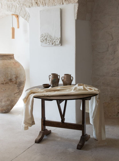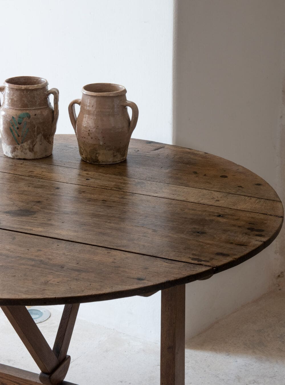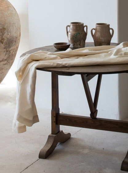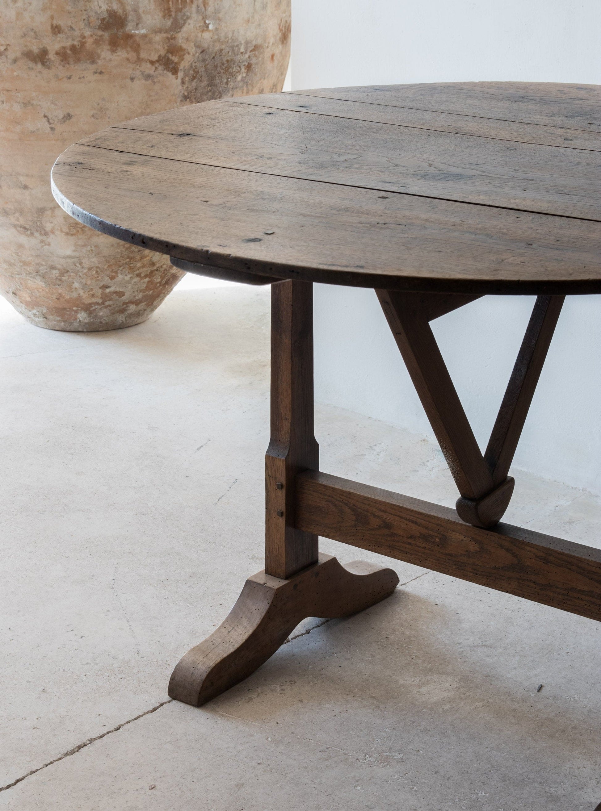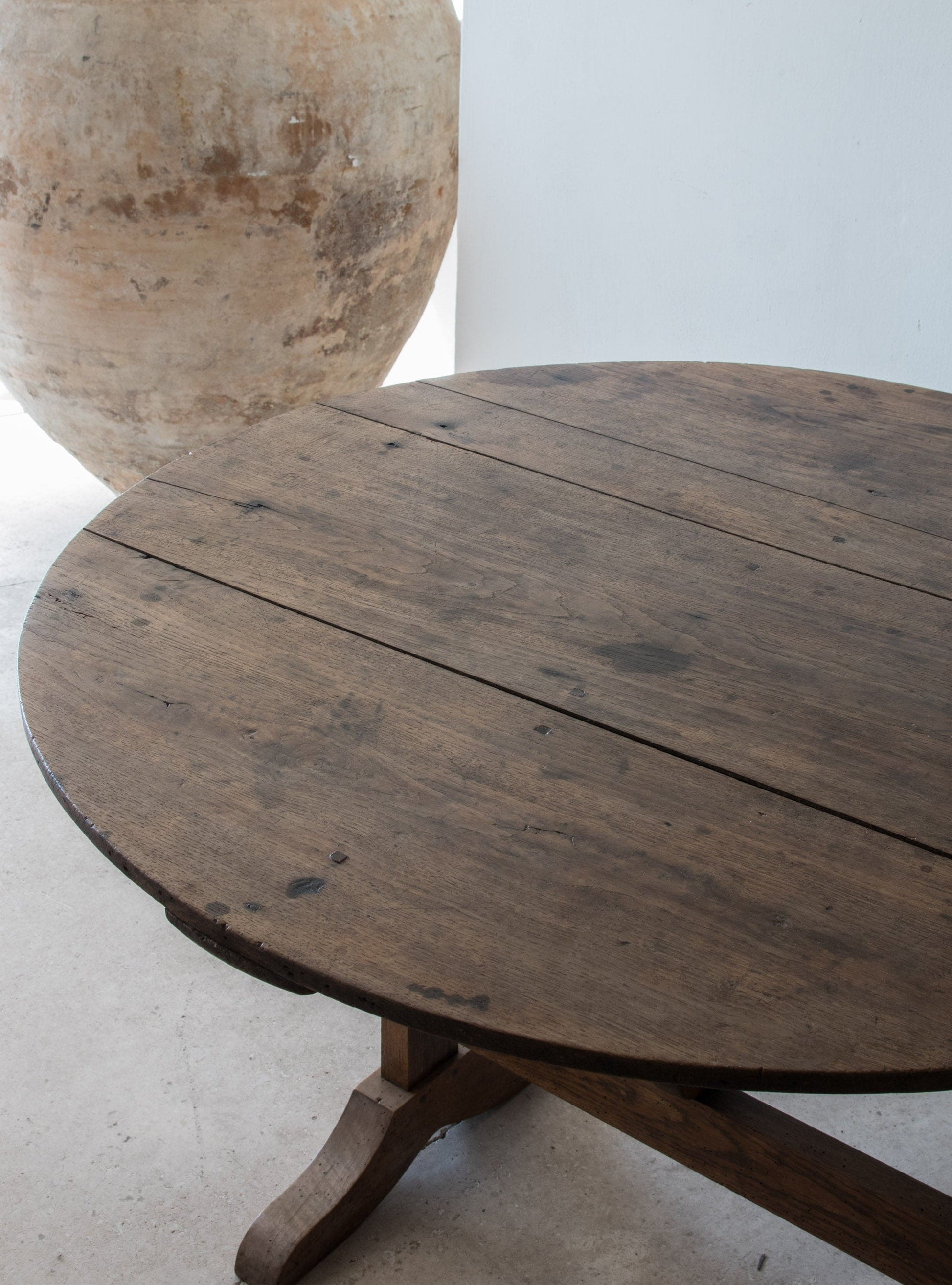 A mid 19th century French tilting top display table once used as a wine tasting table. Large round walnut top on an oak trestle base with simple A mid 19th century French tilting top display table once used as a wine tasting table. Large round walnut top on an oak trestle base with simple A mid 19th century French tilting top display table once used as a wine tasting table. Large round walnut top on an oak trestle base with simple