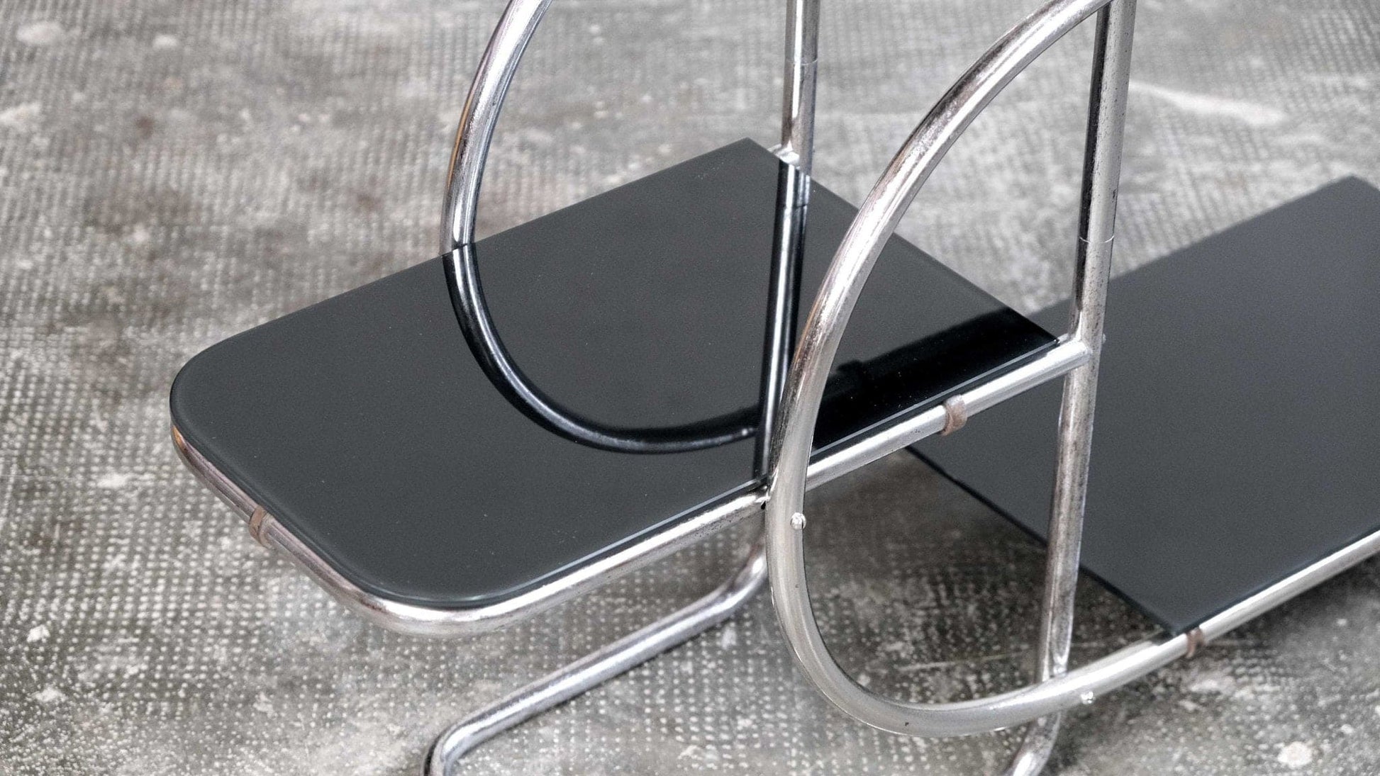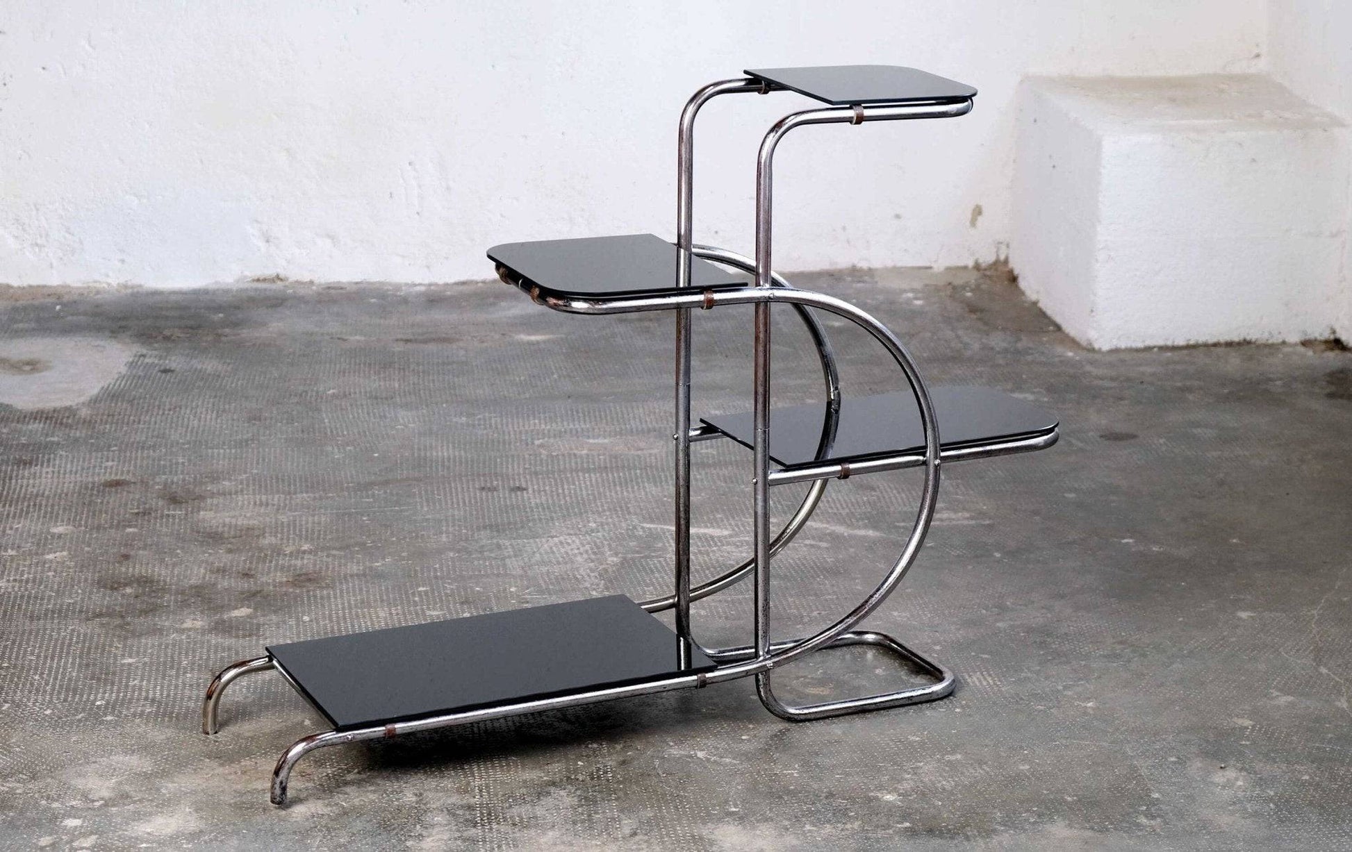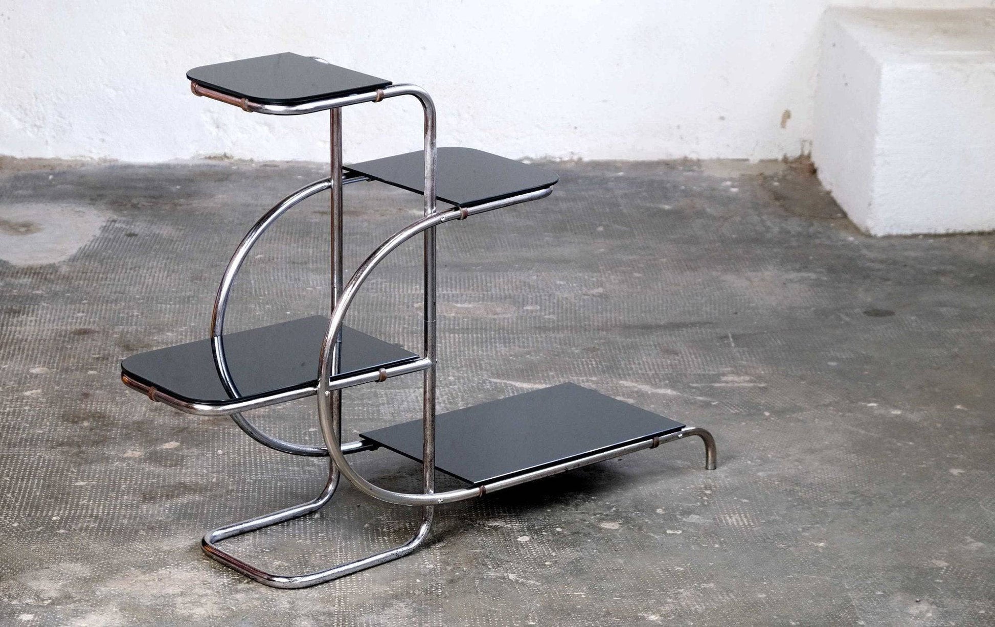 An Art Deco tiered stand made of chrome-plated tubular steel with black glass shelves (the color is created by a dye-printed finish on the underside). The tubular steel frame has a beautiful overall shine, but shows more pronounced signs of wear. Furthermore, one of the two legs is shorter than the other, which may not be in contact with the floor, depending on the surface and the contents of the stand (see photo). This could conceivably be compensated for with a tube cap. The glass shelves have been remade.