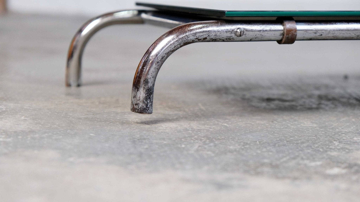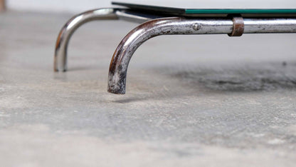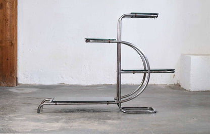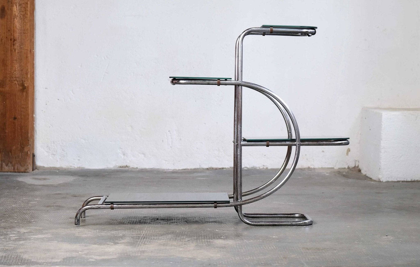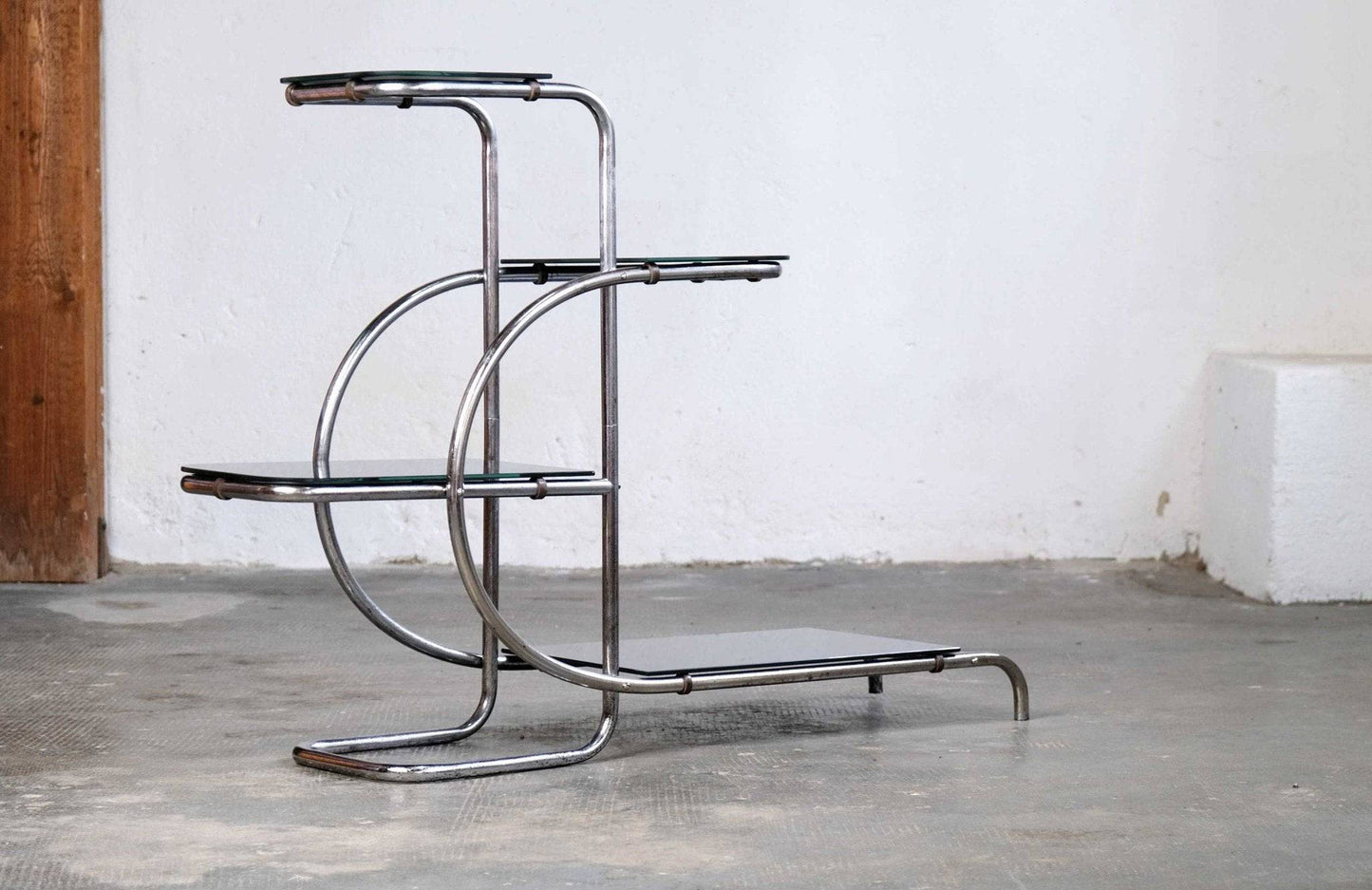 An Art Deco tiered stand made of chrome-plated tubular steel with black glass shelves (the color is created by a dye-printed finish on the underside). The tubular steel frame has a beautiful overall shine, but shows more pronounced signs of wear. Furthermore, one of the two legs is shorter than the other, which may not be in contact with the floor, depending on the surface and the contents of the stand (see photo). This could conceivably be compensated for with a tube cap. The glass shelves have been remade.