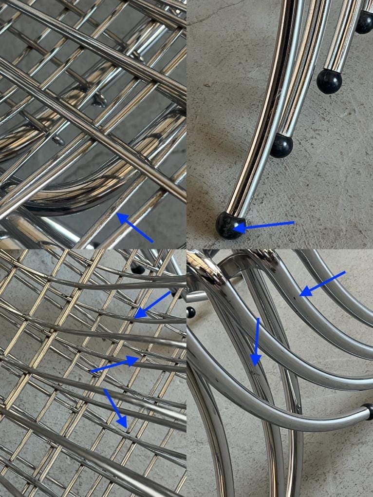 - Condition: Very good vintage quality with minimal signs of age-related wear (light scratches, small dark spots at the wire intersections, seats partially not perfectly wrapped around the frame, but fully functional)