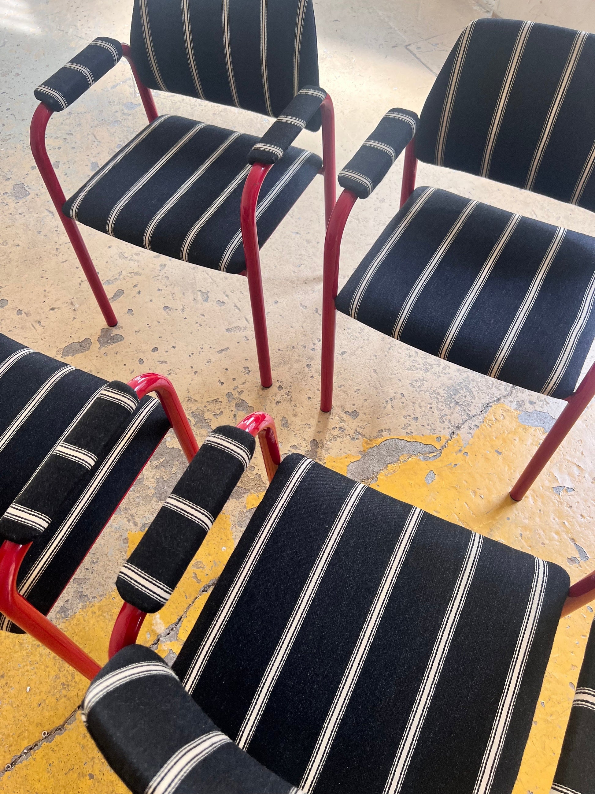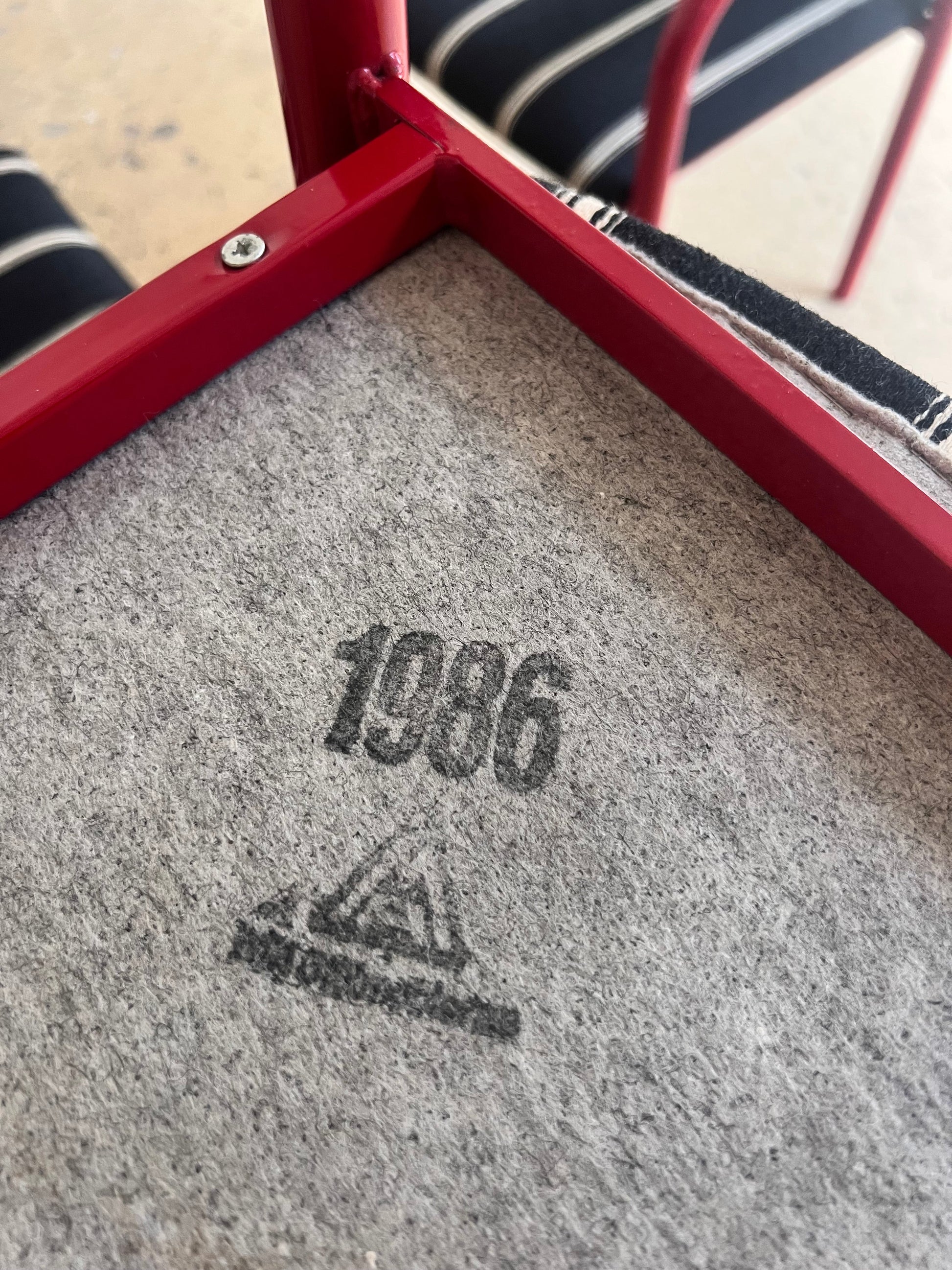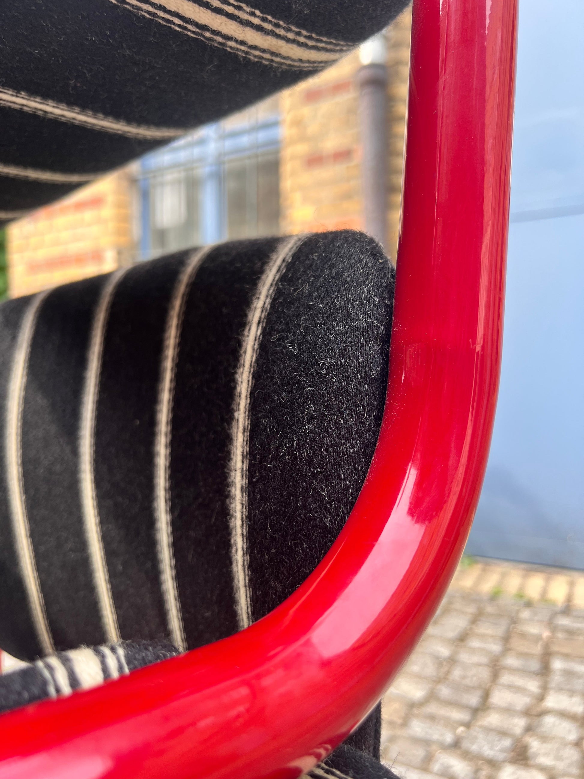 Discover the vintage armchair by Knud Friis and Elmar Moltke from 1986 – a true highlight for lovers of the Pop Art style. With its striking design in red, black, and white, this armchair brings a touch of retro charm to your home. The sturdy metal frame and high-quality fabric ensure comfort and durability. Each armchair is unique and will exhibit small, individual signs of wear in the paint, emphasizing its authentic character.