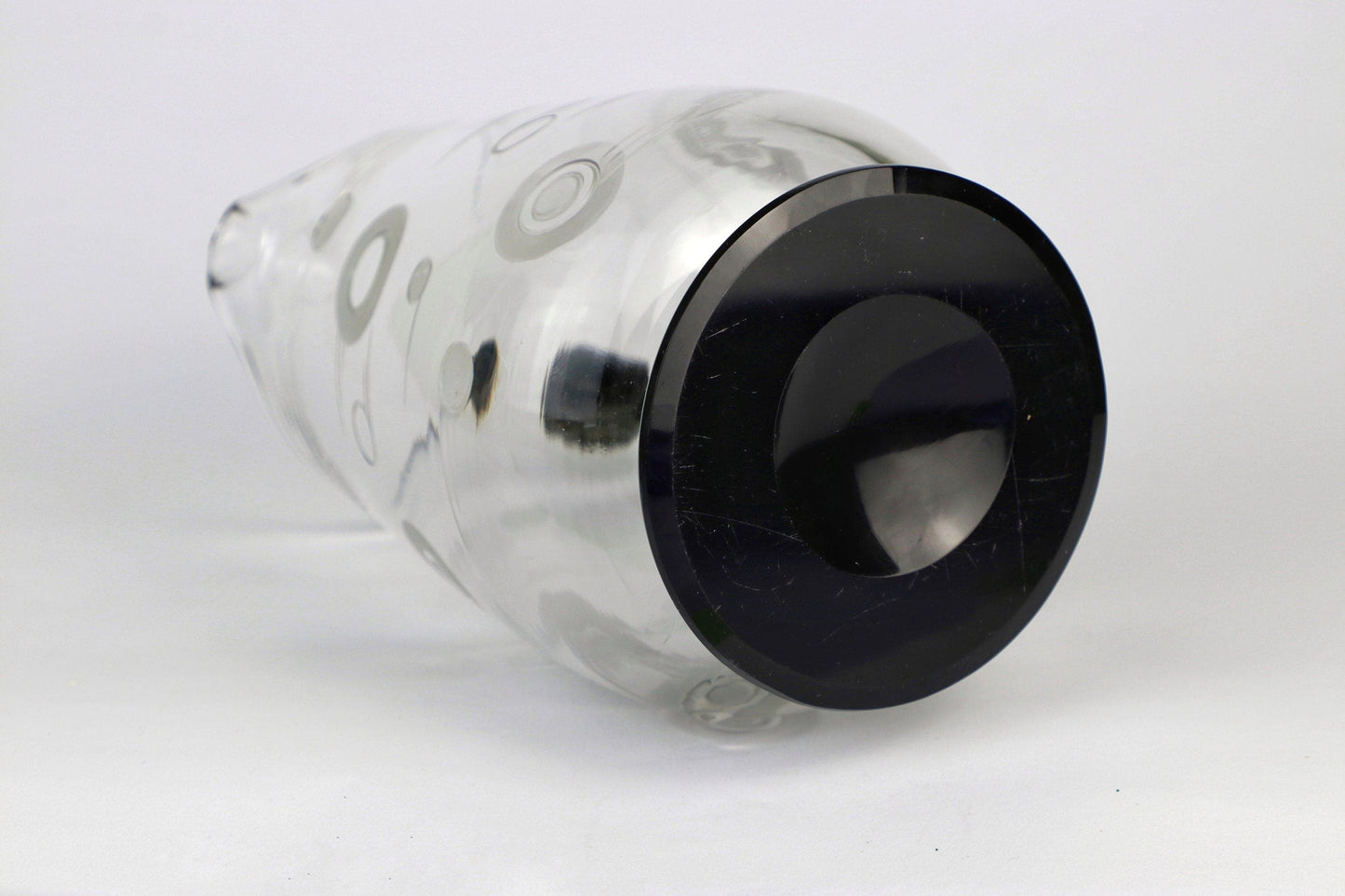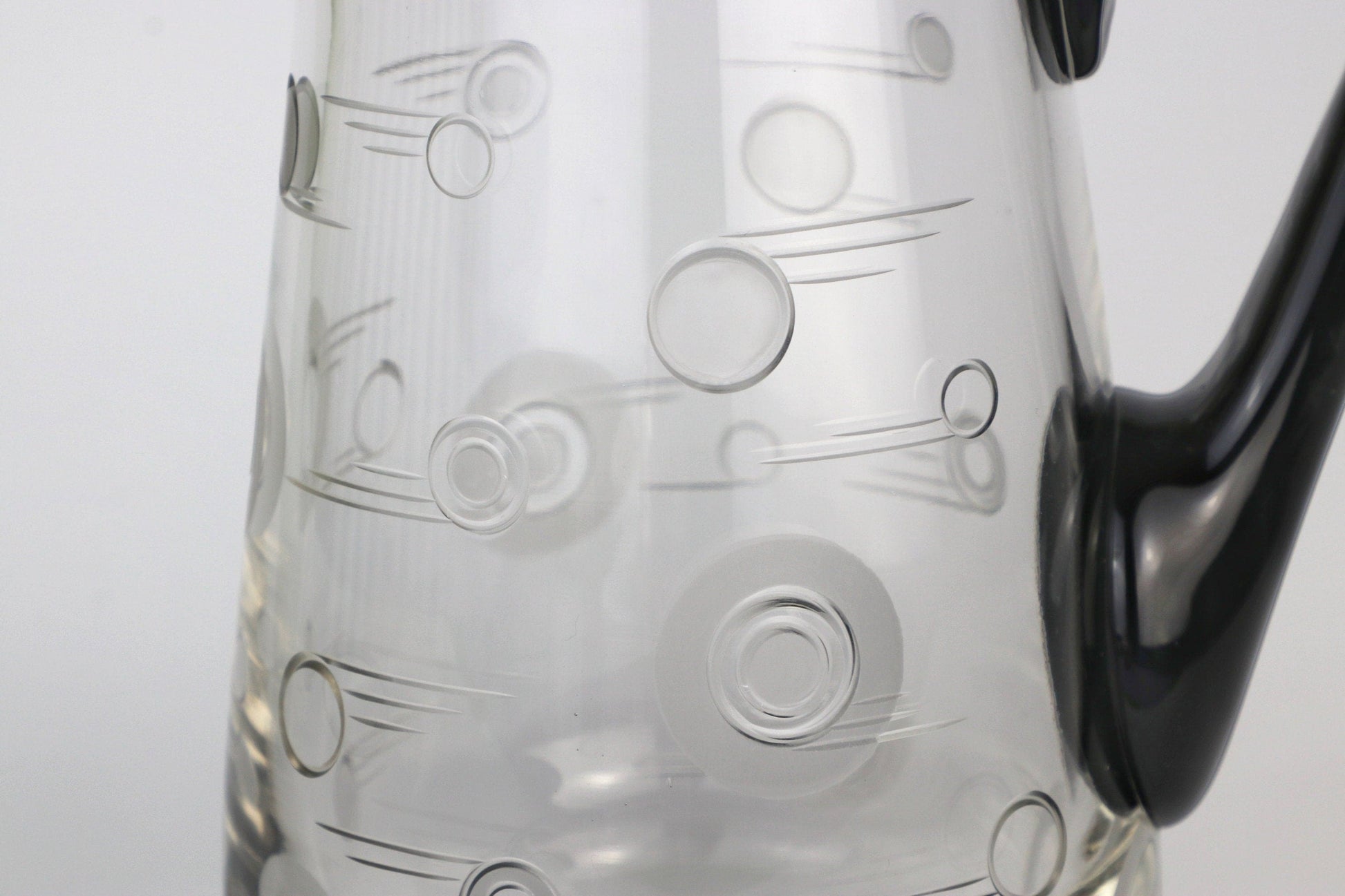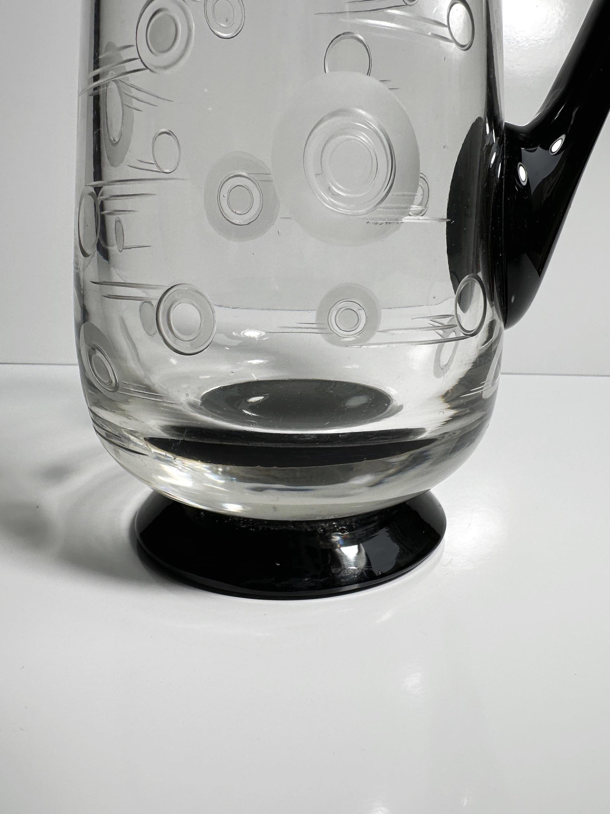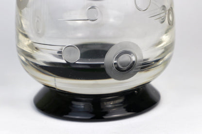 Transparent, high-quality glass with a black, ground handle and black base. Contemporary decorative elements with circles and lines are ground into the glass, partially satined / frosted.