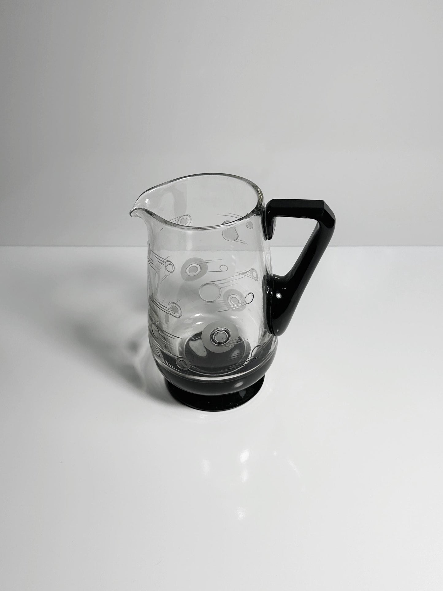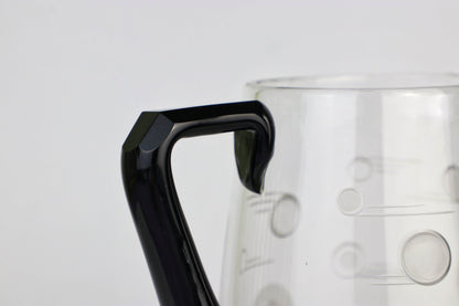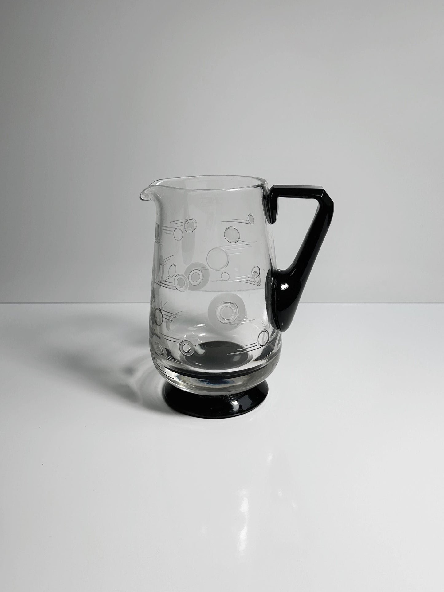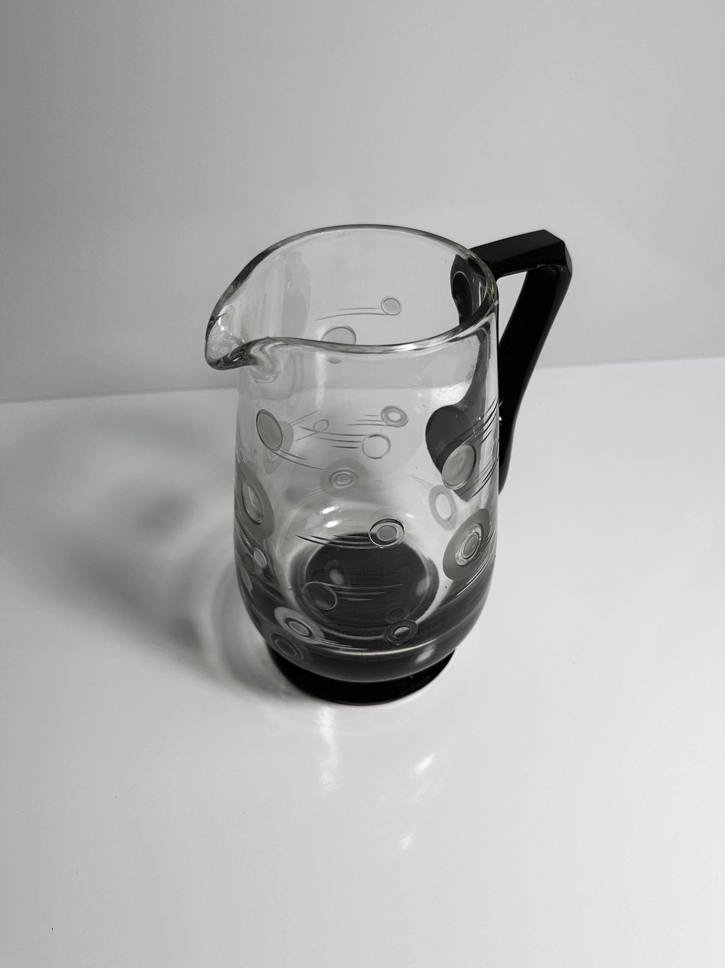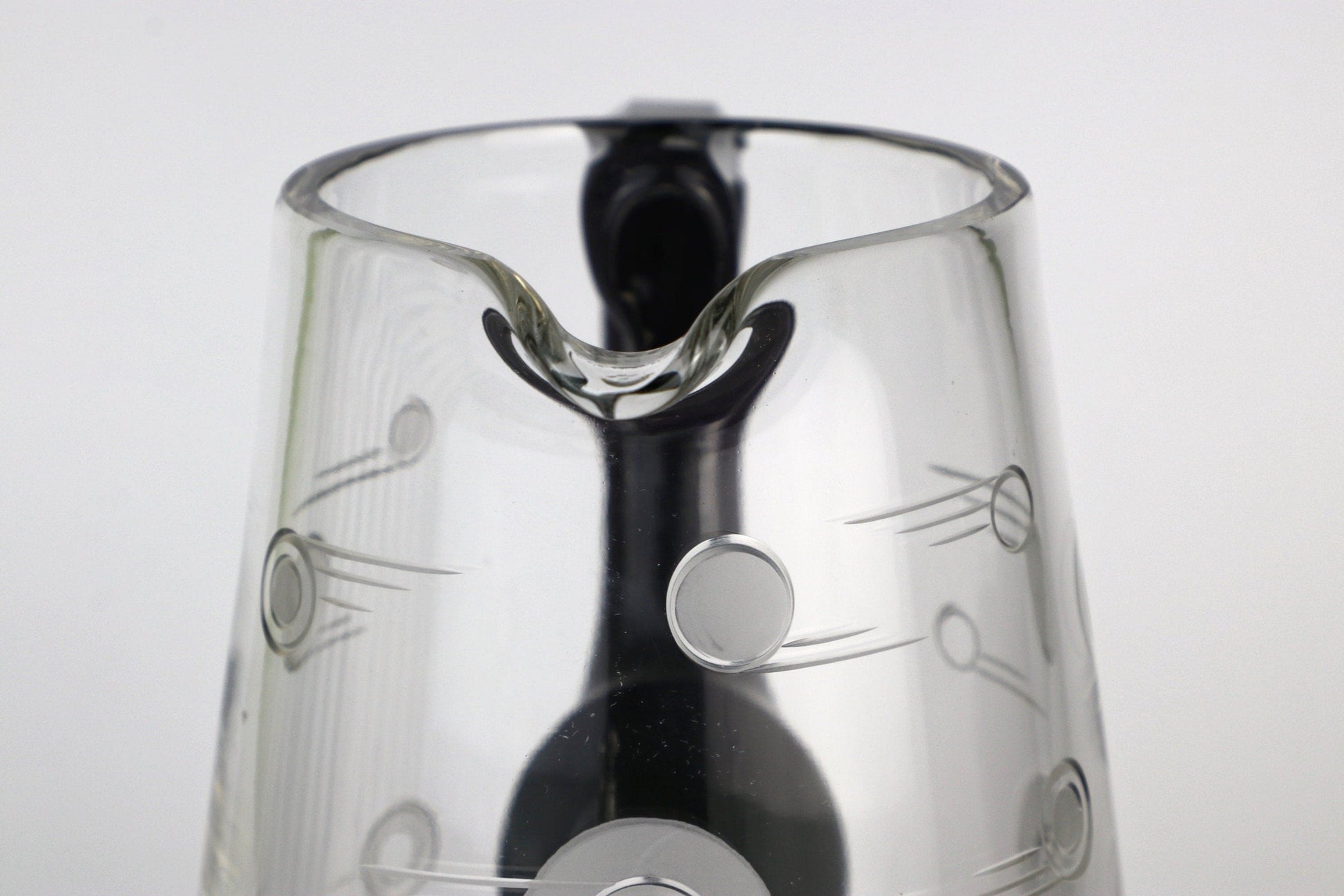 Transparent, high-quality glass with a black, ground handle and black base. Contemporary decorative elements with circles and lines are ground into the glass, partially satined / frosted.