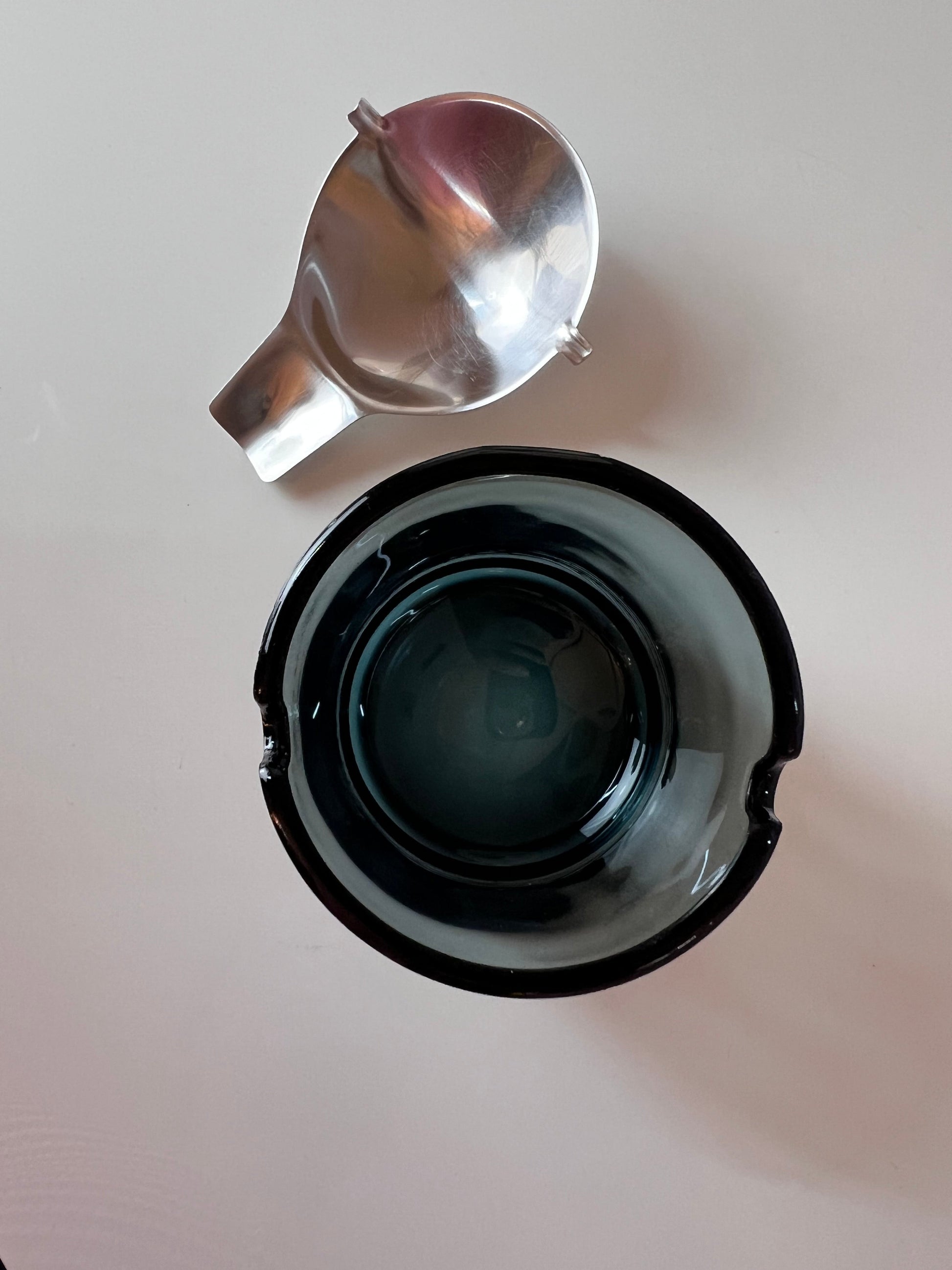 Discover the vintage glass and stainless steel ashtray, designed by Wilhelm Wagenfeld for WMF. The elegant, tilting design from 1959 combines timeless functionality with modern Bauhaus style. The blue-gray glass provides a sophisticated look, while the stainless steel tilting handle allows for practical handling. Perfect for style-conscious smokers and design lovers.