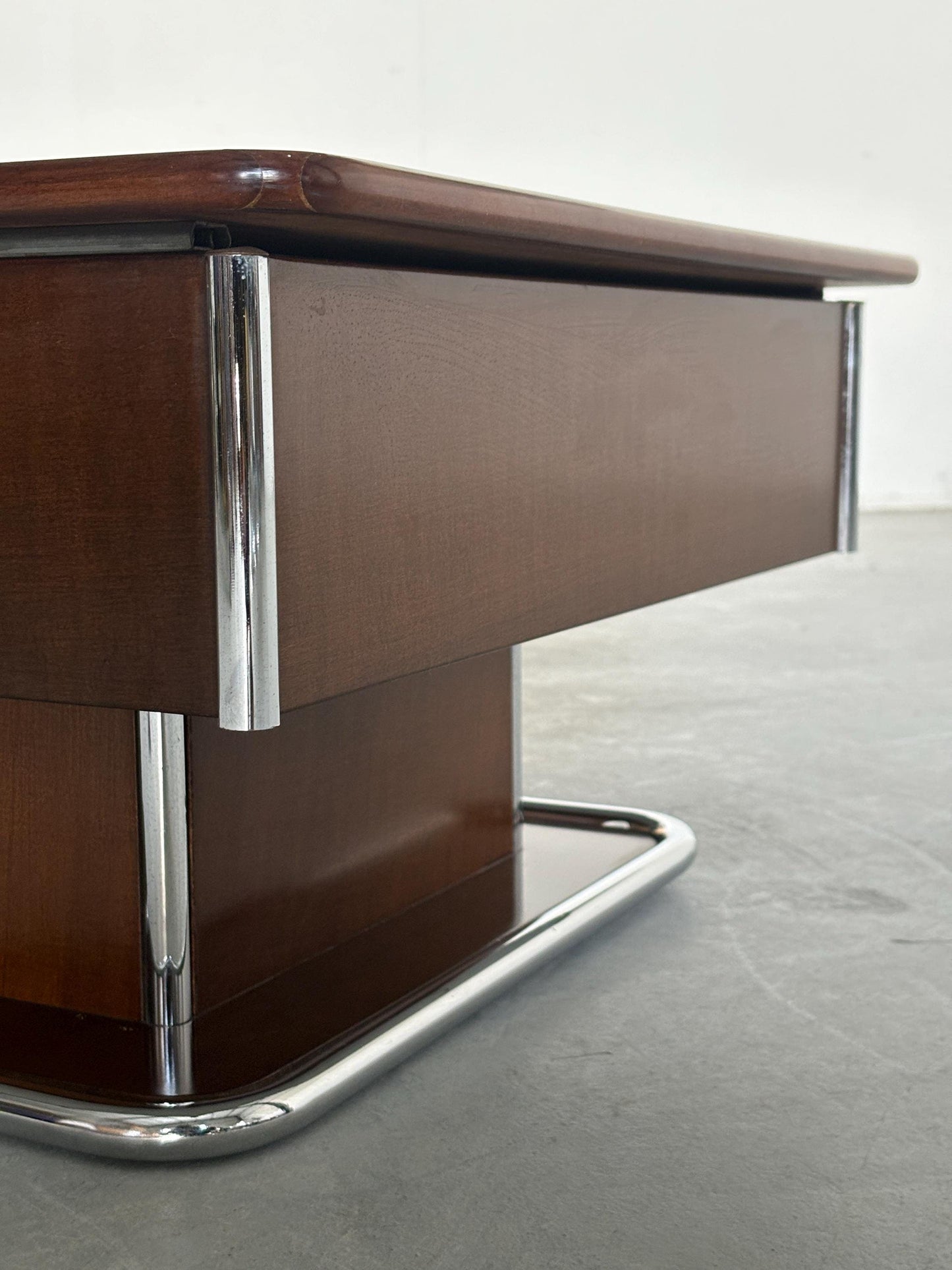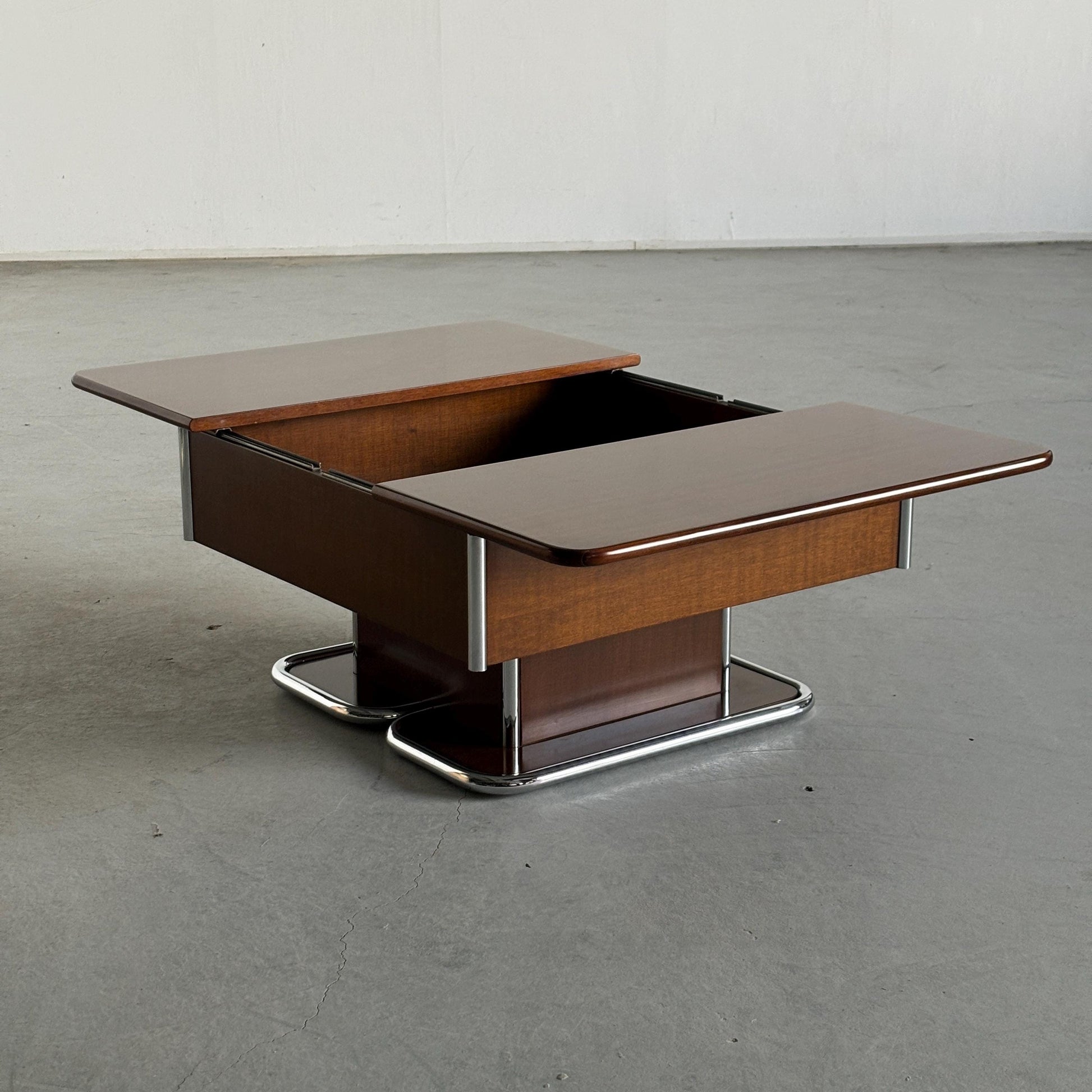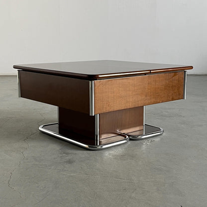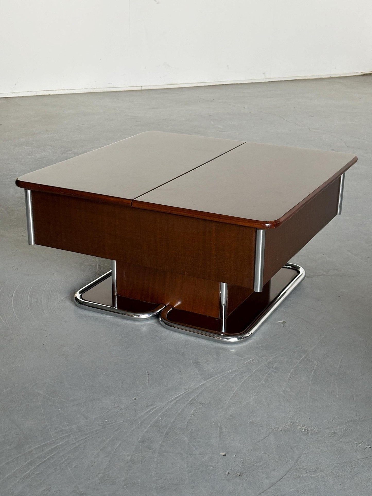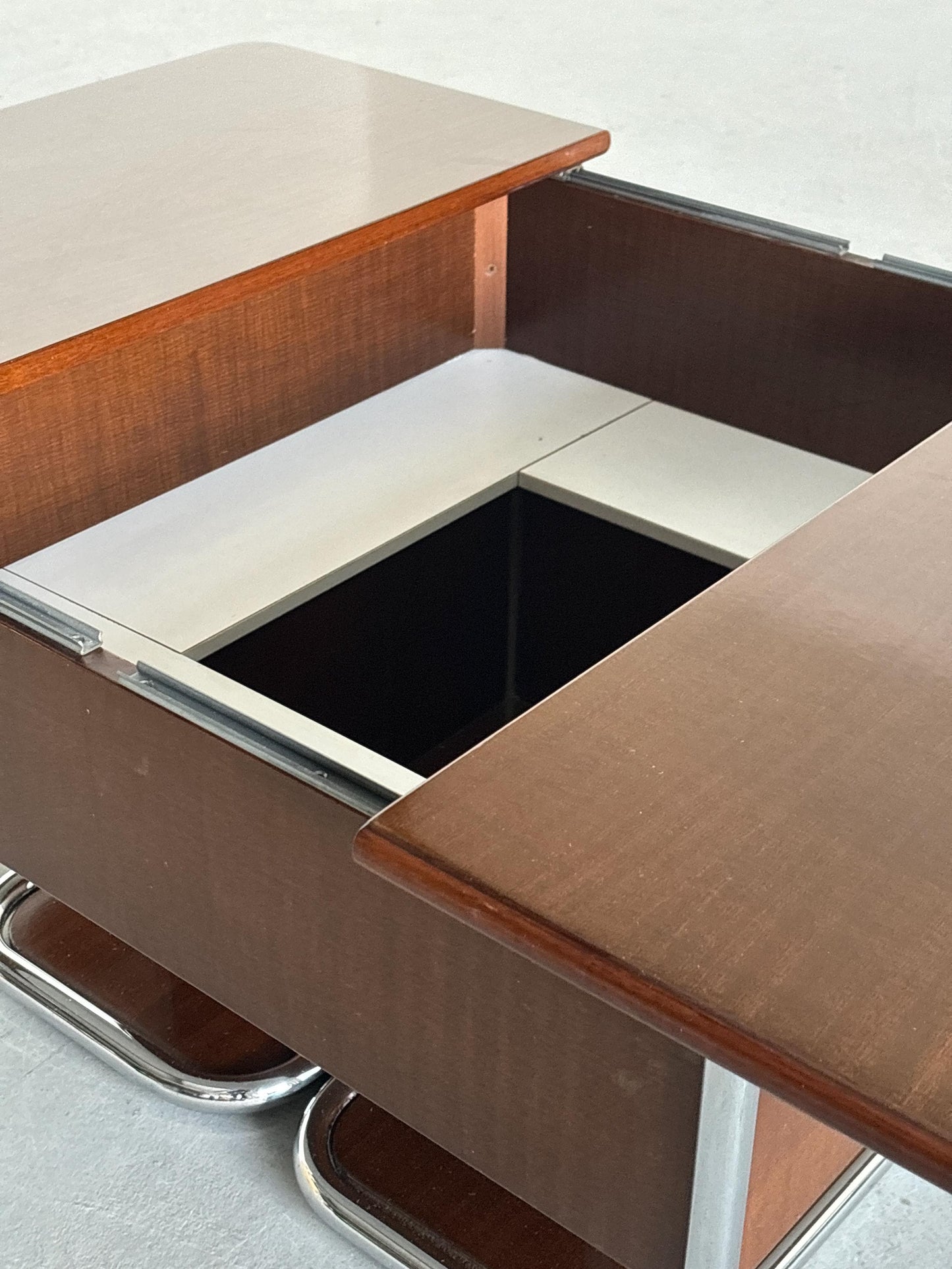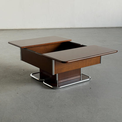 A coffee table is the centerpiece of the living room, not only providing a place to store magazines and drinks but also making a design statement. Our vintage coffee tables impress with robust materials such as solid wood, glass, or metal and represent various design eras – from clean mid-century lines to minimalist Bauhaus models to futuristic Space Age versions. Each piece has been tested and is immediately available. Their sustainable quality and distinctive look make these tables an indispensable element in any stylish living environment.