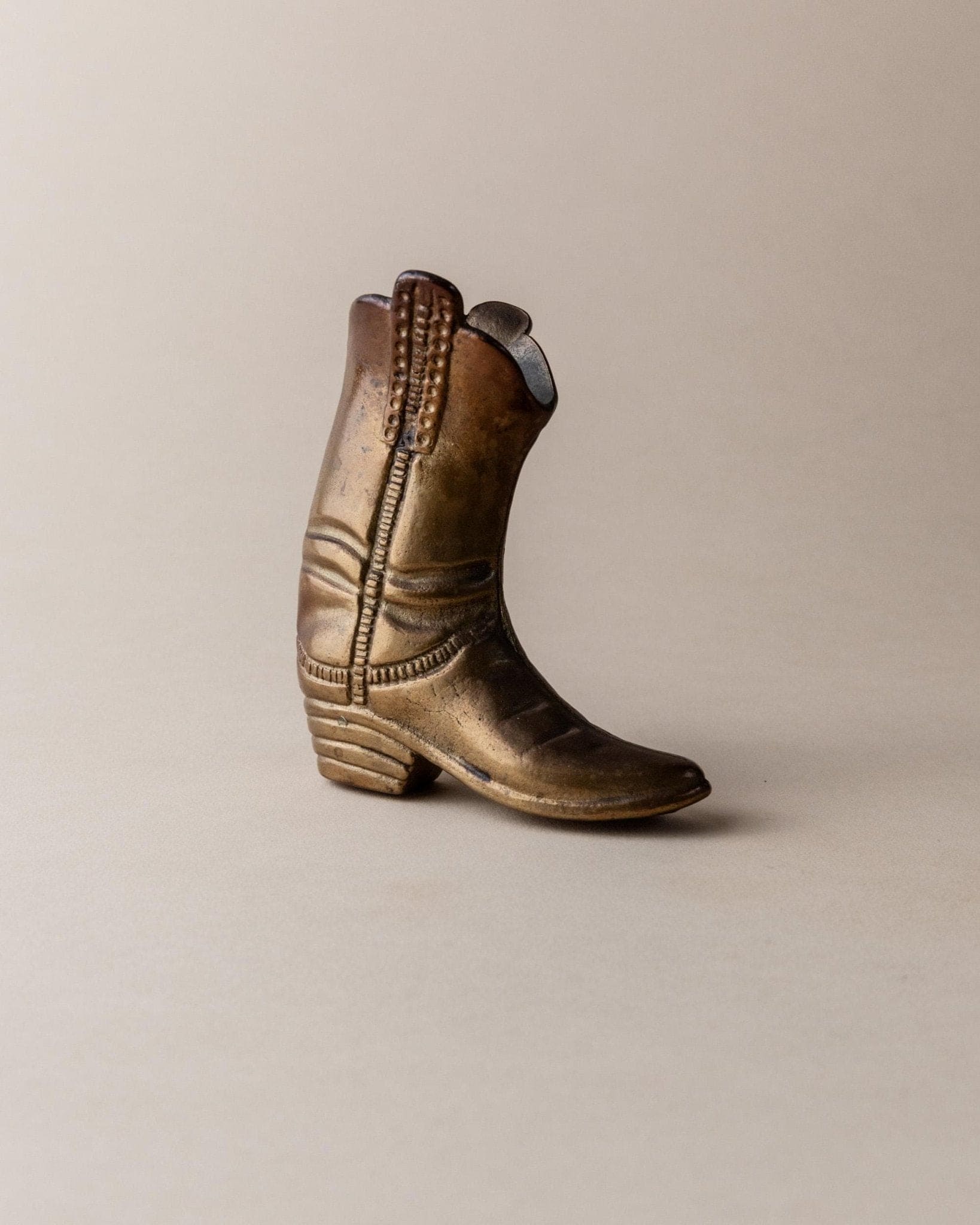 Bring a touch of Space Age and Western charm to your home with this vintage brass cowboy boot figurine, crafted in Italy in the 1980s. The mid-century modern design and detailed craftsmanship make this decorative object a real eye-catcher—whether used as a small vase, candle holder, or as an original statement piece on your desk or shelf. The solid craftsmanship and weight of 250 g underscore the excellent quality and durability of this special piece. The aged brass surface gives the boot a warm, characterful patina that enhances any interior.