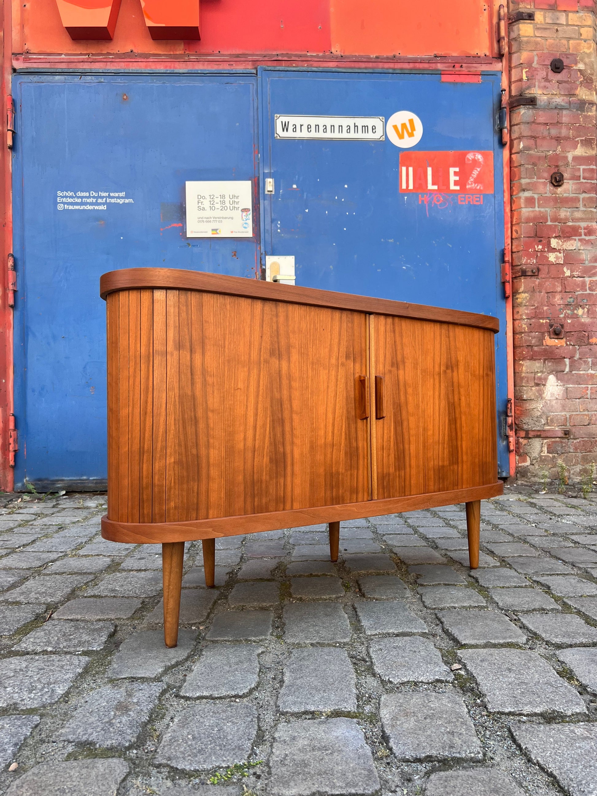 Add a touch of mid-century charm to your home with the vintage walnut corner bar. This stylish piece of furniture is not only a real eye-catcher but also extremely functional—perfect for convivial evenings and elegant cocktail parties. The smooth-running roller shutters open effortlessly, instantly showcasing the bar. The rotating interior shelf with a mirrored back offers a sophisticated display area for your favorite drinks.