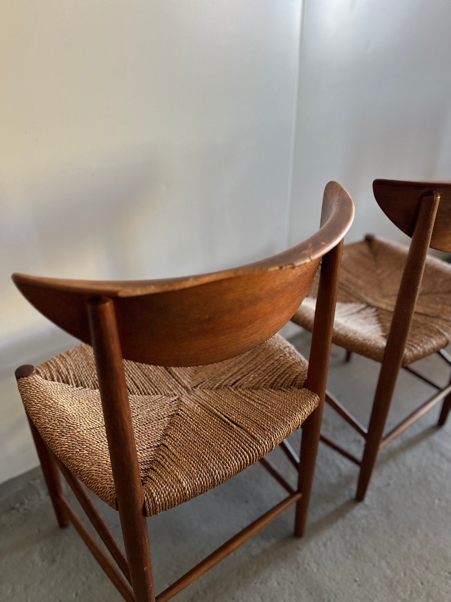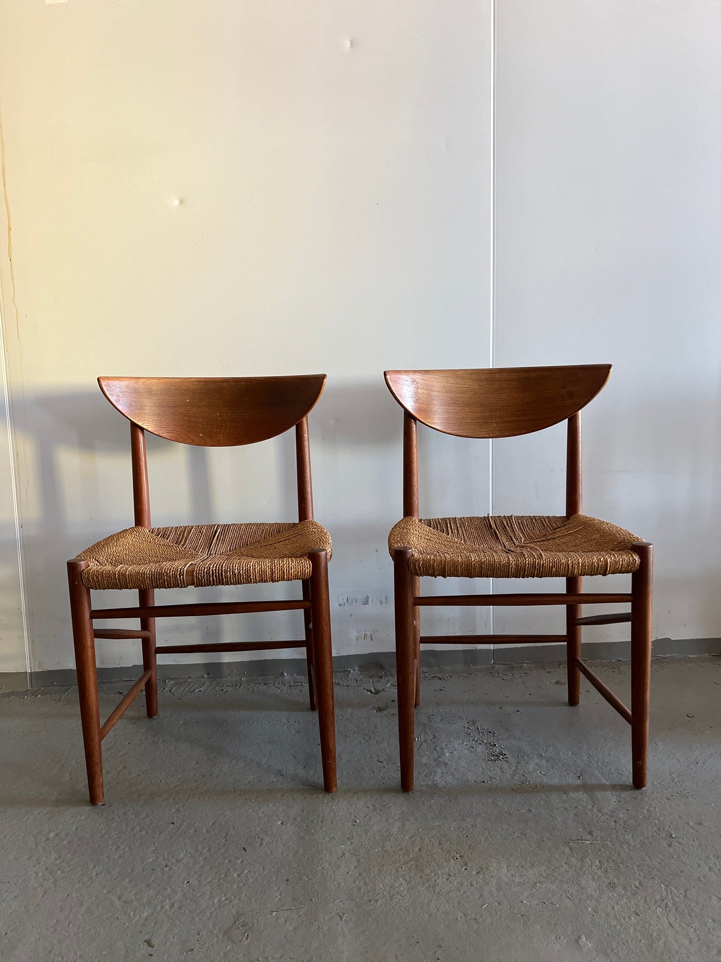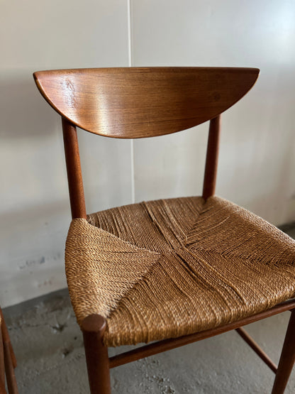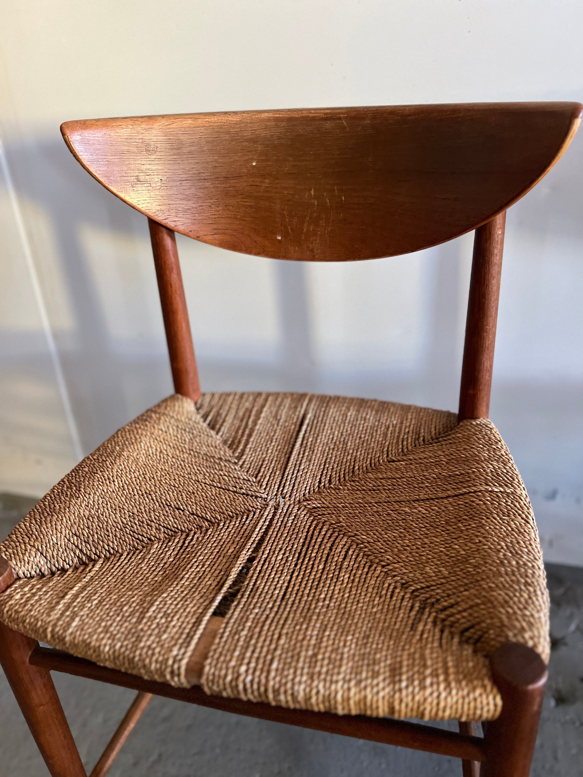 A dining chair that perfectly embodies the clean lines of mid-century design. Designed by Peter Hvidt, it's crafted from teak with a warm grain and serene proportions. The gently sloping backrest and refined lines bring comfort and presence to the table. The wood ages beautifully, its marks telling a story of use; the backrest has a minor imperfection. Whether used individually or as part of a set, it adds a subtle touch of understated elegance, blending Space Age and Danish School. A piece that seamlessly integrates material, function, and form. Timeless for everyday use.