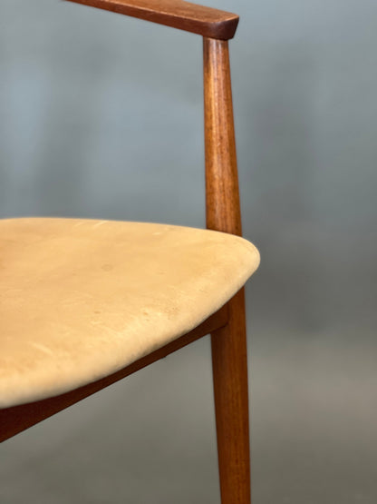 A dining chair from the 1950s, designed by Tove and Edvard Kindt-Larsen. Scandinavian clarity, calm proportions, finely drawn lines. Teak meets leather – warm in tone, pleasing to the touch. The construction is precise, the execution handcrafted. The chair appears light, yet remains stable and comfortable at the table; the leather upholstery enhances seating comfort. A piece of mid-century design with subtle space-age influences, it blends in effortlessly and makes a statement. A design that sharpens the eye for detail. For those who appreciate material honesty and understated design.