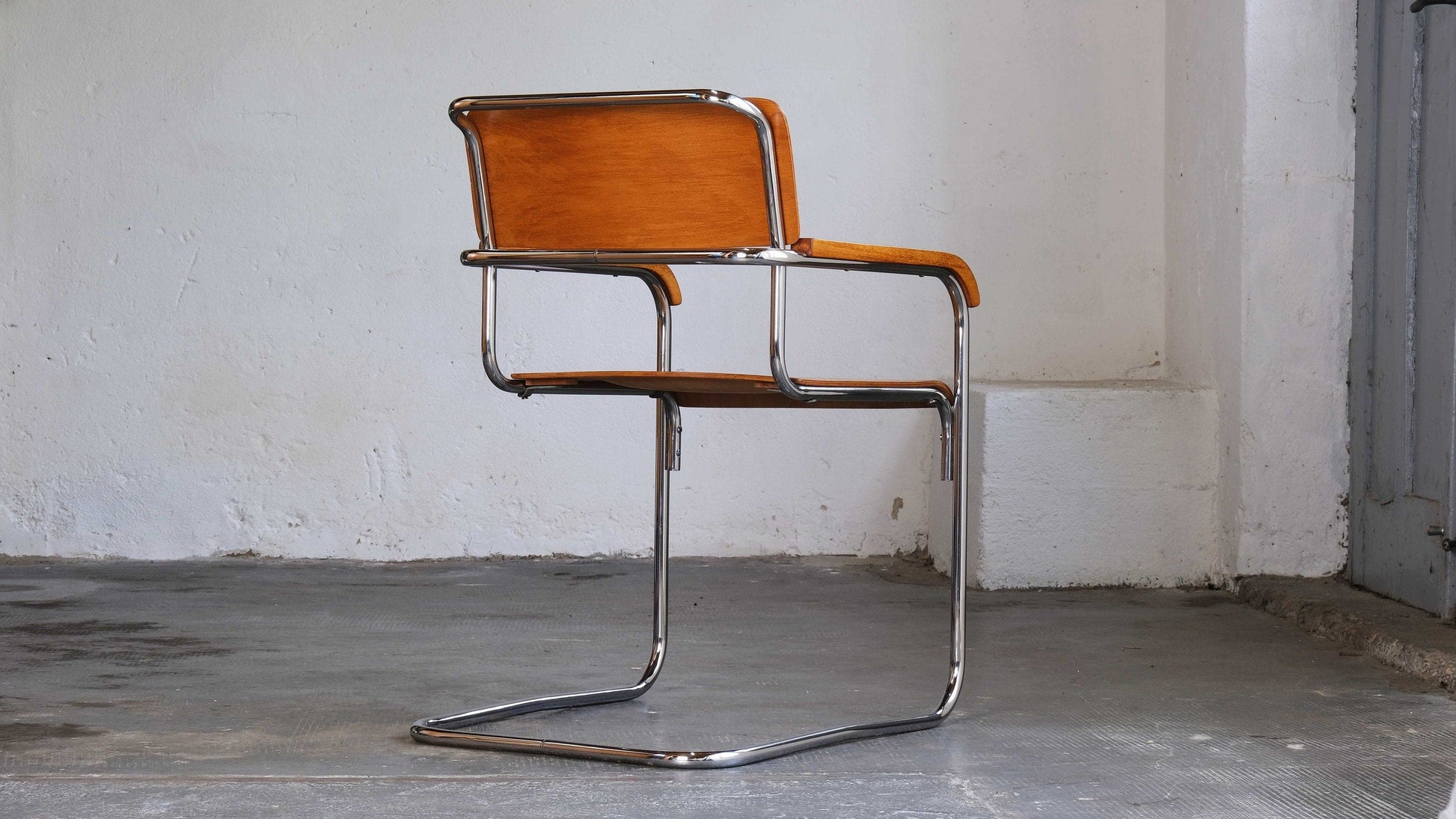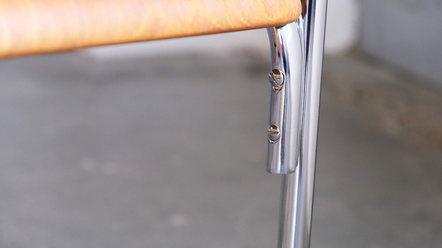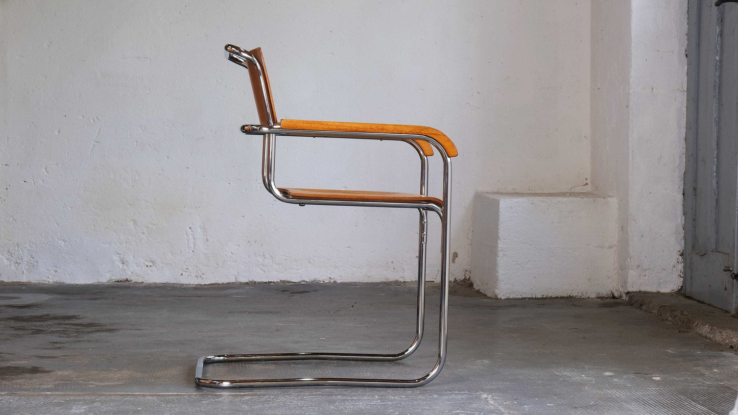 A very rare Bauhaus cantilever chair by Marcel Breuer, model B34, in restored condition. This is an older version, probably from the early 1930s. The tubular steel frame has been rechromed and the wooden elements have been repainted. The decoration is not included in the offer.