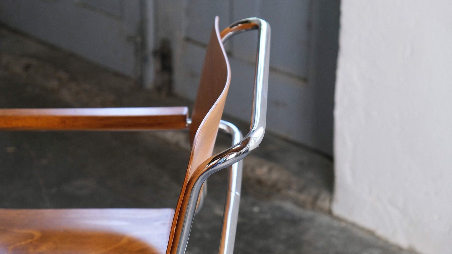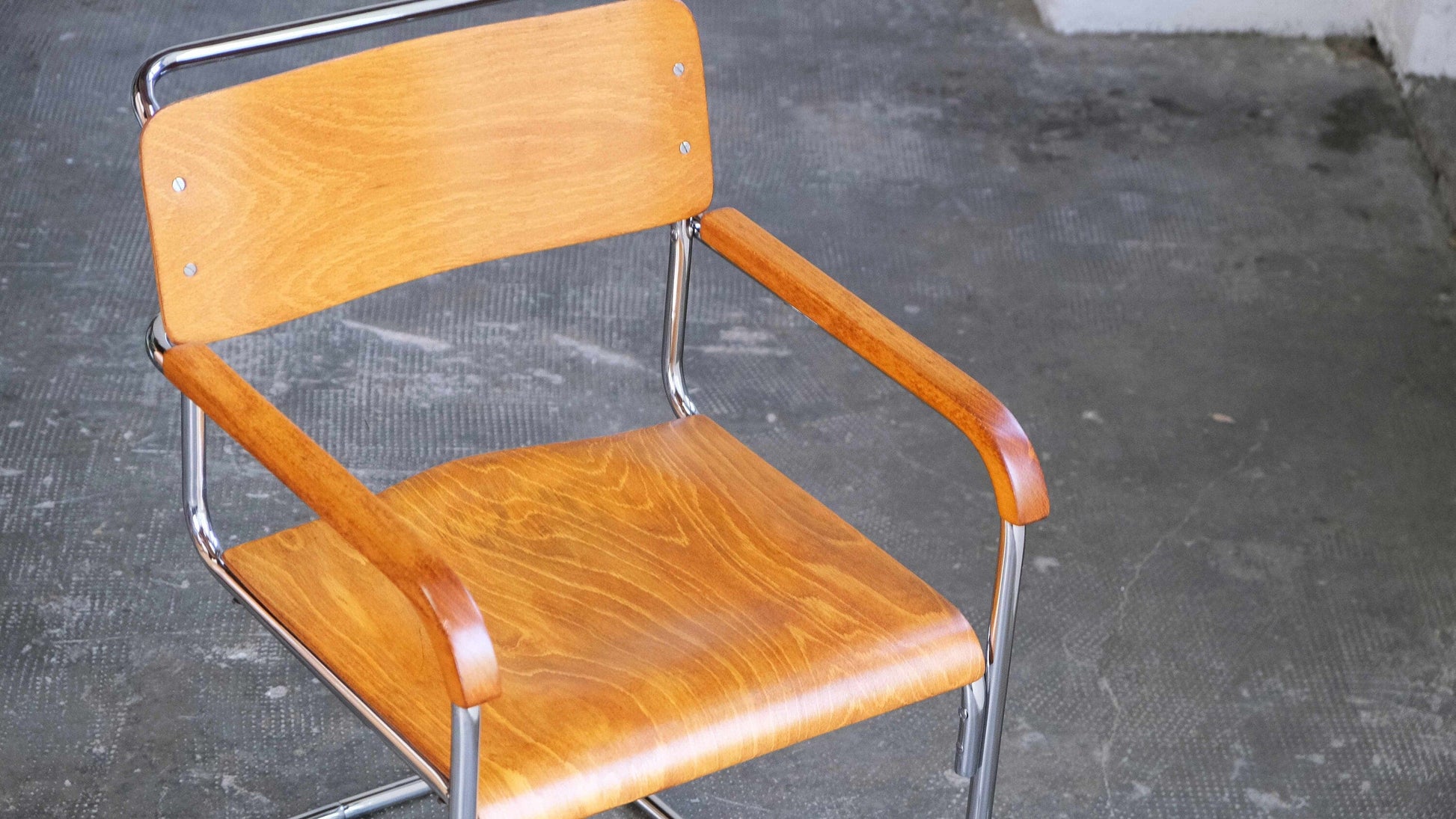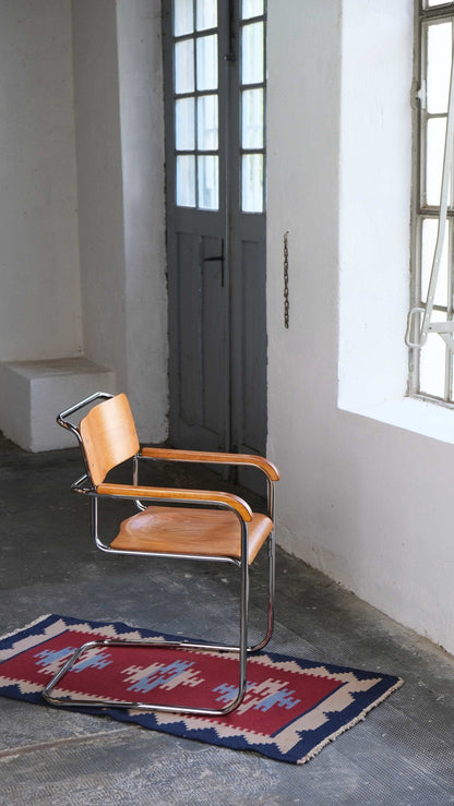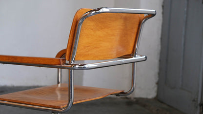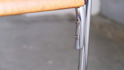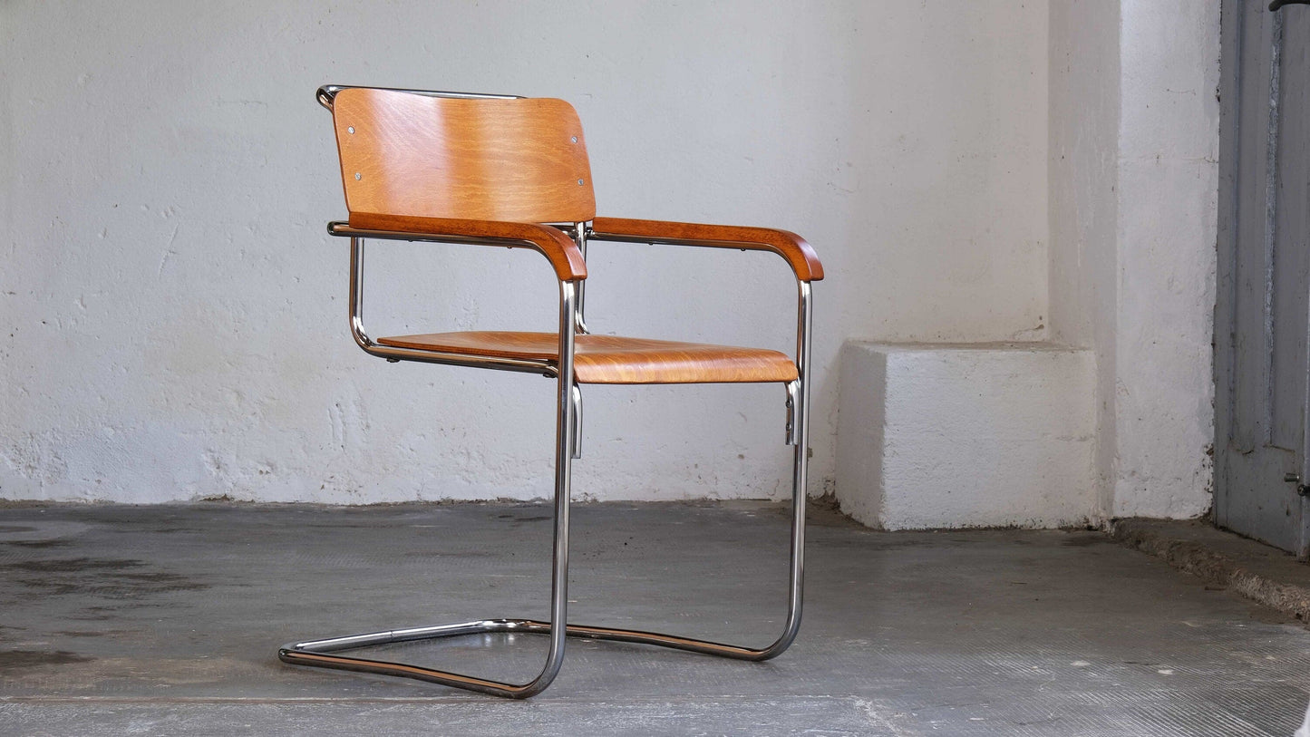 A very rare Bauhaus cantilever chair by Marcel Breuer, model B34, in restored condition. This is an older version, probably from the early 1930s. The tubular steel frame has been rechromed and the wooden elements have been repainted. The decoration is not included in the offer.