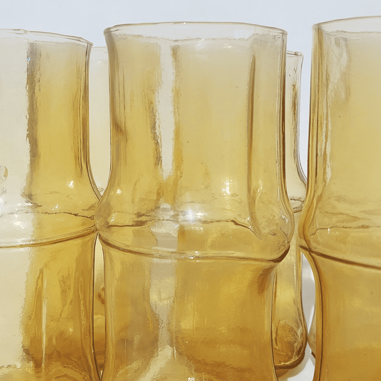 Discover the Vintage Bamboo Glass Orange Amber Set of 6, a true treasure for lovers of mid-century modern style. These unique glasses are perfect for orangeade, water, or cocktails and bring a touch of space-age elegance to your home. Each glass features a charming bamboo shape and radiates a warm, orange amber hue. The combination of shape and color makes this set a real eye-catcher on any table.