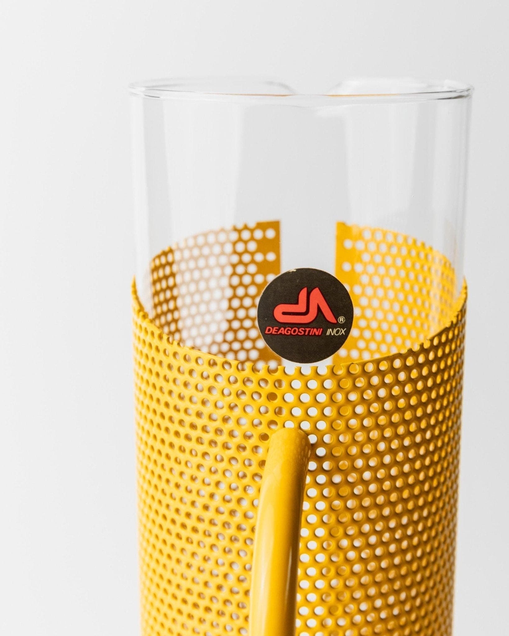 Discover the charm of the 80s with this vintage glass pitcher from De Agostini. Combining colorful design with practical functionality, the pitcher is a real eye-catcher on any table. The perforated yellow metal handle and glass muddler give the pitcher a unique Memphis style, known for its bold and playful designs. Perfect for serving iced tea, long drinks, or punch, this pitcher is not only a practical item but also a stylish decorative piece.