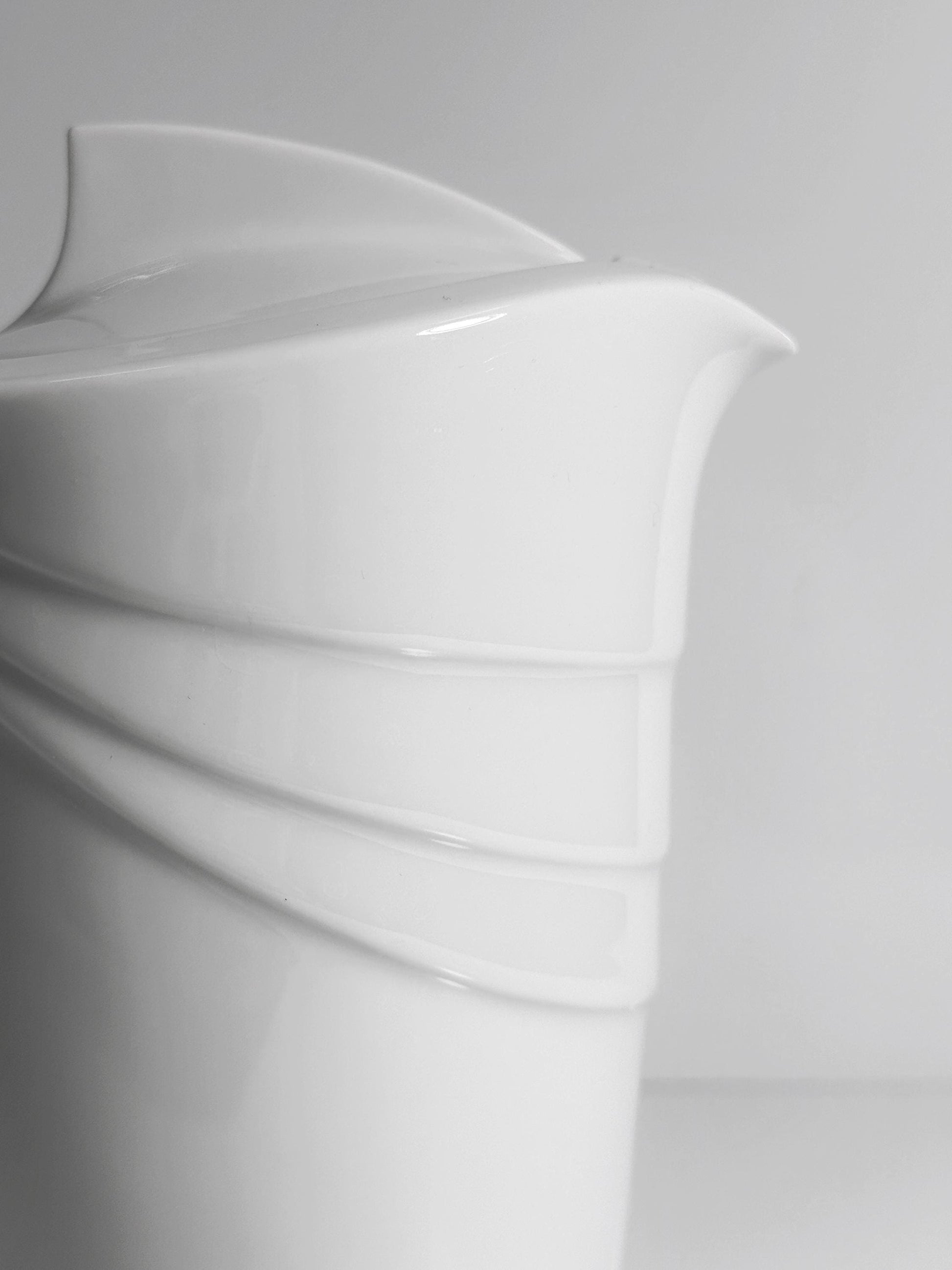 Experience the charm of a bygone era with this vintage Art Deco Revival-style teapot from the 1980s. The elegant white porcelain and striking design make it a real eye-catcher—whether as a stylish teapot, for coffee, or as a decorative Space Age object. The teapot sits comfortably in the hand and pours without dripping thanks to its sophisticated design. Perfect for anyone who appreciates mid-century modern aesthetics and exceptional quality.