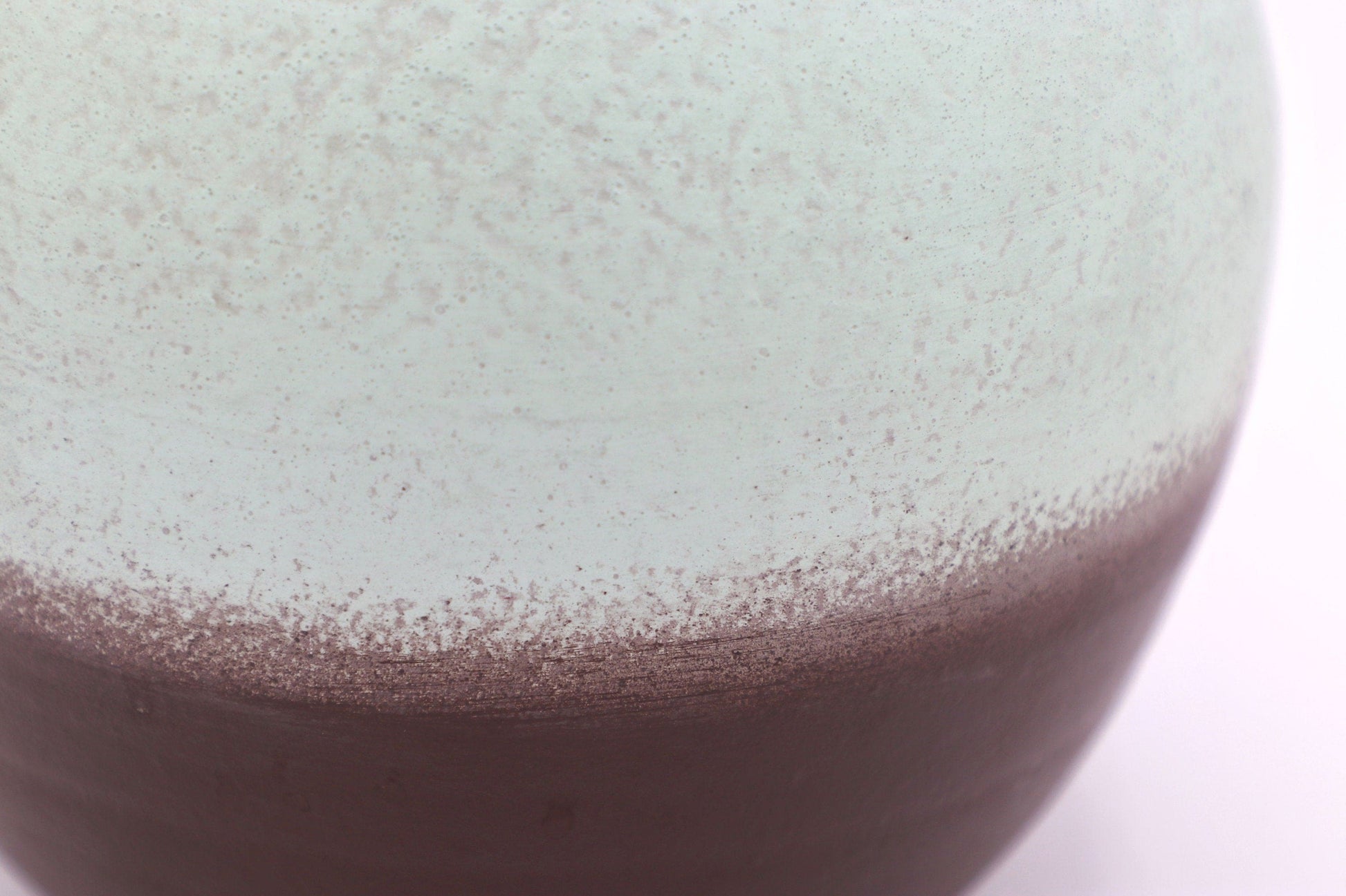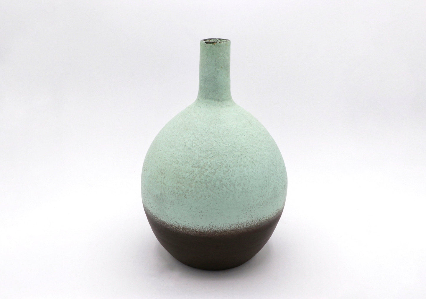 Brown, rough ceramic, covered from above with mint green, thick glaze in lava look