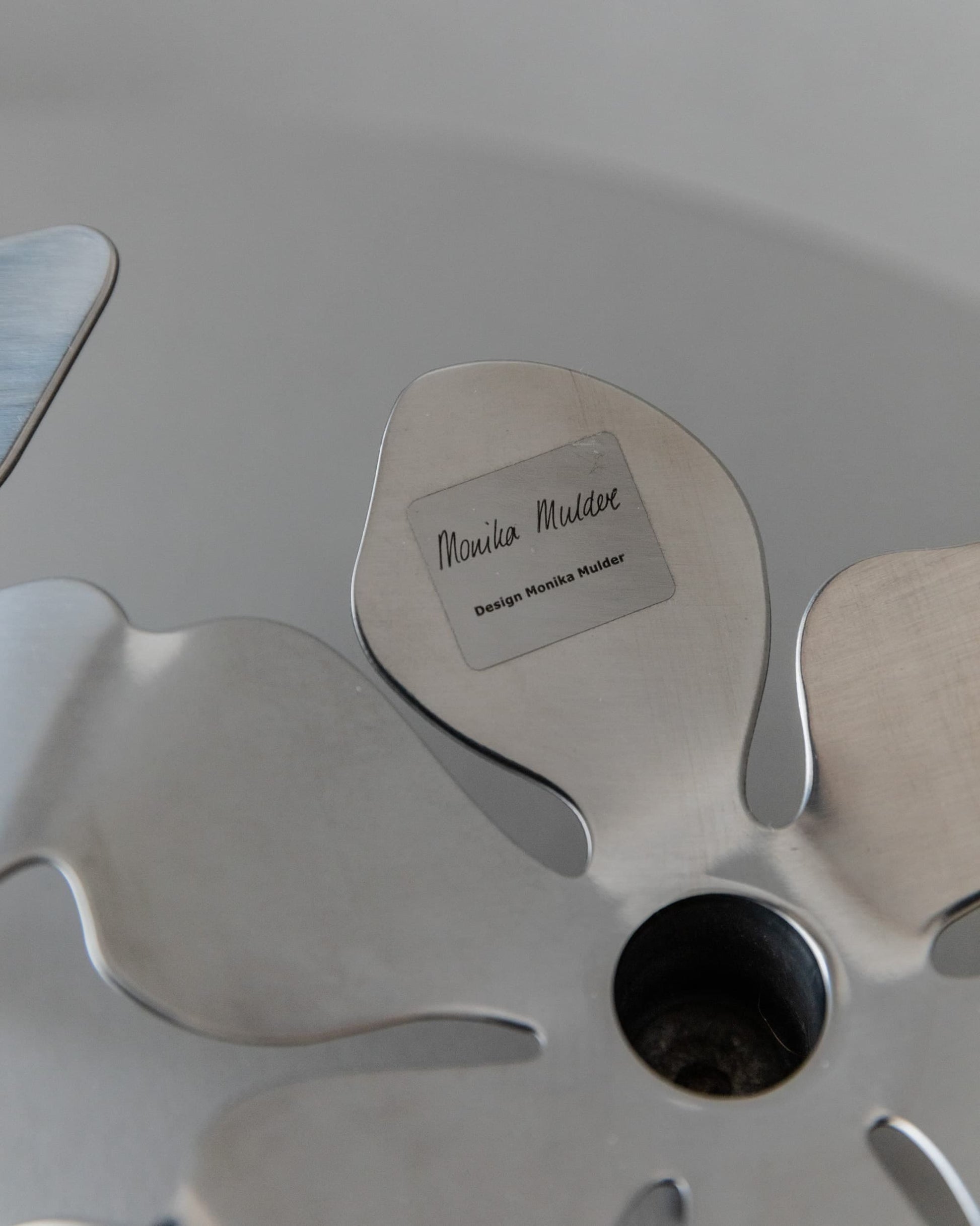 Discover the charm of the 1990s with this vintage flower-shaped candle holder, designed by renowned designer Monica Mulder for Ikea. This unique piece combines the simple elegance of stainless steel with a timeless, abstract design that will add a special touch to any room. Whether as a stylish gift or as an elegant accessory in your home, this candle holder is a real eye-catcher. The combination of functionality and aesthetics makes it an indispensable element for lovers of mid-century modern and space age design.