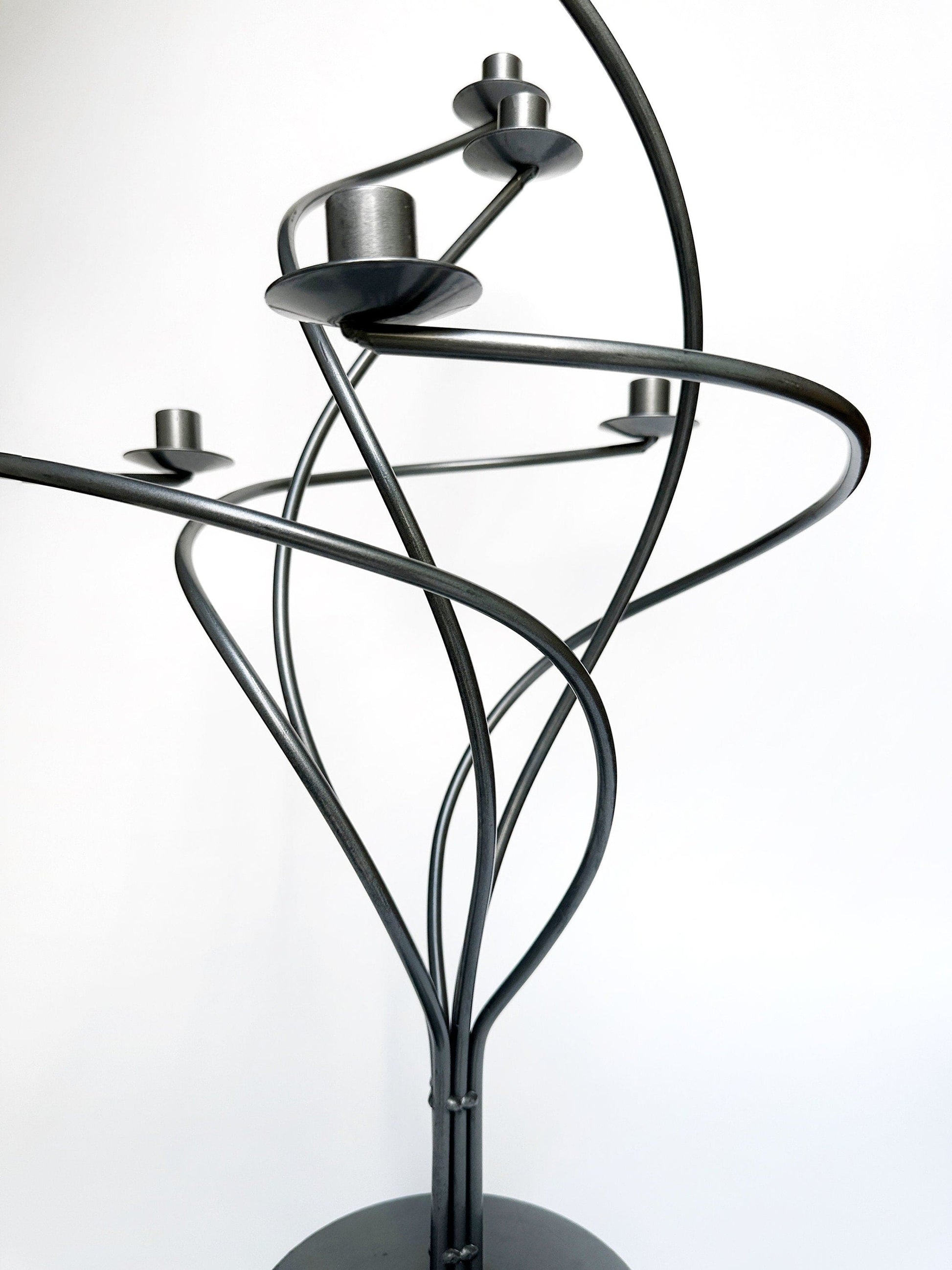 Immerse yourself in the fascinating world of Space Age design with this extraordinary vintage metal candlestick. The black metal has been artfully bent into a striking spiral, giving the candelabra a distinctive postmodern character. Inspired by the legendary Memphis Milano style of the late 1980s and early 1990s, this piece is a true highlight for lovers of mid-century modern and vintage home accessories. The excellent quality and iconic design make this candleholder a true collector's item.