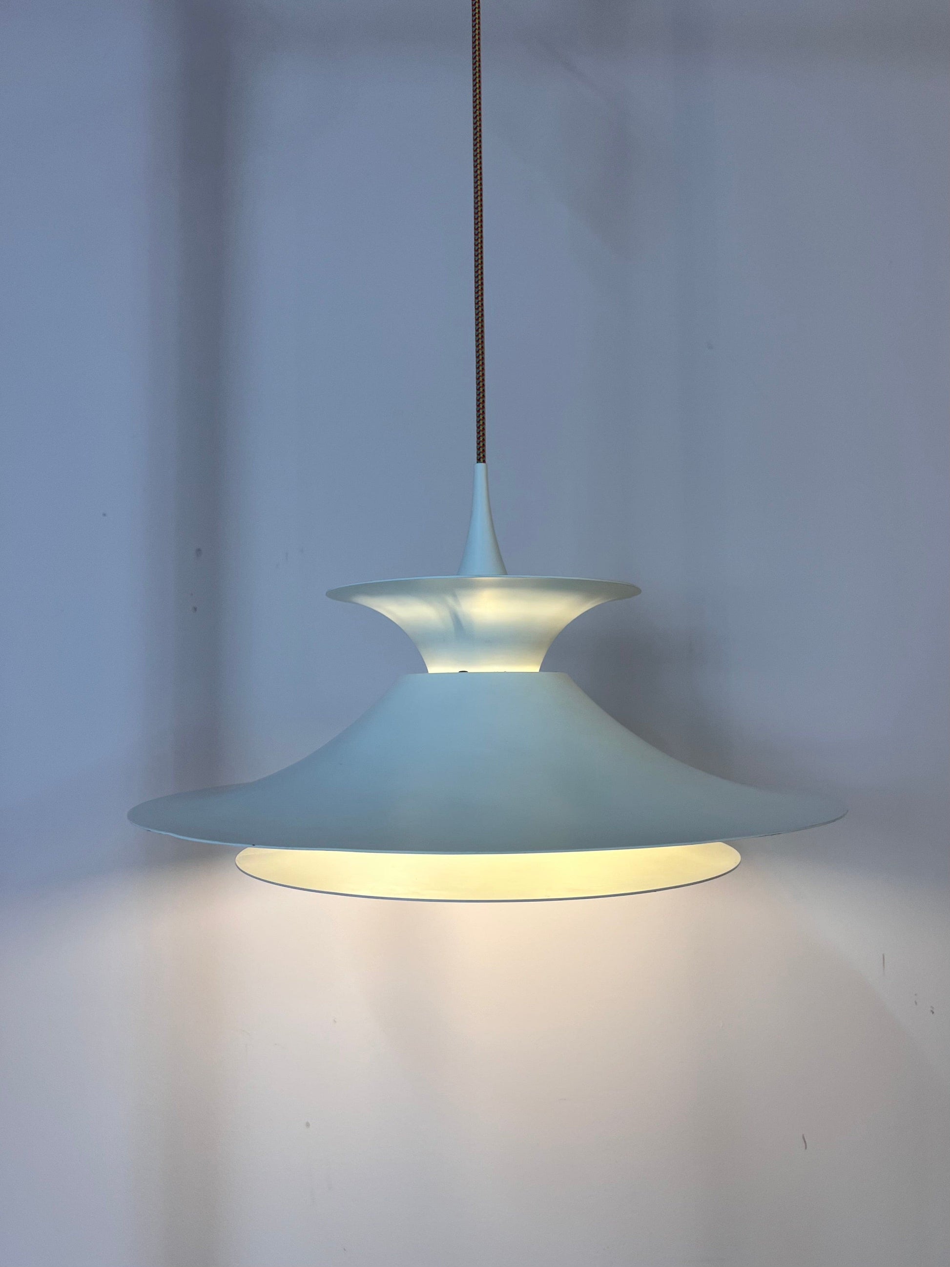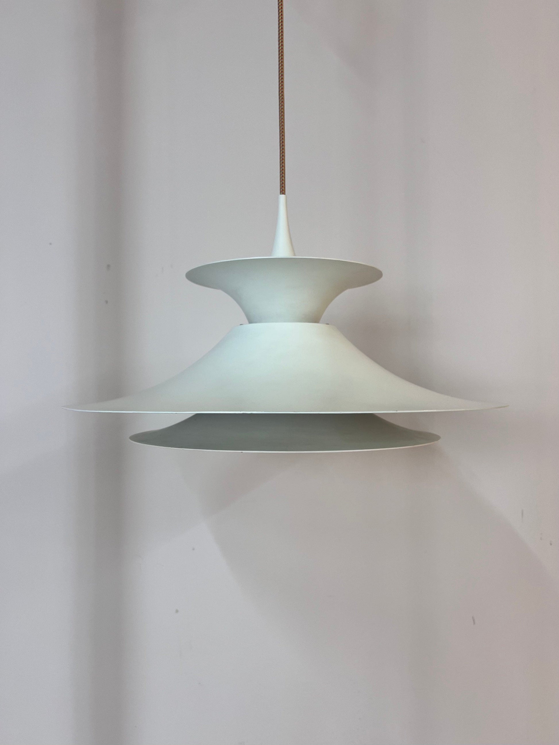 The vintage "Radius" slatted lamp by Erik Blaslev for Fog & Mørup brings the timeless charm of the 1960s directly into your home. Its modern, white design stylishly enhances any room and provides pleasant, even lighting. Its generous size makes it a focal point above the dining table or in the living room. Enjoy cozy light immediately, as an LED bulb is included.
