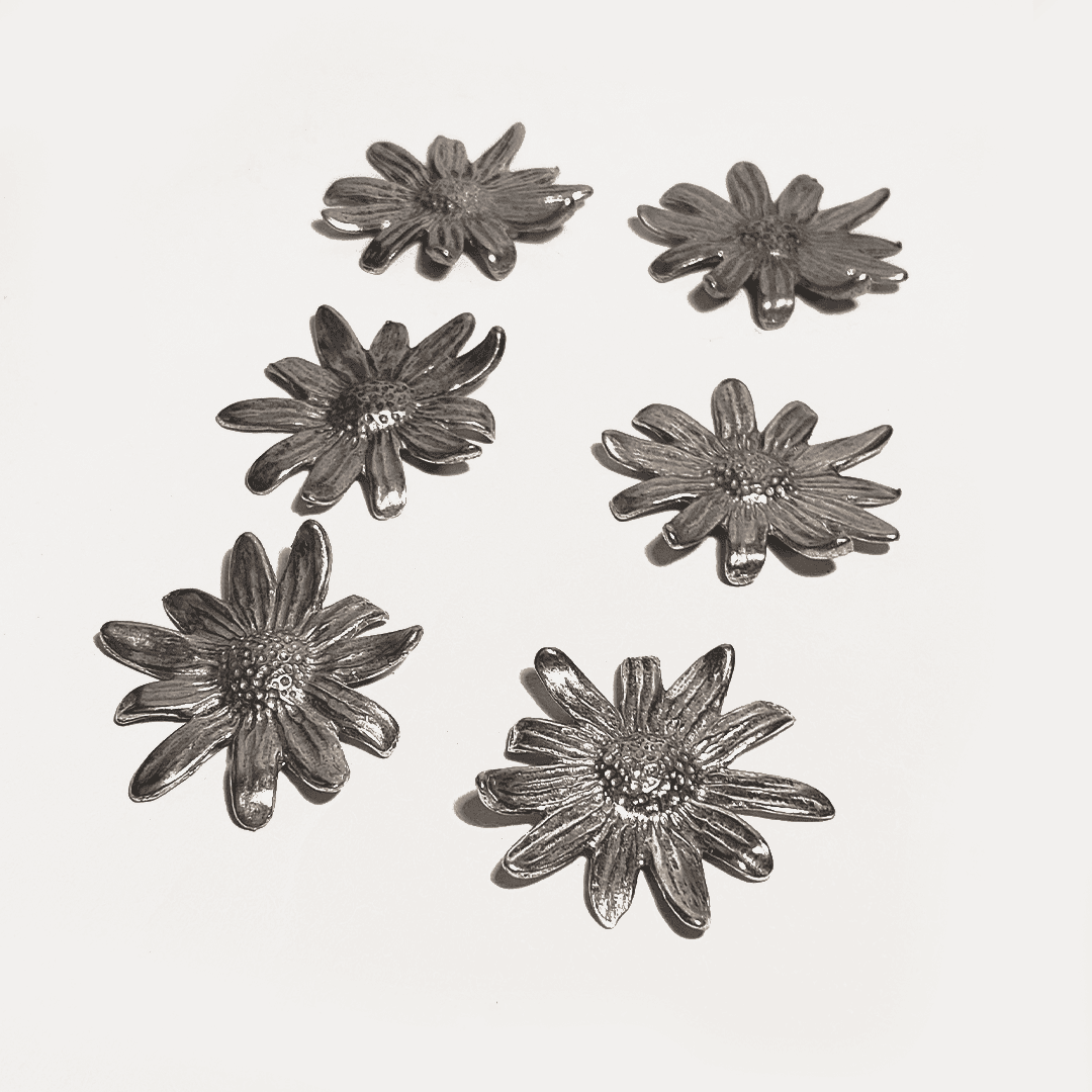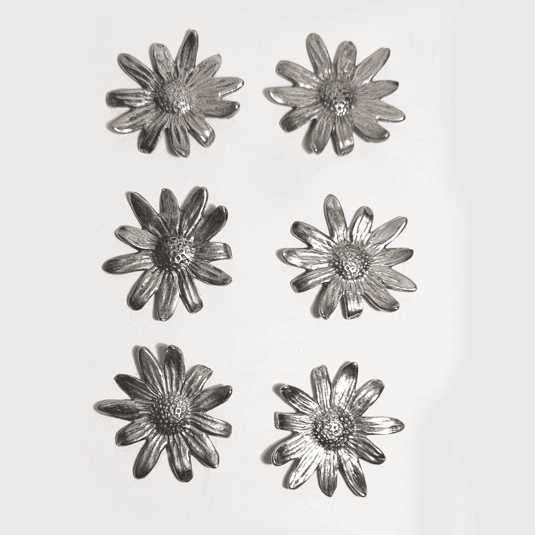 Discover the charming set of six vintage Flora pewter knife rests, which will add a poetic touch to your table. These unique knife rests are not only functional but also a real eye-catcher that will delight your guests. With their floral design, they blend seamlessly into any table setting and add a touch of elegance. Perfect for lovers of mid-century modern and space-age styles looking for special accents.