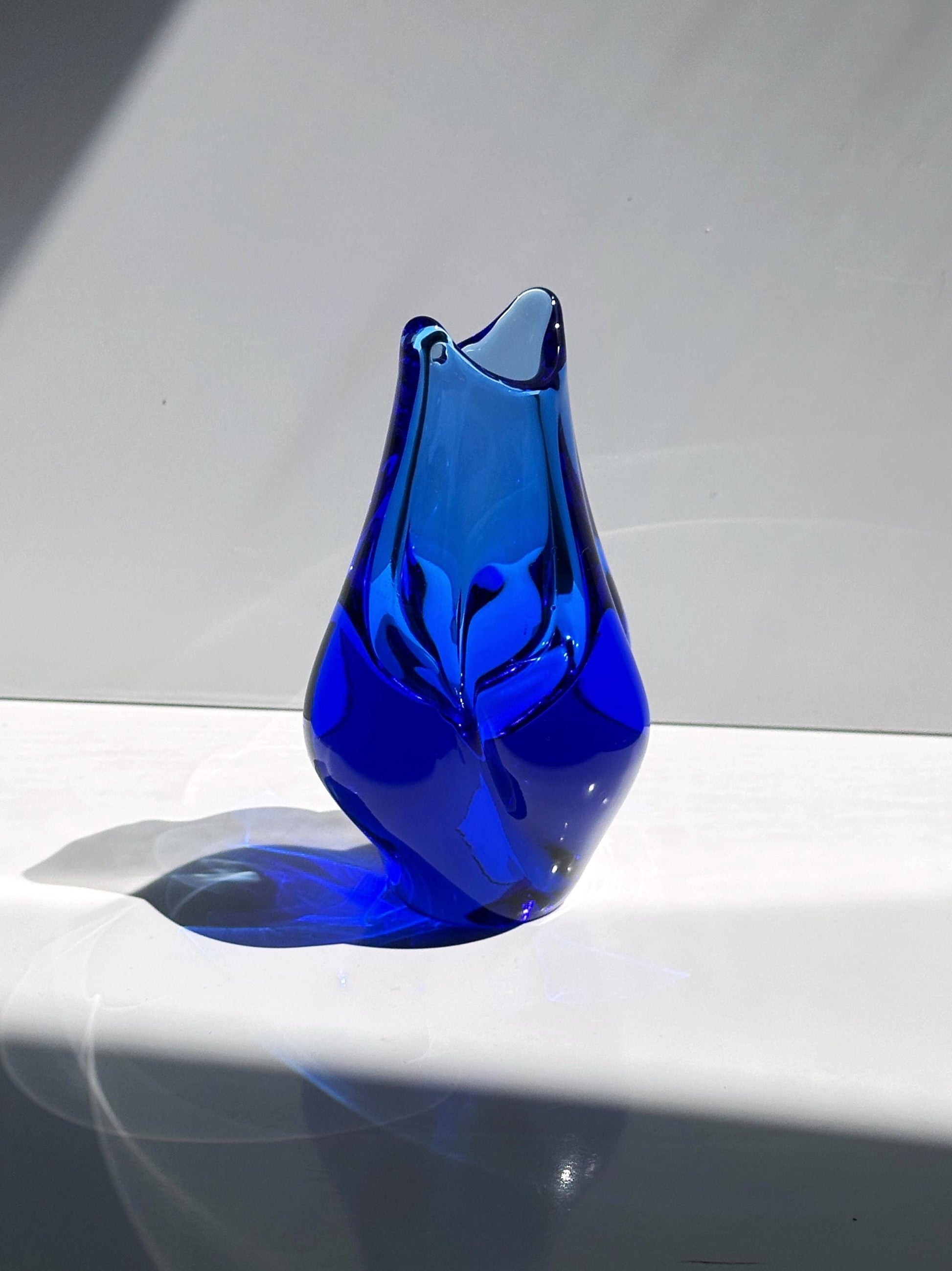 Discover the timeless elegance of Miroslav Klinger's vintage mini glass vase in intense cobalt blue. This solifleur vase was designed for the renowned Zelezny Brod glass manufacturer and impresses with its characteristic mid-century modern design. The bold, vibrant blue makes it a real eye-catcher in any room and underscores the Space Age aesthetic of the 1960s. The vase is perfect for individual flowers or as a decorative object in your collection.