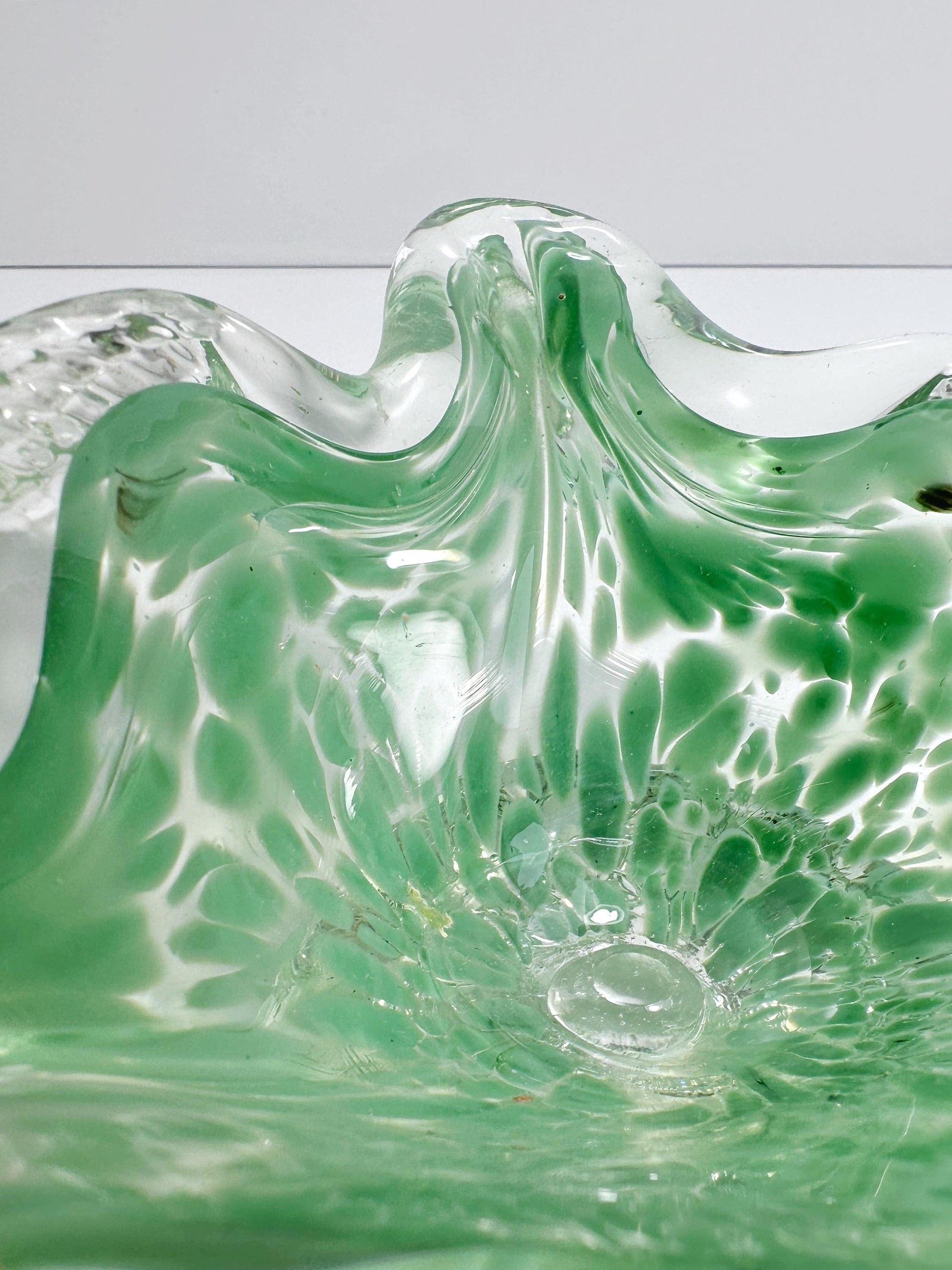 Immerse yourself in the fascinating world of Space Age design with this vintage Murano ashtray from the 1970s. The pastel green speckled glass, artfully combined with transparent glass, gives this piece an extraordinary appeal. The elegant triangular shape makes the ashtray a real eye-catcher and underlines the unmistakable mid-century modern style. A stylish collector's item that adds a touch of Italian craftsmanship and superior quality to any room.