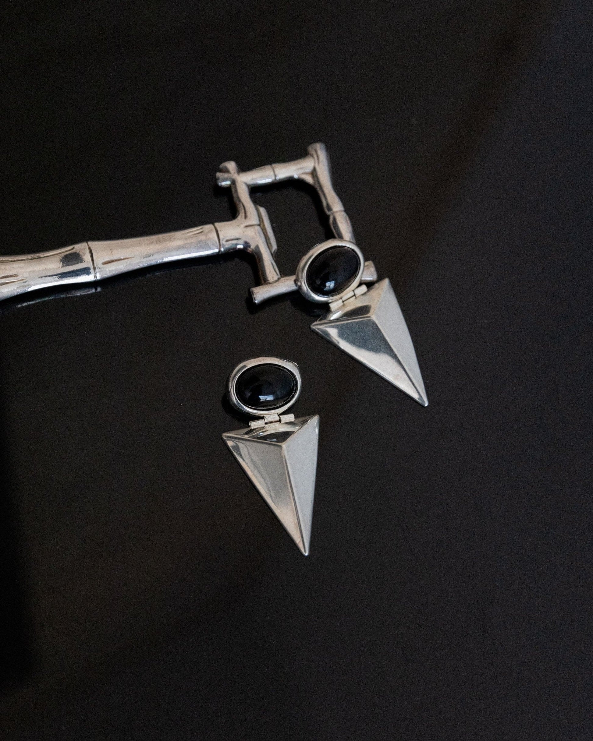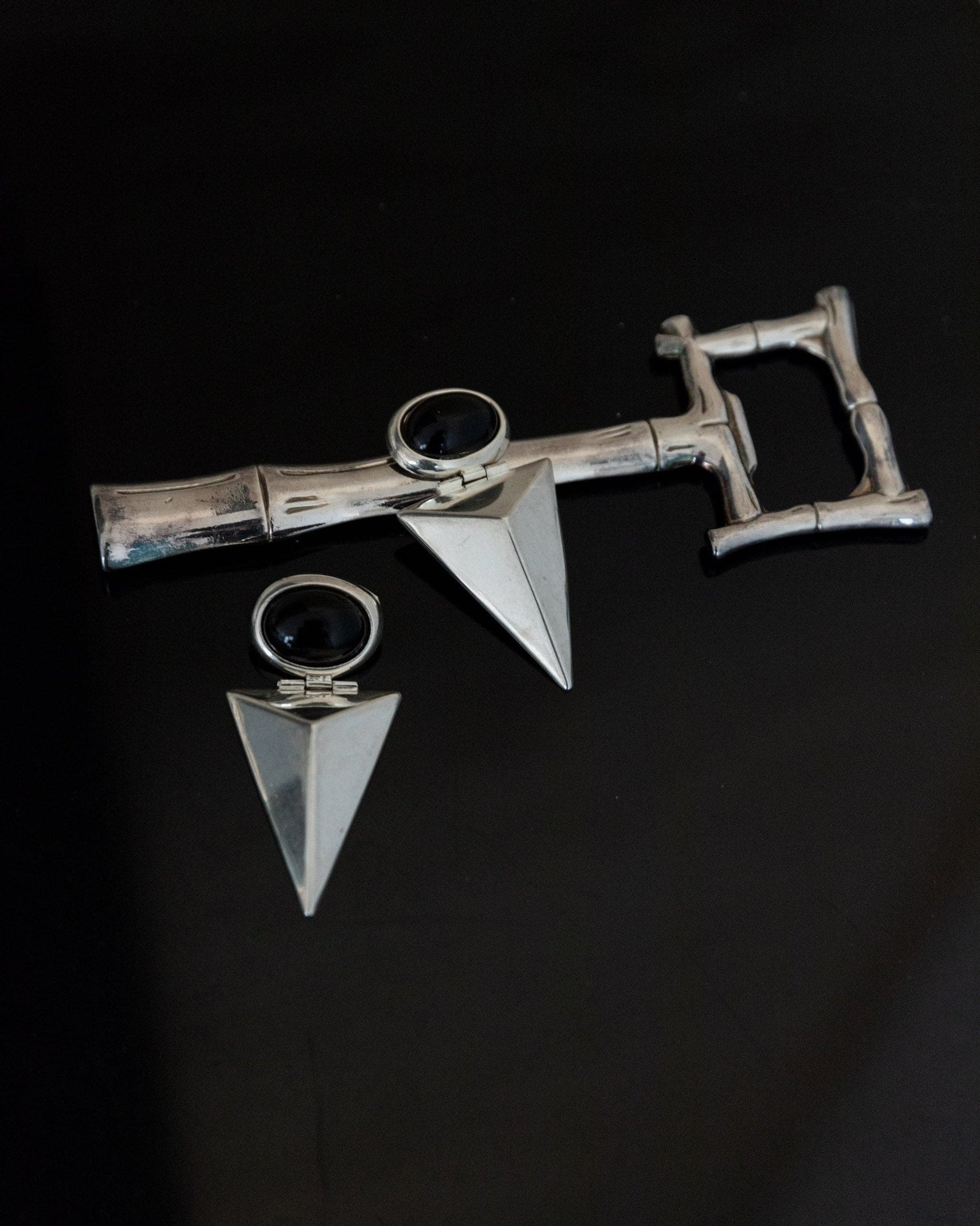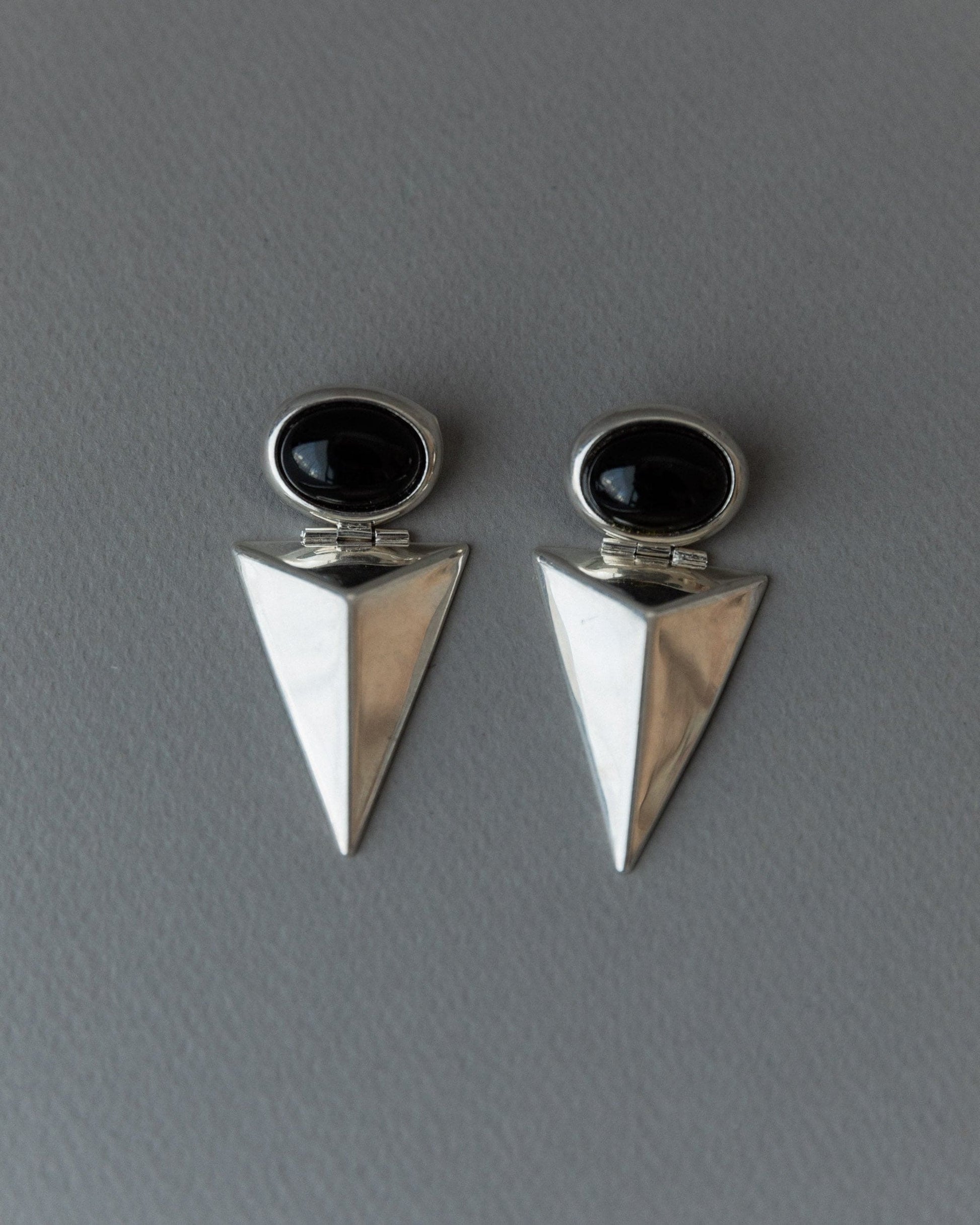 Discover the timeless elegance of the vintage silver and onyx earrings, which date back to the 1970s. Combining a modernist design with a touch of retro charm, these earrings are a perfect gift for lovers of unique jewelry. The triangular shape and oval onyx insert give them a special sophistication that impresses both in everyday life and on special occasions. Lightweight and comfortable to wear, they are a must-have for every jewelry lover.