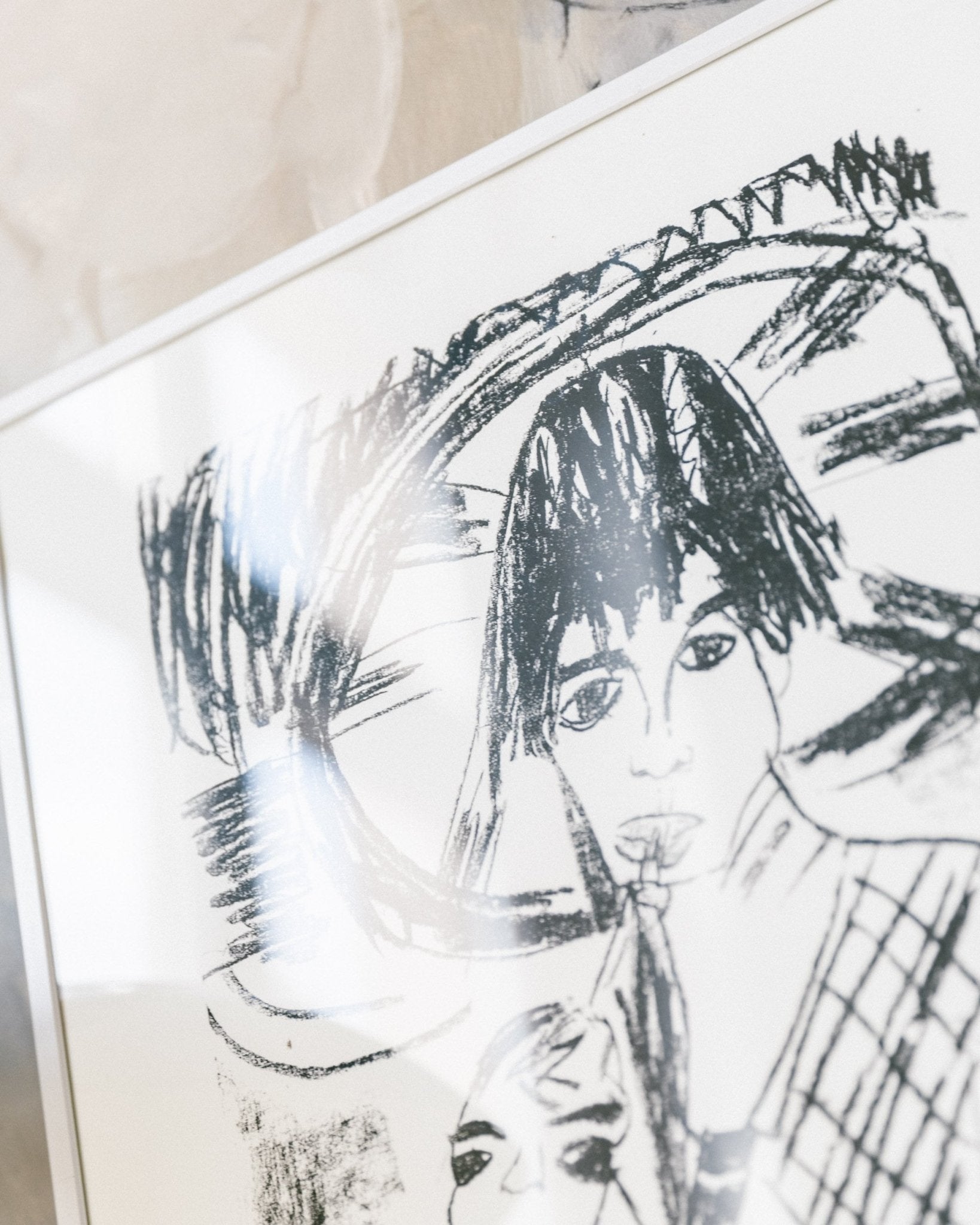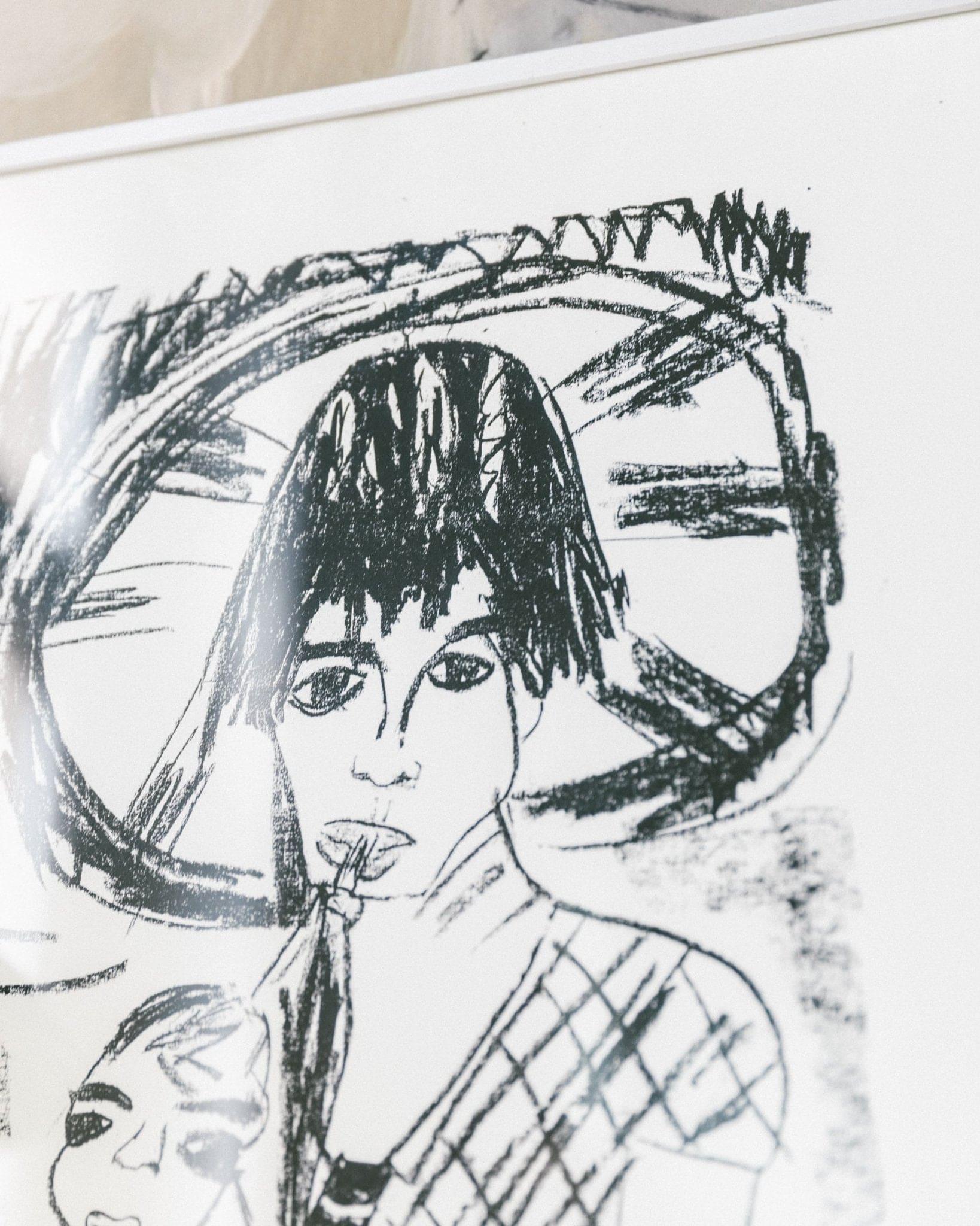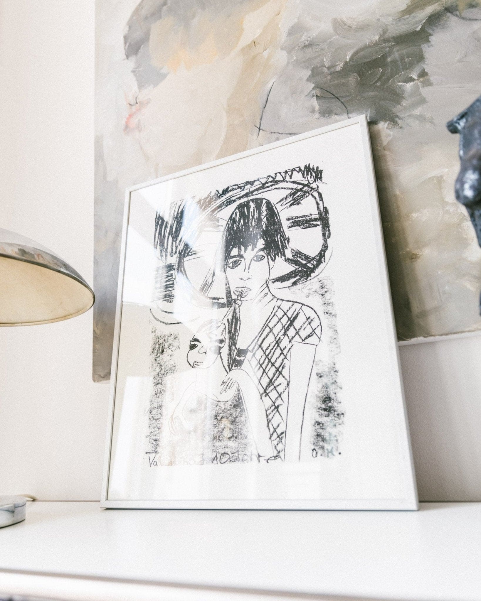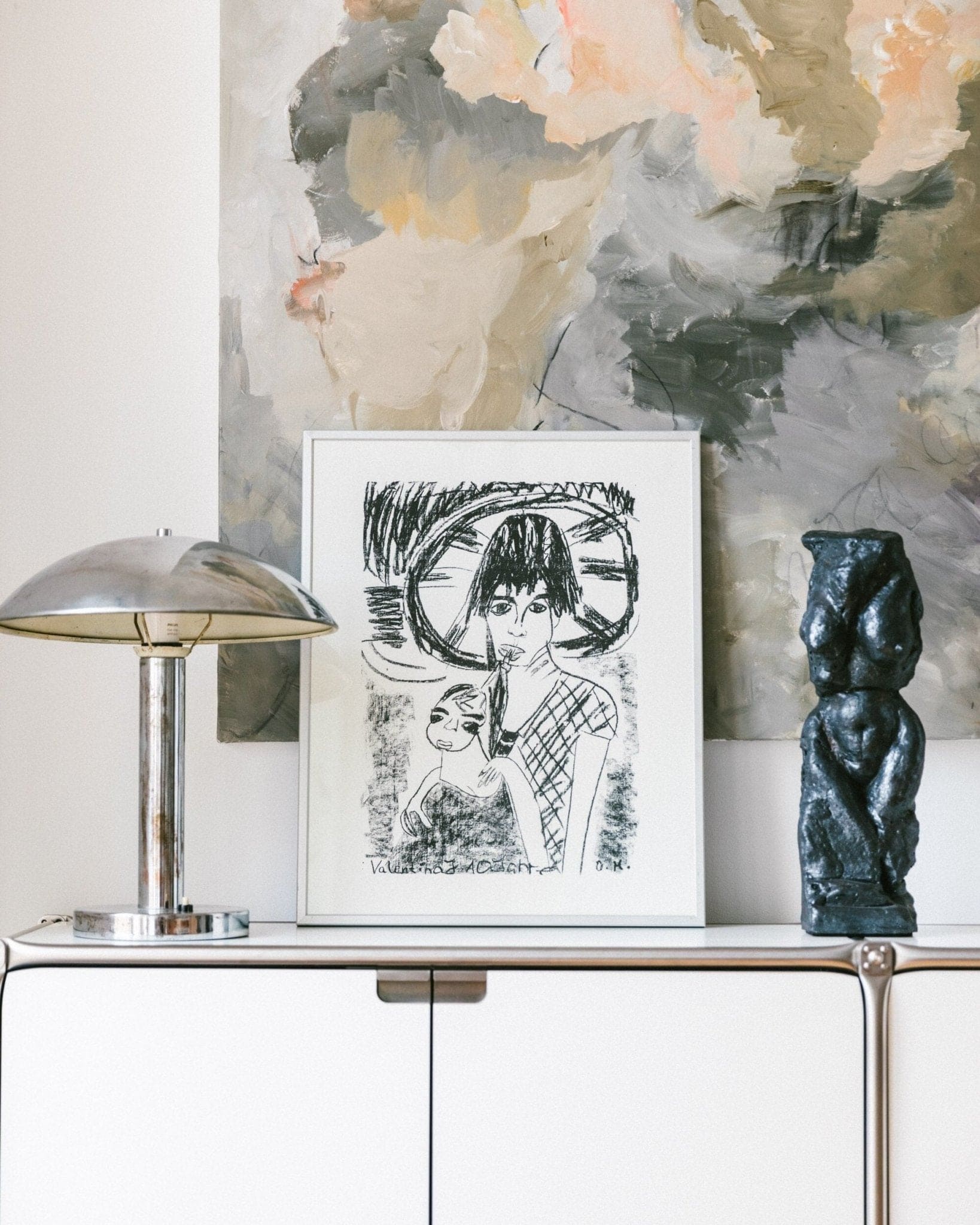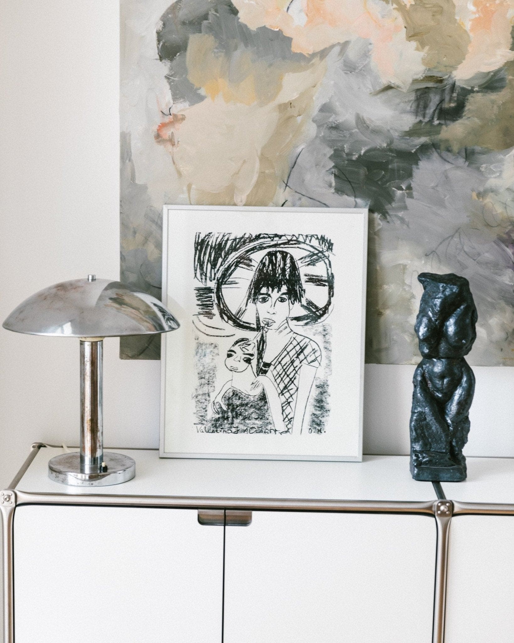 Discover a unique vintage portrait print from the 1980s, depicting a father, mother, and child in a lovingly drawn scene. This work of art brings the charm of the Space Age and mid-century modern era directly into your living room and is a true eye-catcher for any style-conscious interior. The high-quality aluminum frame underscores the timeless design and ensures an elegant presentation on your wall. With its excellent quality and authentic vintage character, this picture is a must-have for collectors and lovers of special home accessories.