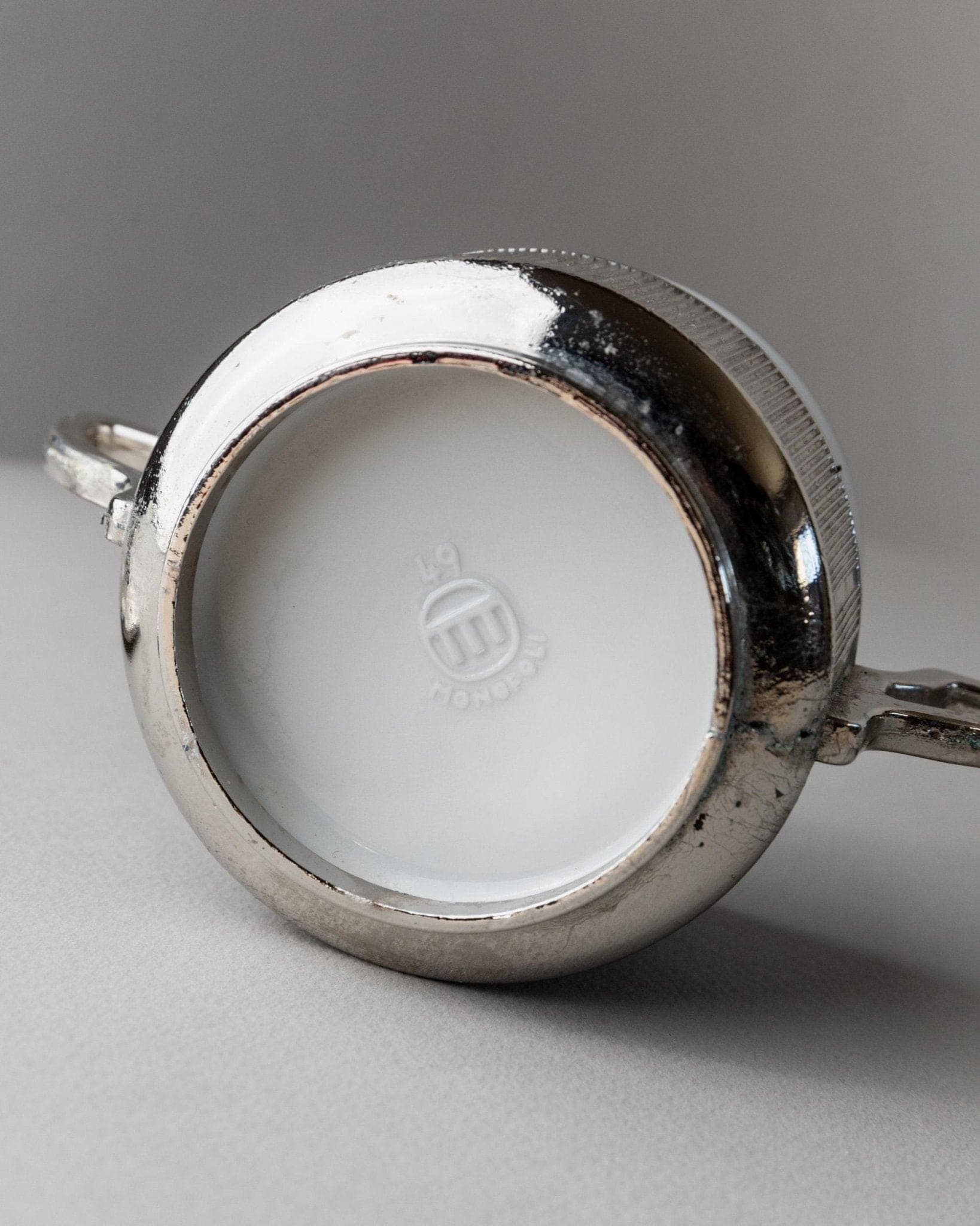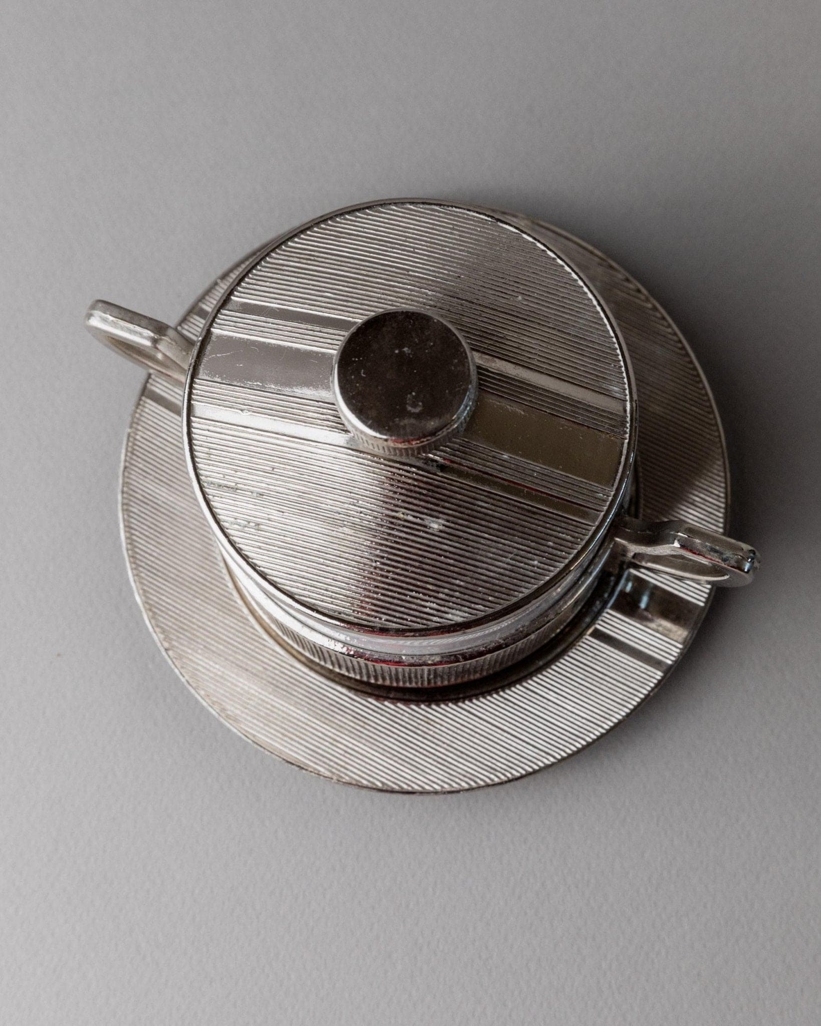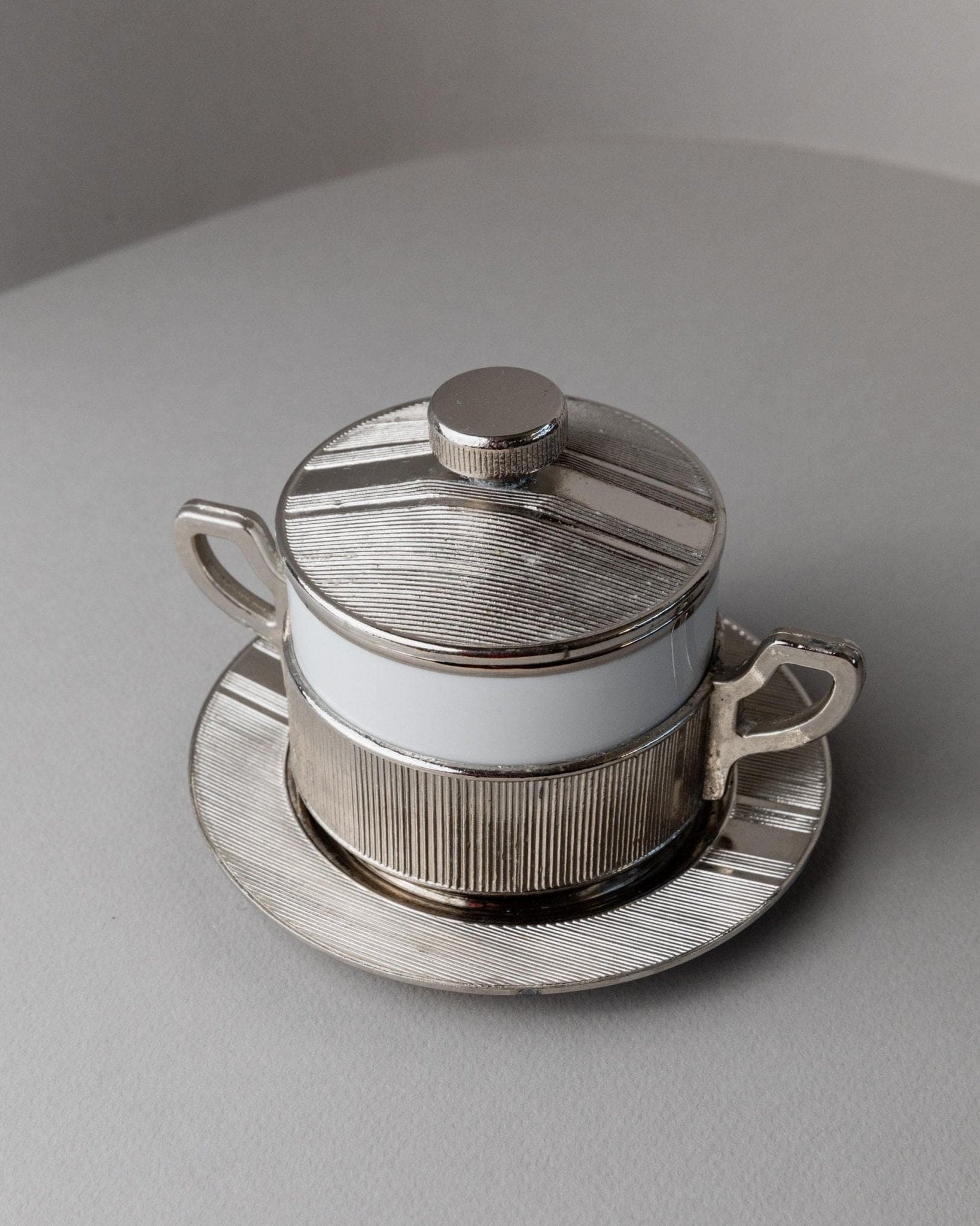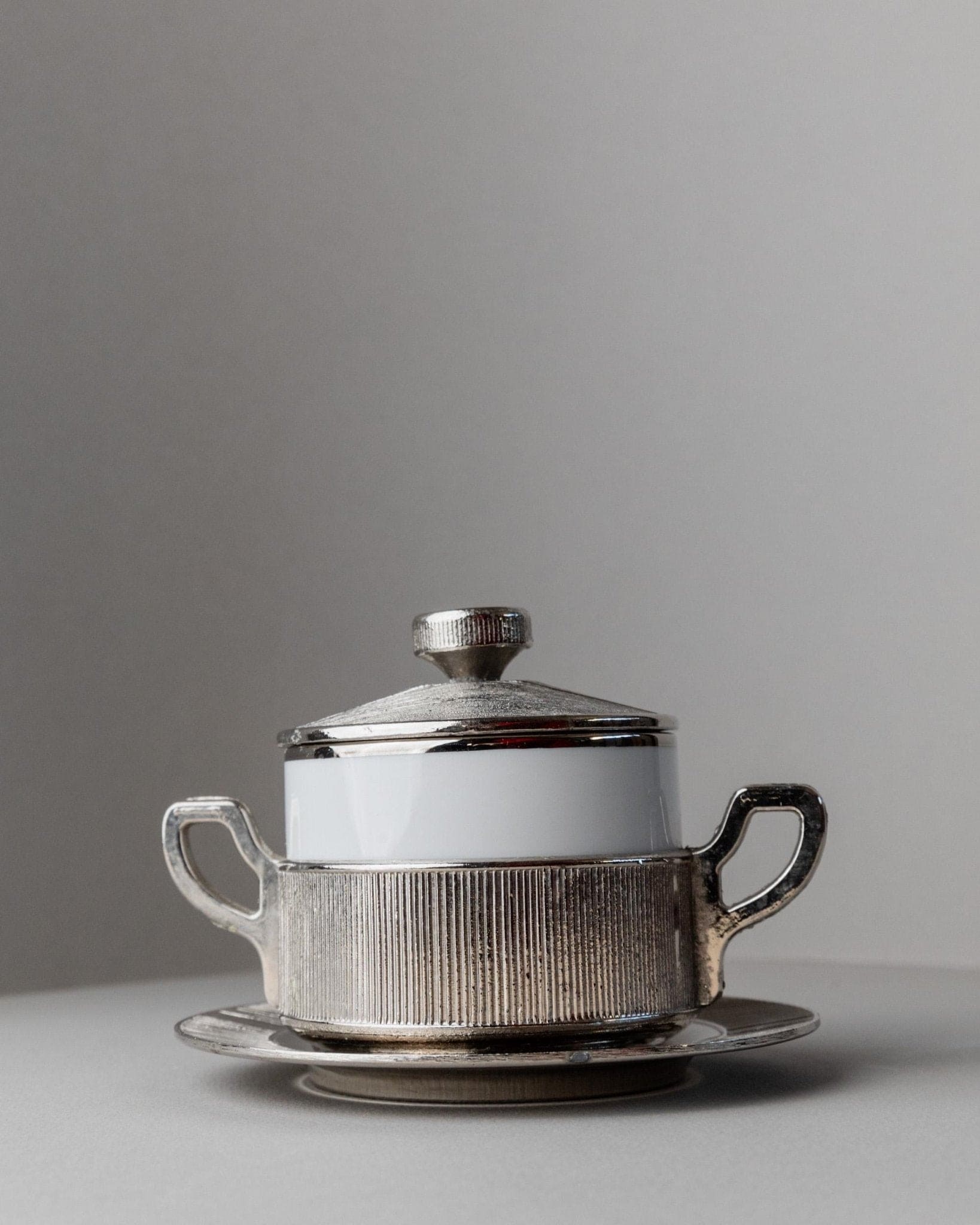 This vintage porcelain bowl with a silver-plated lid from the 1950s by Monopoli, Italy, is a charming and elegant table setting. Perfect for sugar, sauces, mustard, or jam, its textured lid and matching saucer add a touch of timeless beauty to your table setting. The sophisticated design makes it an ideal gift idea or a decorative addition to your dining area.