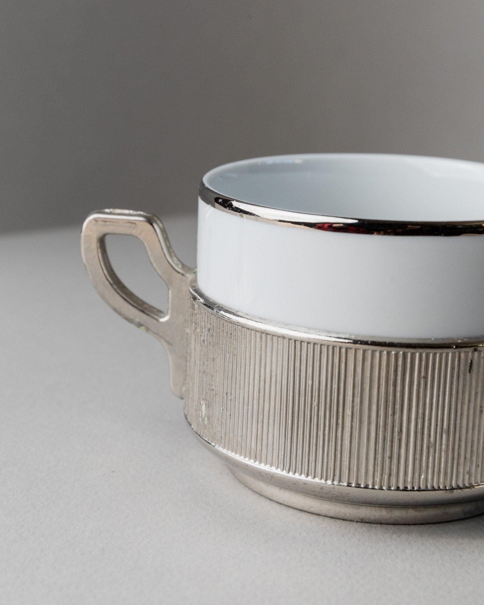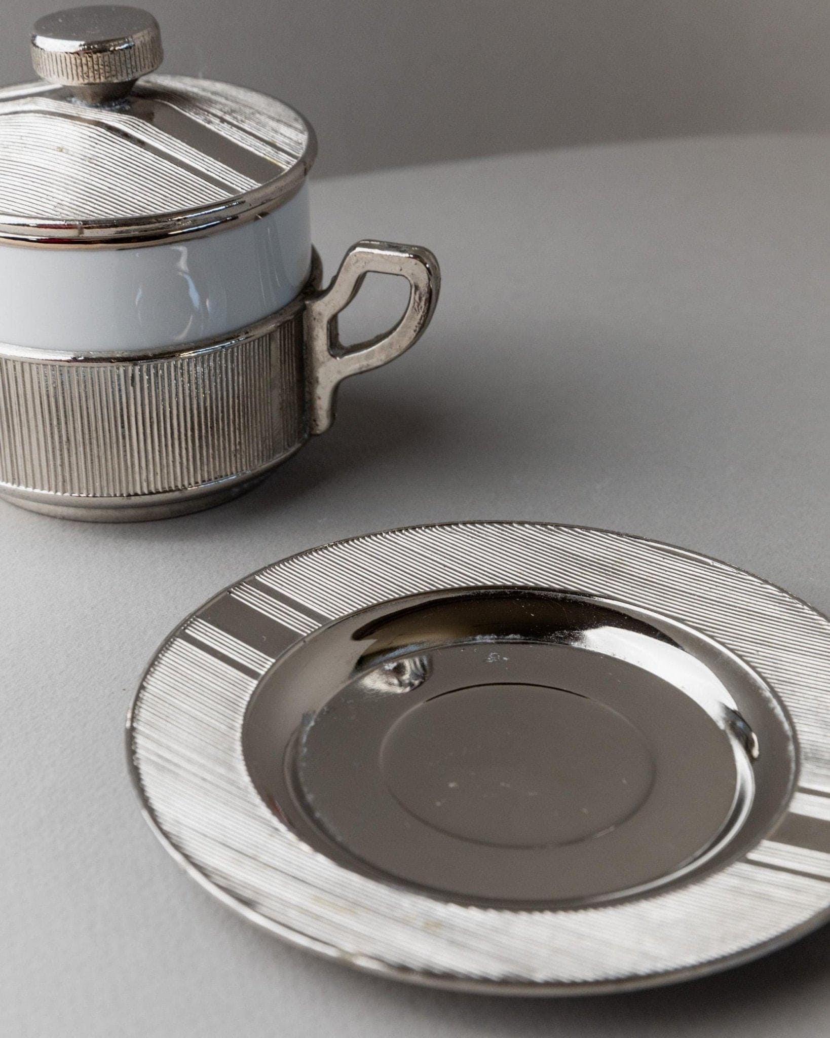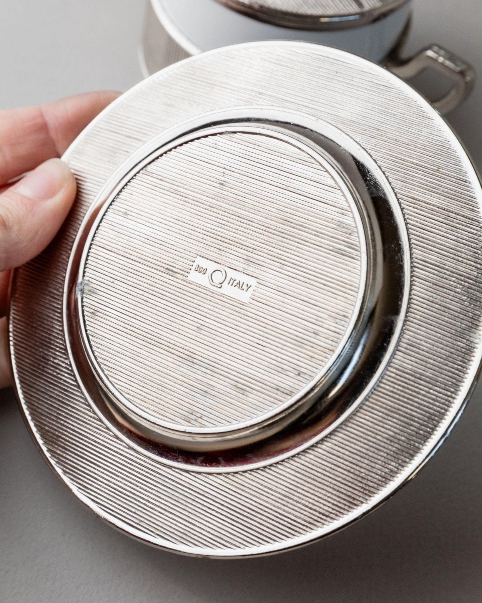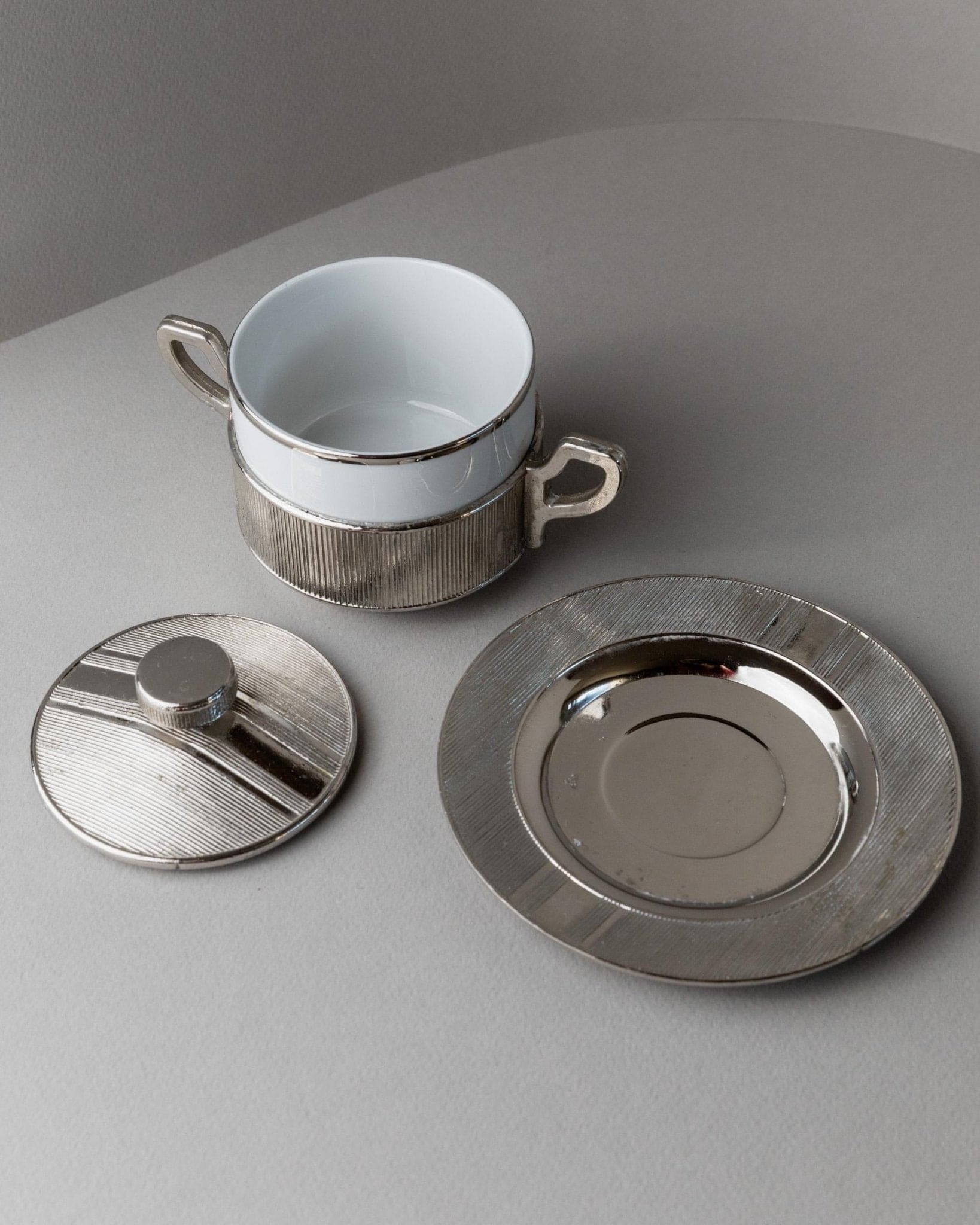 This vintage porcelain bowl with a silver-plated lid from the 1950s by Monopoli, Italy, is a charming and elegant table setting. Perfect for sugar, sauces, mustard, or jam, its textured lid and matching saucer add a touch of timeless beauty to your table setting. The sophisticated design makes it an ideal gift idea or a decorative addition to your dining area.