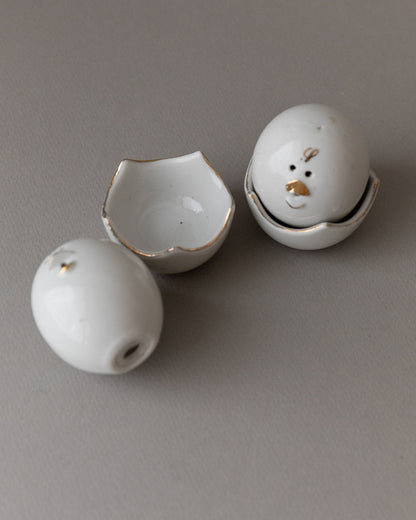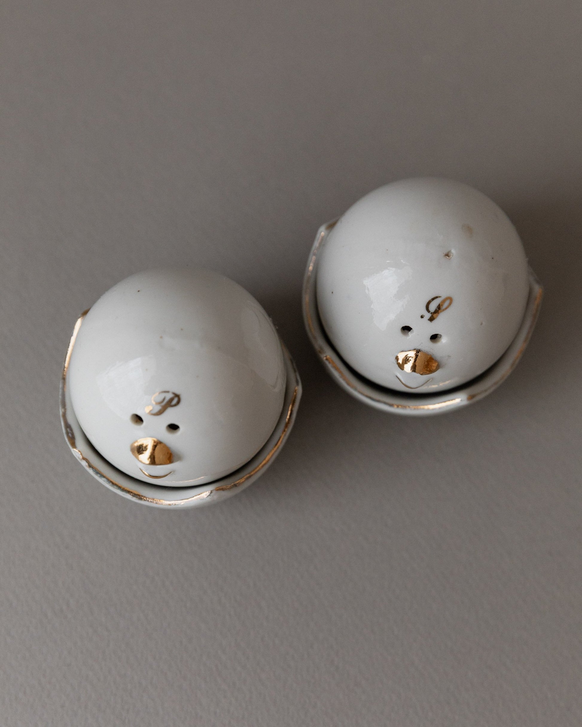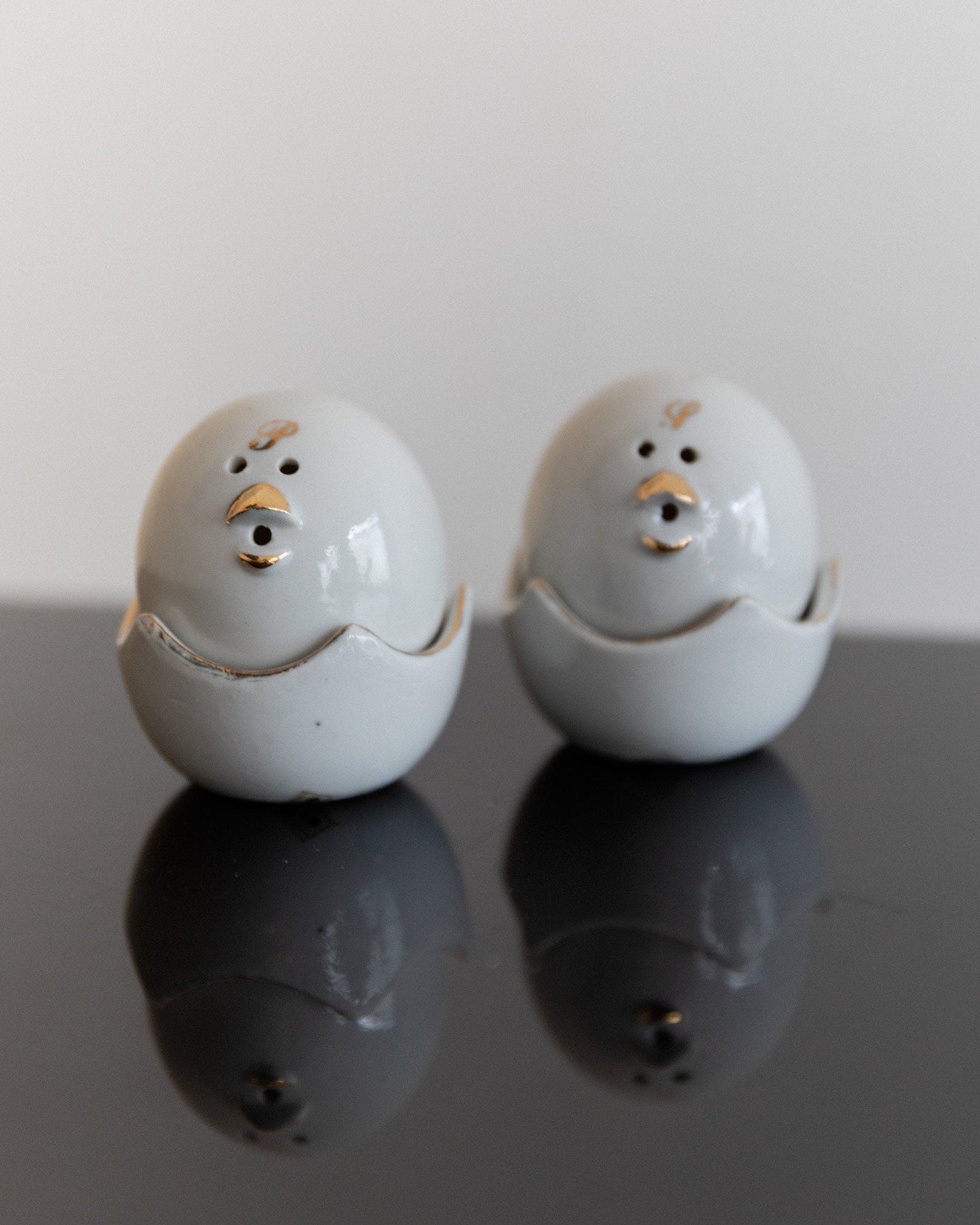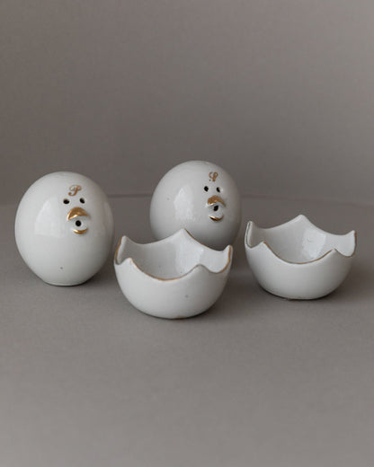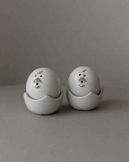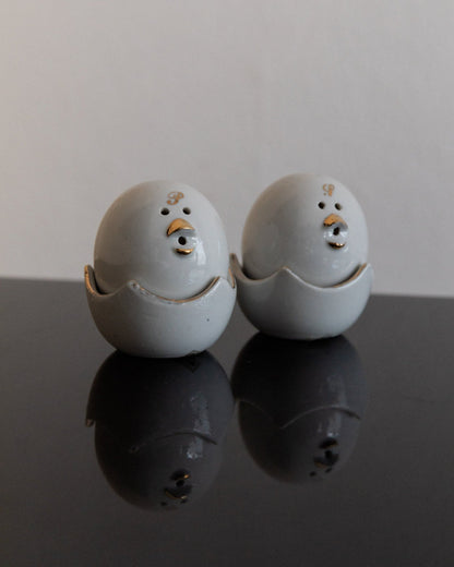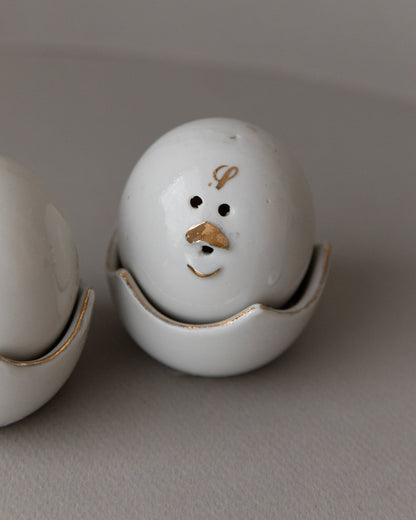 Add a touch of nostalgia and functionality to your table with these charming vintage salt and pepper shakers from the 1960s in a chick motif. The fine workmanship with gold accents and the practical bowls designed like eggshells make these shakers a special eye-catcher. Perfect for stylish table decorations and a great gift idea for lovers of vintage tableware. These design objects in the mid-century modern style are in their original condition and may show signs of wear.
