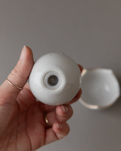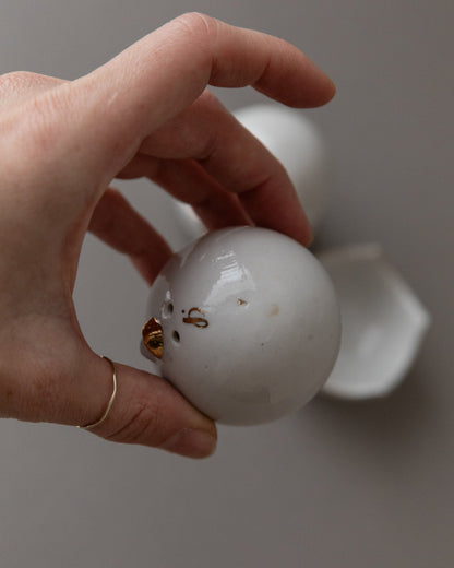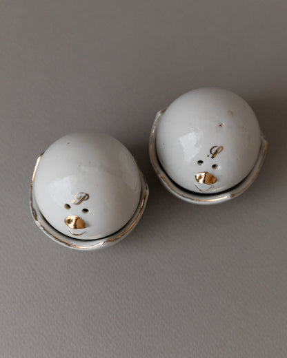 Vintage salt and pepper shaker chick motif white gold with bowl Italy 1960s