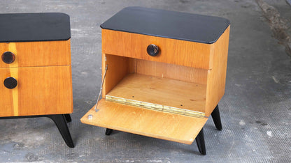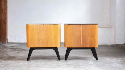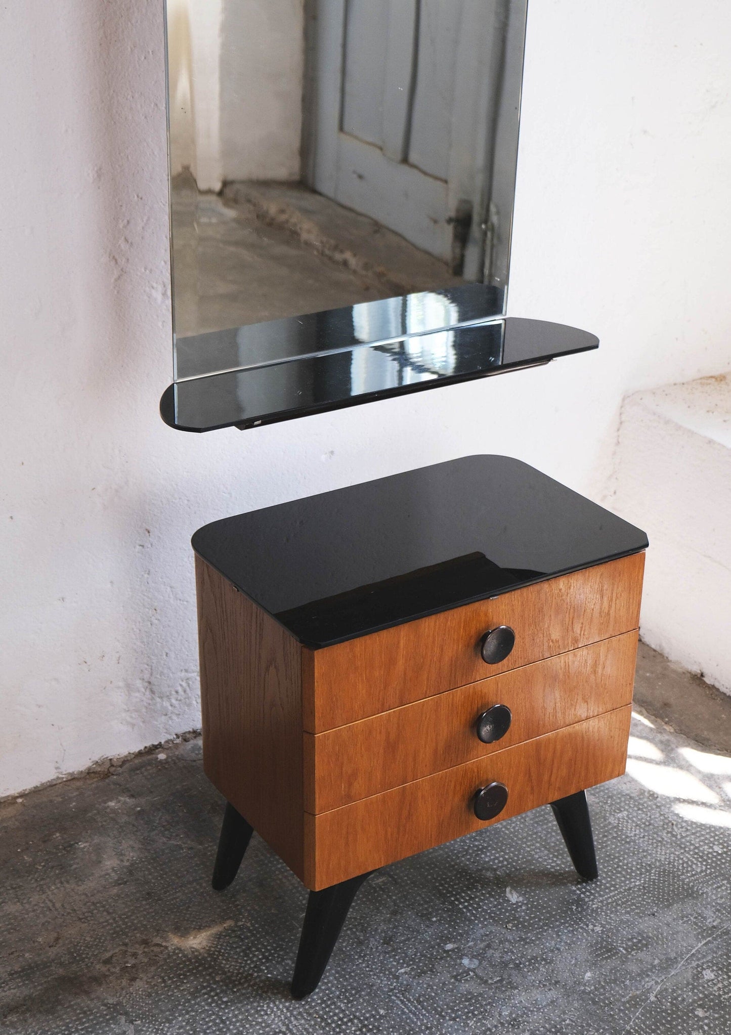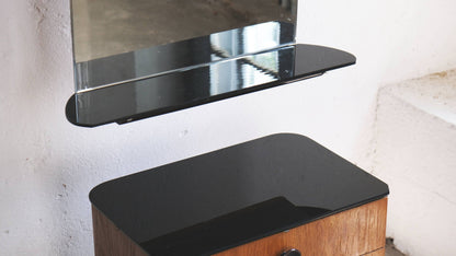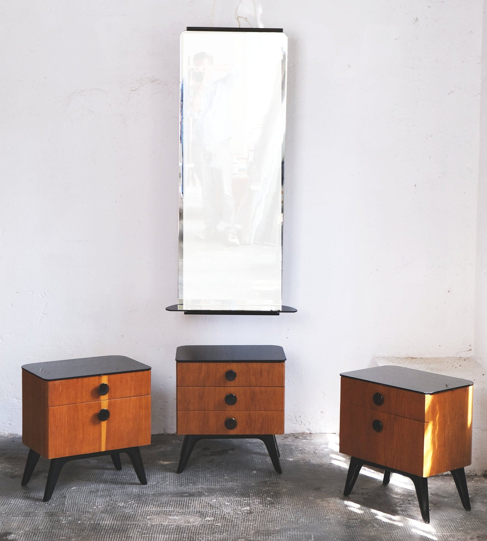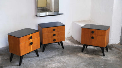 Mid-century bedroom set consisting of two nightstands and a chest of drawers with three drawers, as well as a separate wall-mounted mirror. The black glass shelves show some signs of wear and scratches; the wood surfaces are in very good condition.