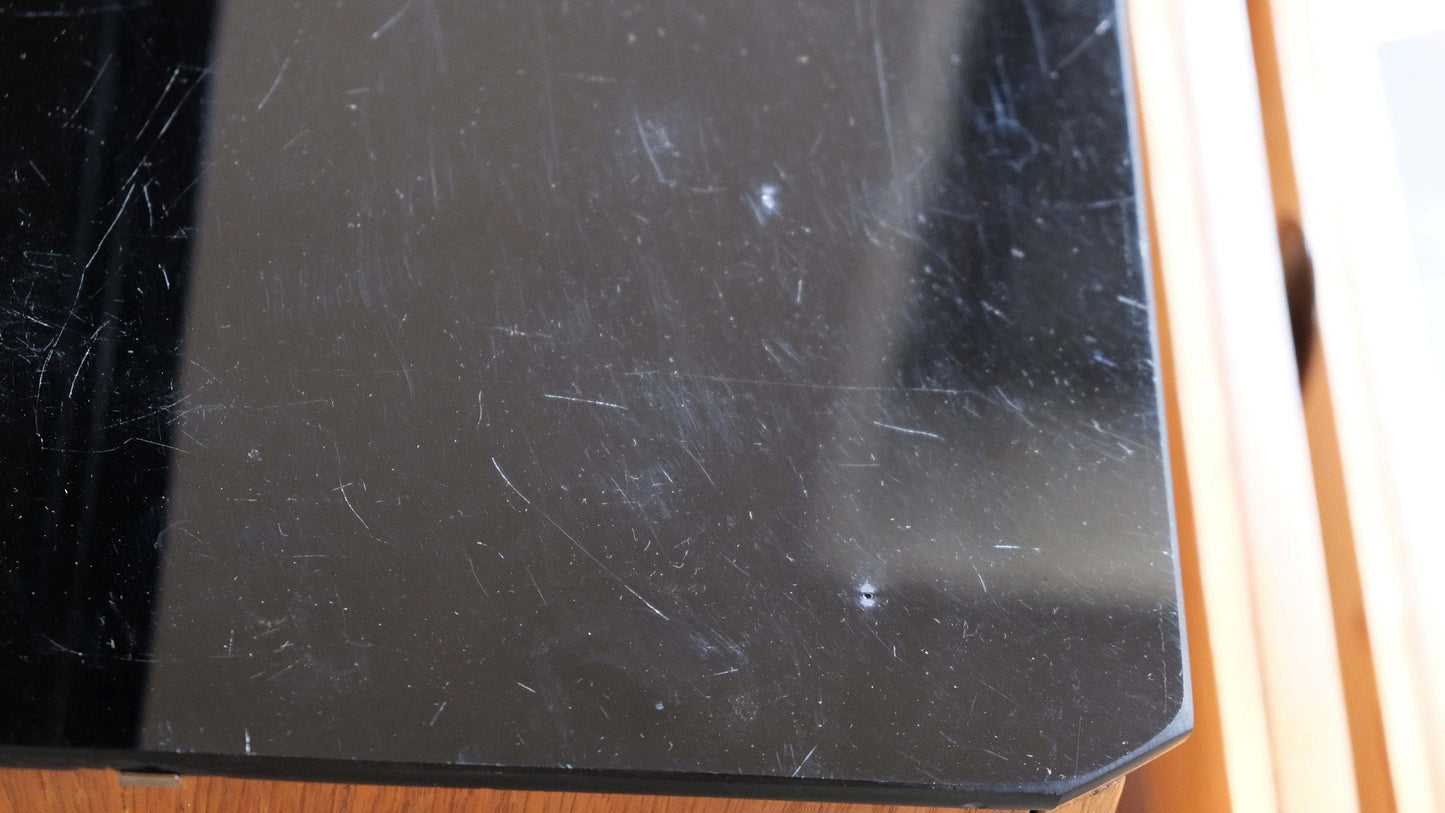 - Condition: Very good quality of the wooden surfaces, slight signs of wear on the black glass plates