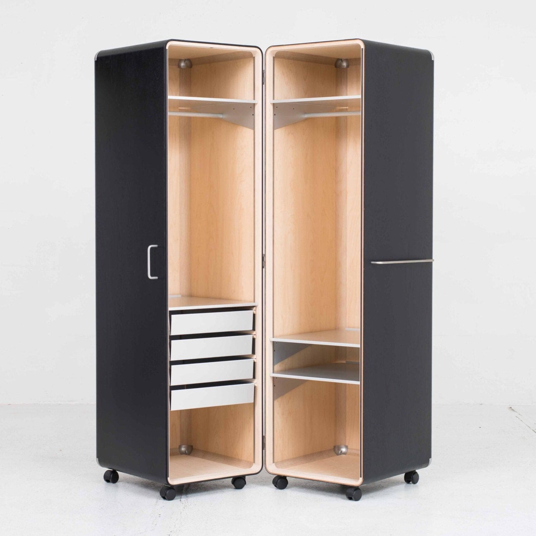 - **Special features:** Castors for easy movement, hinged outer shells, integrated shelves and drawers, clothes rails on both sides